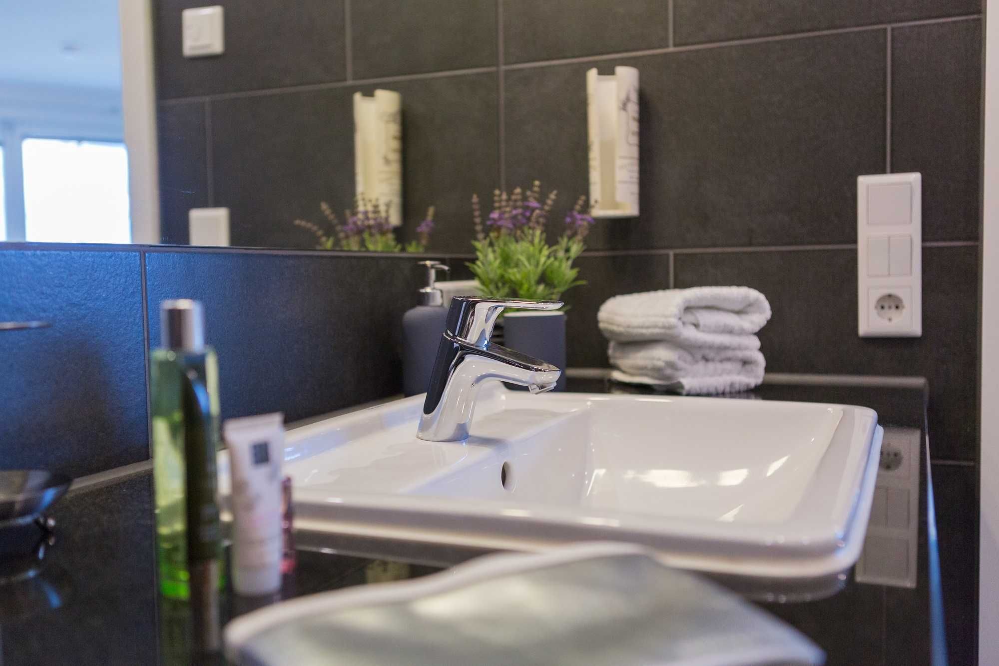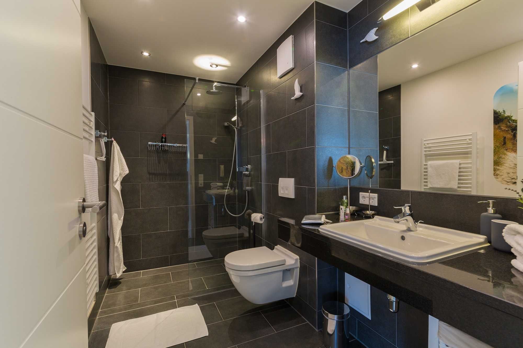 Das Bad ist deckenhoch mit Marmorfliesen gestaltet. Eine Glasabtrennung zum Duschbereich mit großer Kopfdusche sowie der definierte Waschtisch mit großem Spiegel vervollständigen das moderne Design.