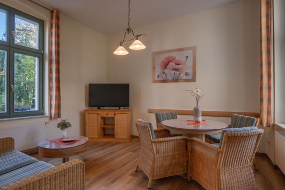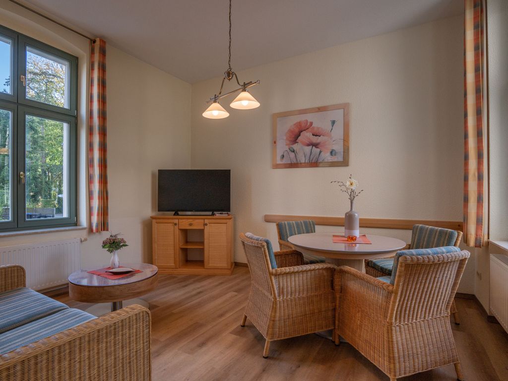 Das 43 qm große Zweiraumappartement im Hochparterre verfügt über separates Schlafzimmer und einen Wohnzimmer mit Sitzgelegenheit und Schlafcouch (Aufbettung für 2 Personen), TV und Radio und Küchenzeile mit Geschirrspüler,