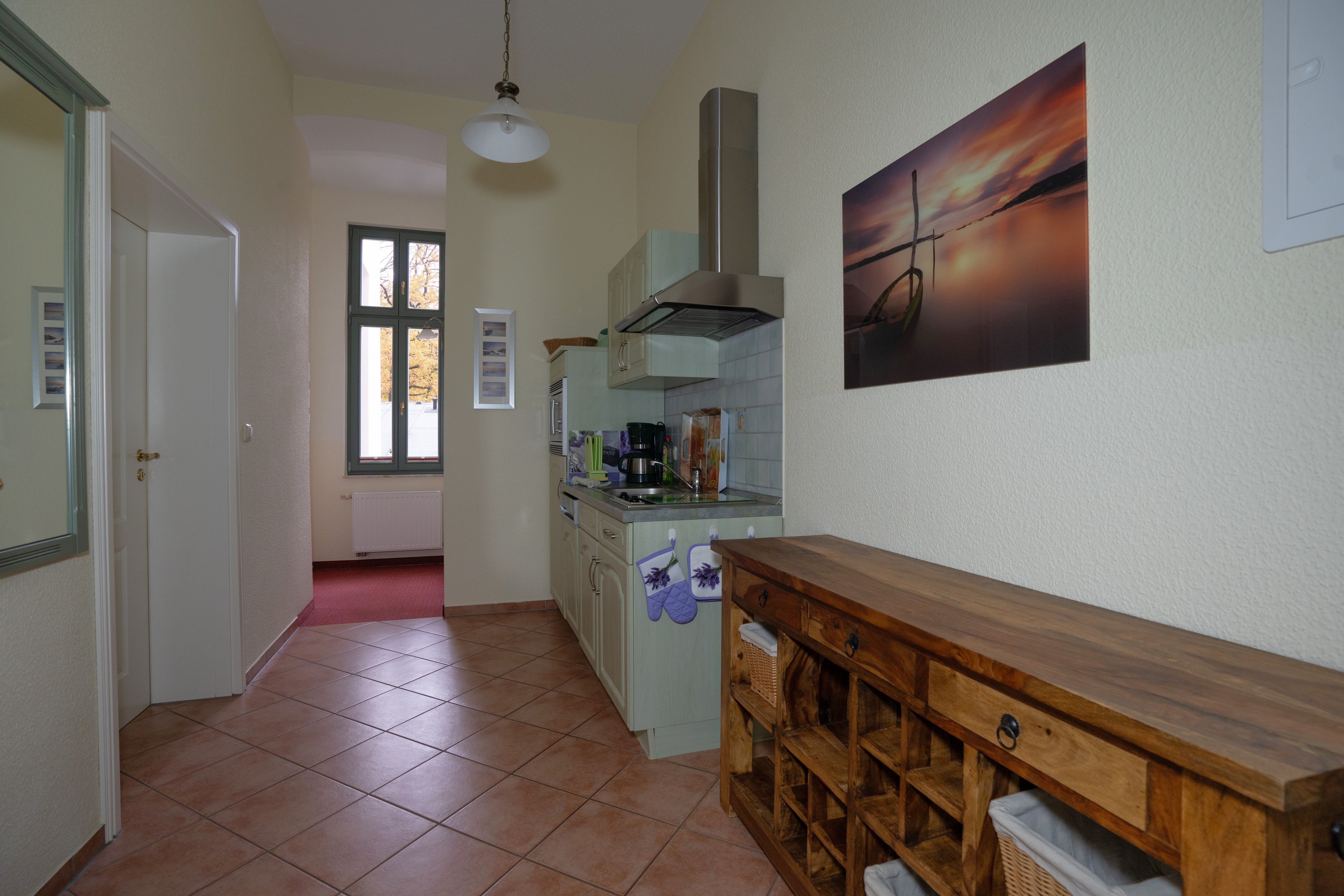 Das 44 qm große Zweiraumappartement im Obergeschoss verfügt über separates Schlafzimmer und einen Wohnzimmer mit Sitzgelegenheit und Schlafcouch (Aufbettung für 2 Personen), TV und Radio und Küchenzeile mit Geschirrspüler,