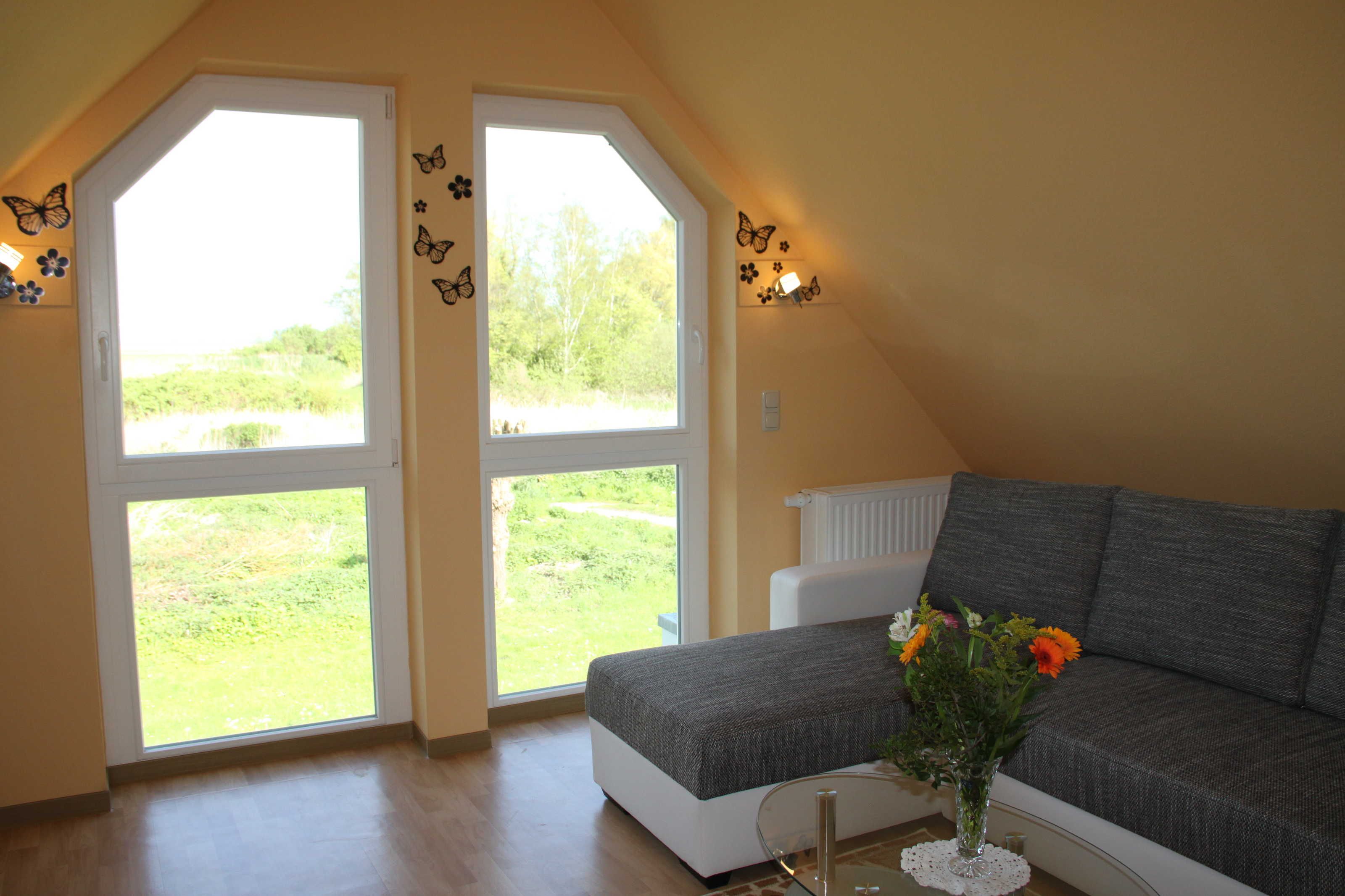 Direkt am Rad- und Wanderweg auf einem großen Grundtsück finden Sie in ruhiger Lage dieses gemütliche, separate Ferienhaus. In wenigen Gehminuten erreichen Sie den Bodden und den Hafen. Aber auch der Strand ist nur 10 Minuten Fußweg entfernt. Das Ferienhaus ist mit einem Wohnzimmer, zwei Schlafzimmern, einer separaten Küche und einem Badezimmer mit Dusche und WC ausgestattet. Ein Schlafzimmer befindet sich im Erdgeschoss, das zweite Schlafzimmer im Obergeschoss. Im Schlafzimmer unten können bis zu 3 Personen schlafen. Die Betten im Zimmer können getrennt werden. Für die 3. Person im Schlafzimmer wird ein Zustellbett bereit gestellt. In der voll ausgestatteten Küche finden Sie ebenfalls einen Essplatz. Bei schönem Wetter können Sie die eigene Terrasse am Haus benutzen. Im Preis enthalten sind Bettwäsche und Handtücher.