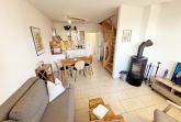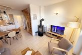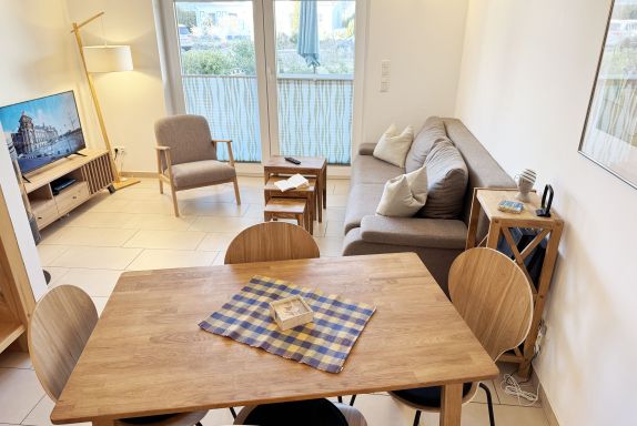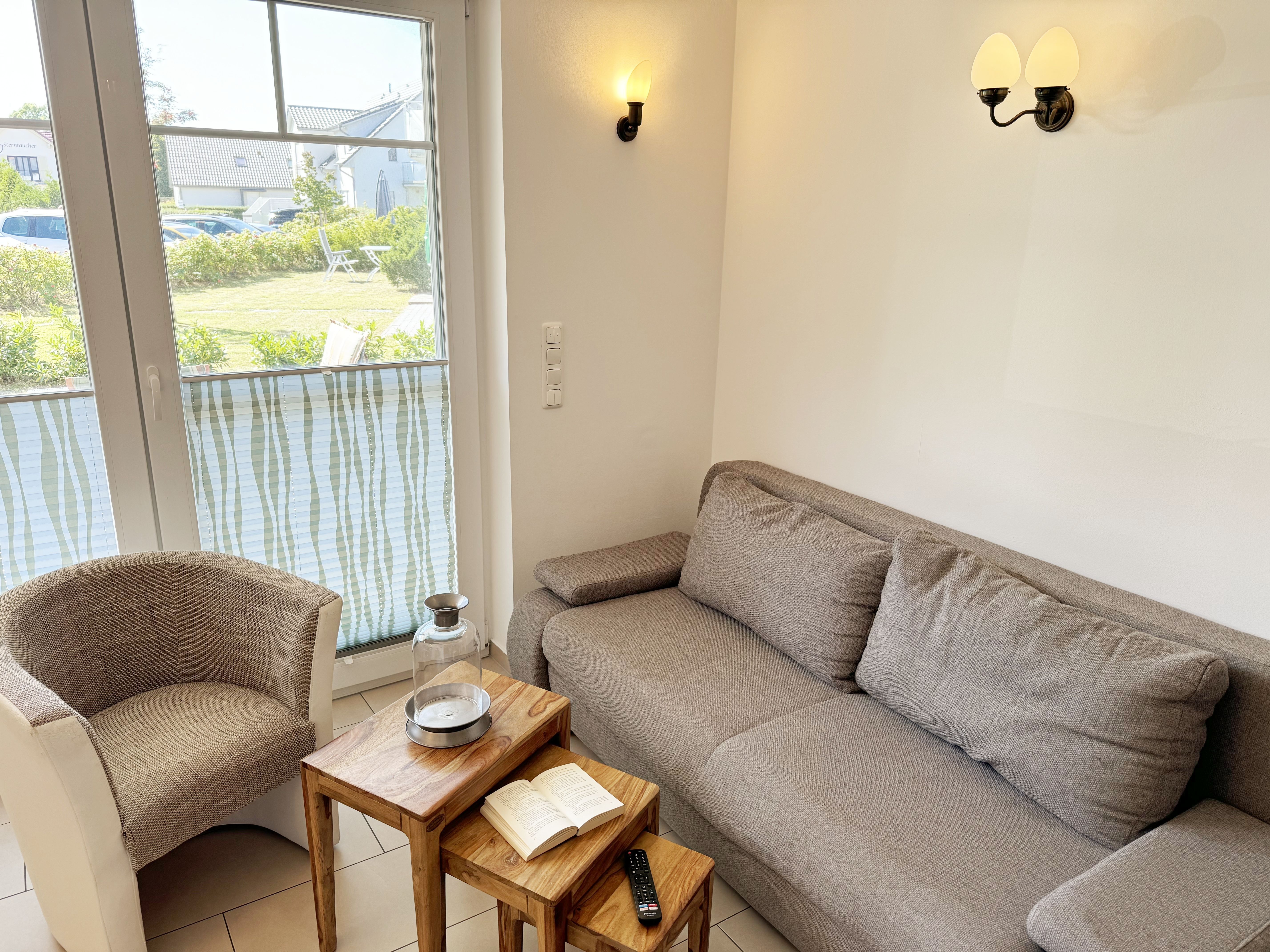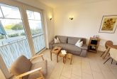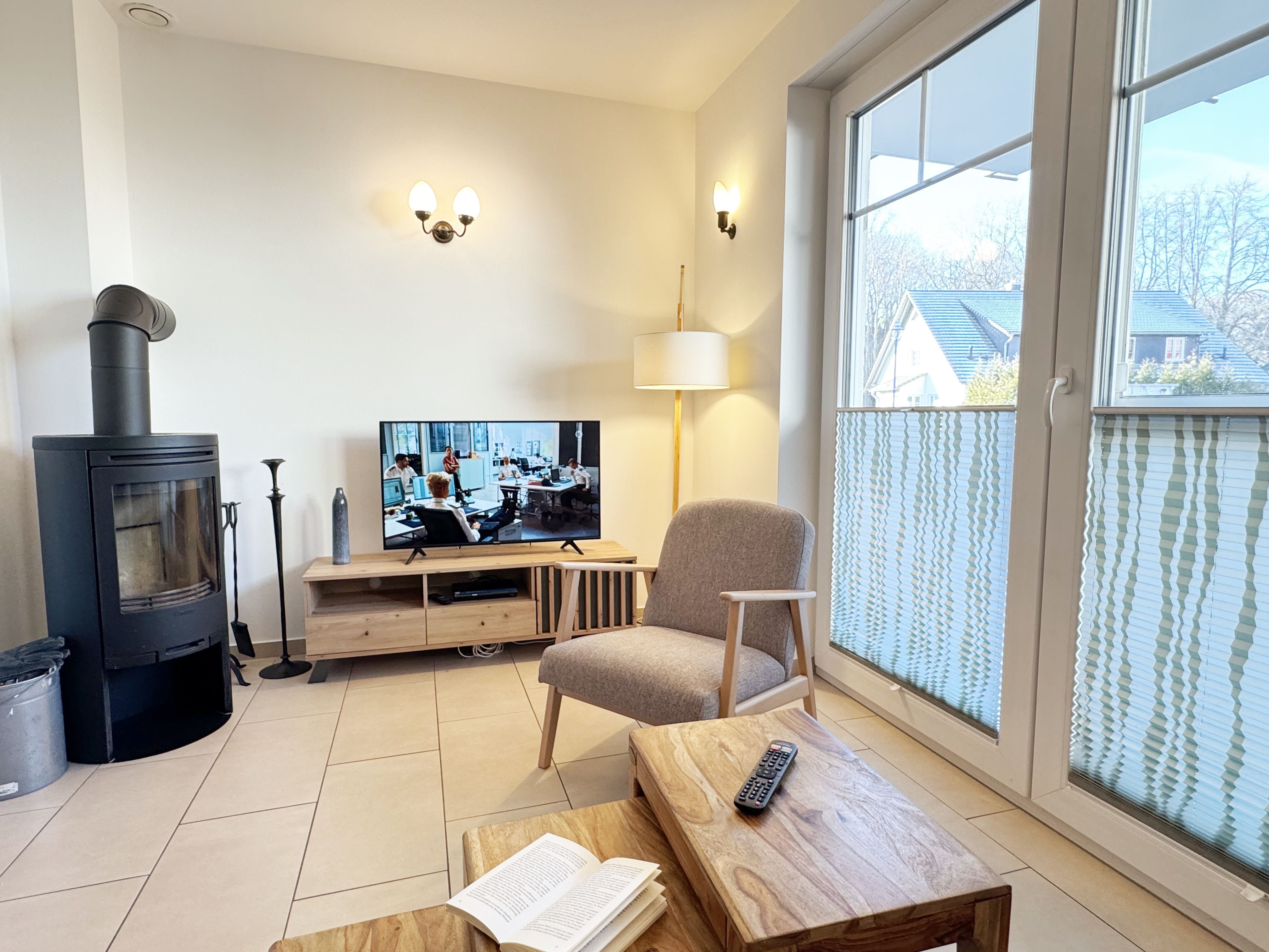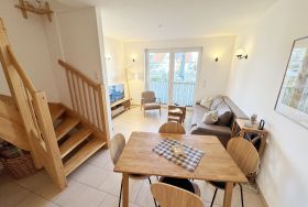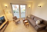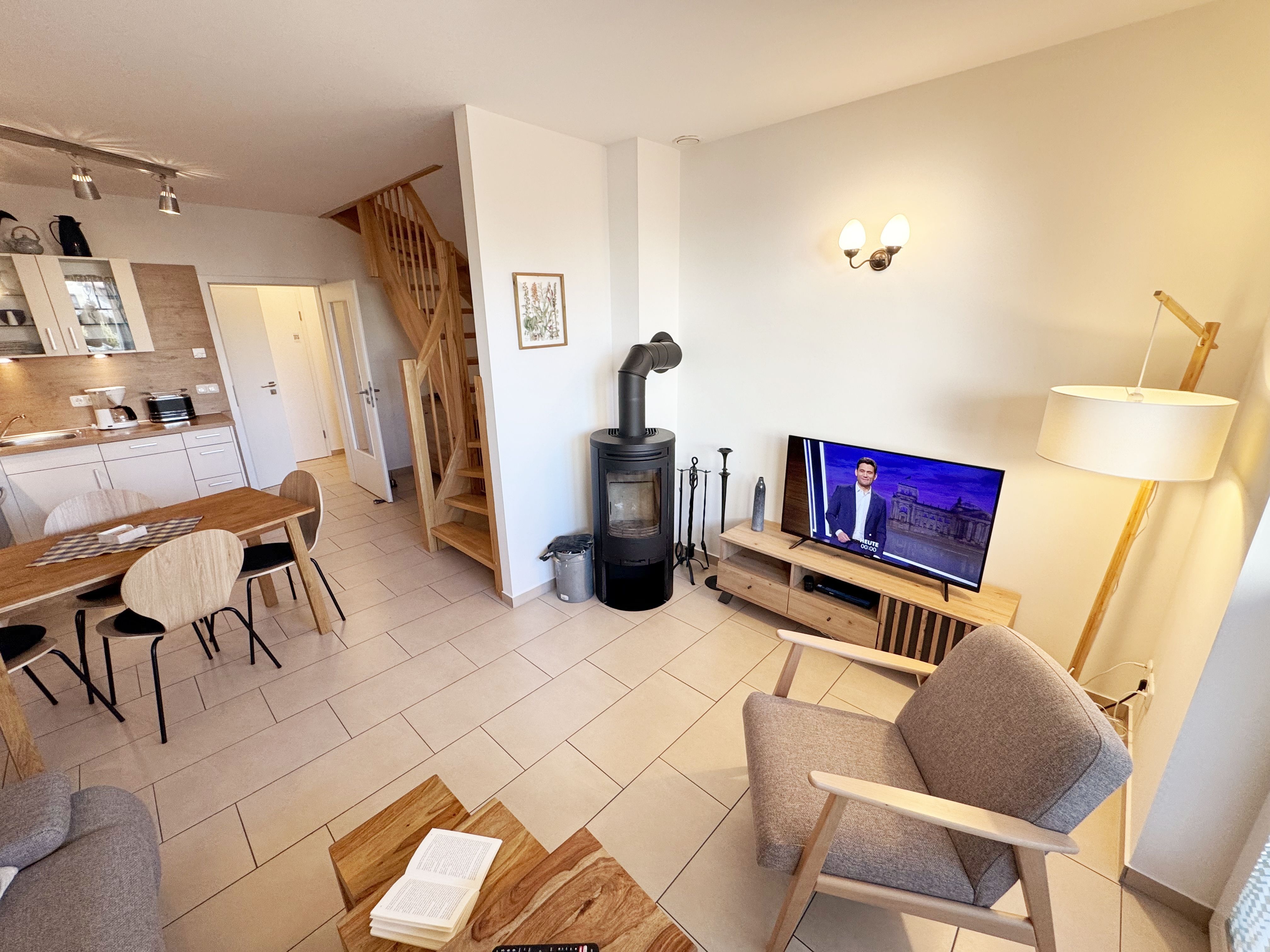 Im Haus „Möwe“ befindet sich die helle und gemütliche Zweizimmerwohnung (Nichtraucher) im Erdgeschoss und ist vom Privatparkplatz bequem zu erreichen. Die Maisonette Wohnung Nr. 02 verfügt auf 56 qm über allen Komfort, den man von zuhause gewöhnt ist und ist für 2 bis 4 Personen ausgerichtet. Von einem kleinen Flur mit Garderobe gelangt man in den hellen unteren Bereich der Wohnung. Sogleich fällt der Blick auf die geräumige Terrasse (westliche Ausrichtung), die mit einer Sitzgruppe + Sonnenliege für vier Personen und einem Sonnenschirm zum ruhigen Verweilen einlädt. Die gesamte untere Etage ist gefliest und mit einer Fußbodenheizung ausgestattet. Der untere Wohnbereich verfügt über eine bequeme Couch (1,50m x 2,00m), die auch als zusätzliche Schlafgelegenheit genutzt werden kann. Ein bequemer Sessel mit Leselampe vervollständigt das Ensemble. Kleine Beistelltische bieten immer eine Ablage, sodass man bei einem Kaffee oder einem Glas Wein eine entspannte Unterhaltung führen kann. Für die kälteren Tage ist ein Kaminofen vorhanden, der durch ein Sichtfeld das Kaminfeuer betrachten lässt. Je nach Bedarf kann man eine Stereoanlage nutzen, die neben Radio und CD-Laufwerk auch die Möglichkeit bietet, die eigene Musik vom iPod oder einem USB-Stick abzuspielen. Mit dem TV-Flat Screen mit DVD-Player kann man ruhig mal einen kleinen Filmabend gestalten. Um die Sache abzurunden, befindet sich in der Holzkommode eine reichhaltige DVD-Sammlung mit bekannten Filmen, die für Jung und Alt sicherlich etwas zu bieten hat. Auch im Urlaub brauchen Sie auf einen Internetanschluss (WLAN) nicht verzichten. Dieser ist für Sie inklusive. Die Küchenzeile lässt keine Wünsche offen. Neben einem Kühlschrank mit Gefrierfach und einem Kochherd mit Ceranfeld und Backofen sind alle Dinge vorhanden (Kaffeemaschine, Wasserkocher, Toaster, Mikrowelle) die man zur Zubereitung eines leckeren Mahls nach dem Strandaufenthalt benötigt. Damit man sich nicht dem Leid des Abwaschens im Urlaub hingeben muss, kann man den eingebauten Geschirrspüler nutzen, der für einen die Arbeit leise und unaufdringlich erledigt. Der Essbereich ist mit einem Tisch ausgestattet, an dem bis zu vier Personen Platz finden. Über eine Holztreppe gelangt man in die erste Etage. Dort befindet sich das innenliegende Bad mit Dusche und WC, Spiegelschrank und Fön. Um auf den Balkon zu kommen, durchschreitet man das Schlafzimmer. Der Raum ist wie das gesamte Stockwerk mit einem hellen Holzfußboden ausgelegt und eine Fußbodenheizung sorgt zu jeder Jahreszeit für ein angenehmes Klima. Für die persönlichen Sachen steht ein Kleiderschrank zur Verfügung. Jeweils an den Seiten des großen Doppelbettes (einzelne Matratzen á 0,90 m) für zwei Personen befinden sich Nachttischkonsolen mit Nachttischlampen. Sollten Sie ihre Urlaubslektüre vergessen haben, sind einige Angebote in der Wohnung zu finden. Durch die elektrischen Rollos, die sich im unteren und im oberen Stockwerk befinden, genügt ein Knopfdruck, um eine ungestörte Nacht zu verbringen, bzw. am Morgen die Sonne ins Zimmer zu lassen. Fahrräder kann man in einem abschließbaren Schuppen Nr.02, der sich in unmittelbarer Nähe des Hauses befindet, unterstellen. Ein PKW-Stellplatz Nr. 02 befindet sich direkt am Haus. Gegen eine Gebühr haben wir keine Probleme mit 1 Haustier, wenn dies gut erzogen ist! Die Erstausstattung eines Wäschepaketes (komplette Bettwäsche, 1 Duschhandtuch, 2 kleine Handtücher) können Sie bis 14 Tage vor Anreise gegen einen Aufpreis dazu buchen oder durch eigene ergänzen. Ab 2 gebuchten Paketen erhalten Sie einmalig 1 Geschirrhandtuch und 1 Duschvorleger hinzu.