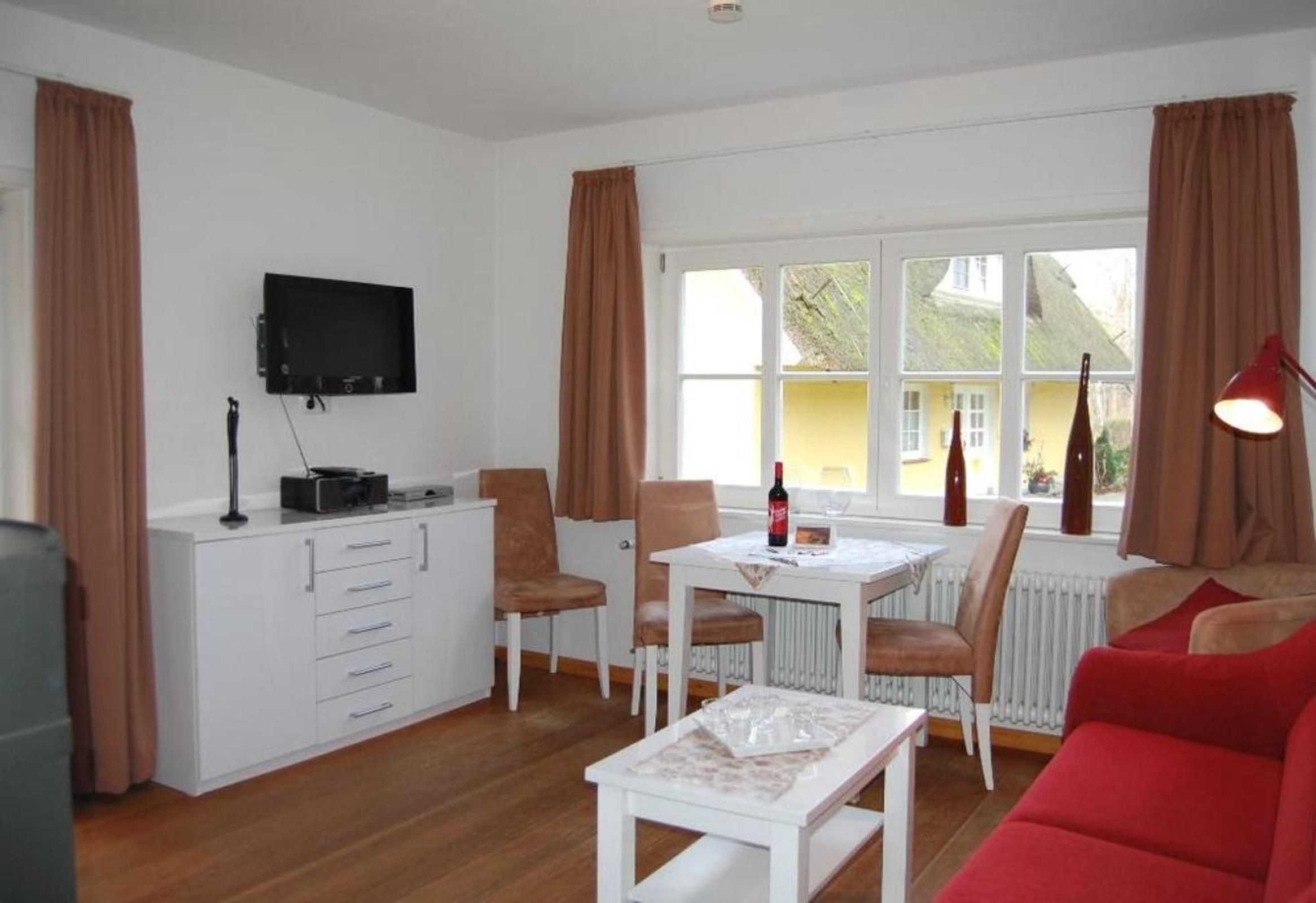 Das kleine Reetdachhaus bietet mit ca. 44 m² Wohnfläche auf zwei Etagen Raum für einen gemütlichen Urlaub für zwei bis drei Personen. Auf der Terrasse im Grünen kann man das schöne Wetter genießen oder den Abend angenehm ausklingen lassen. Das Ferienhaus ist freistehend und somit bestens für einen Strandurlaub auch mit Kindern geeignet. Hunde sind auf dem Grundstück leider nicht erwünscht. Im Erdgeschoss befindet sich der Wohnraum mit einem Kaminofen. Neben einer separaten Küchenzeile mit Vollausstattung liegt das Duschbad mit Fußbodenheizung.