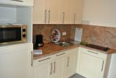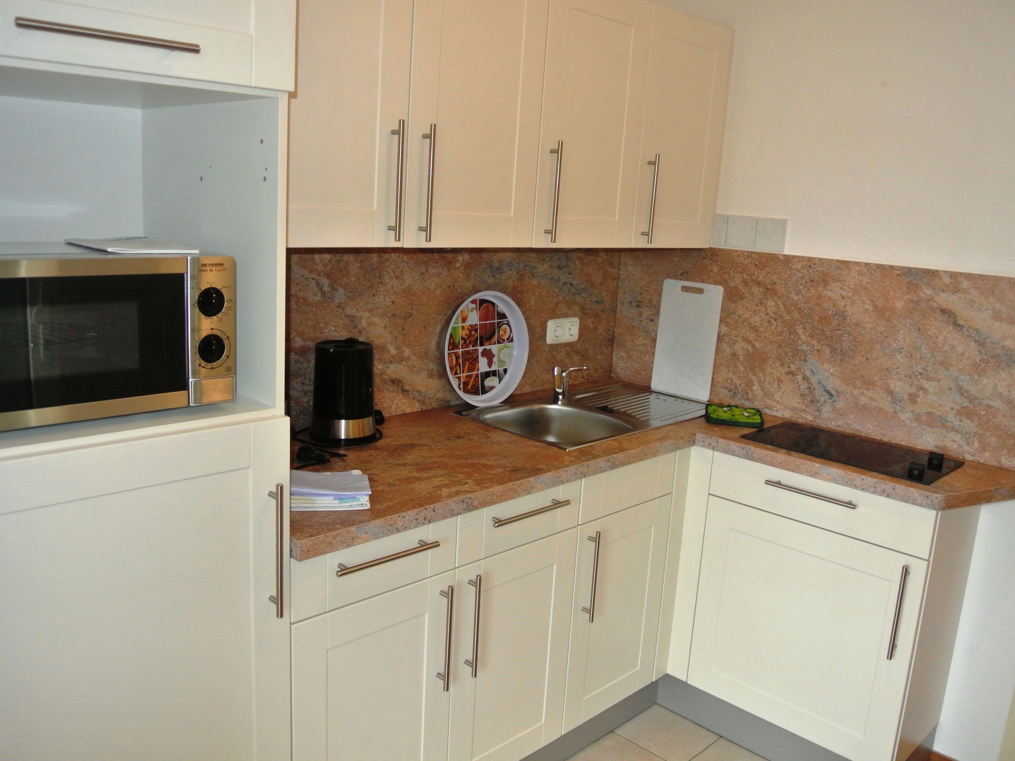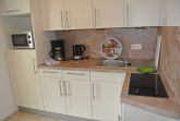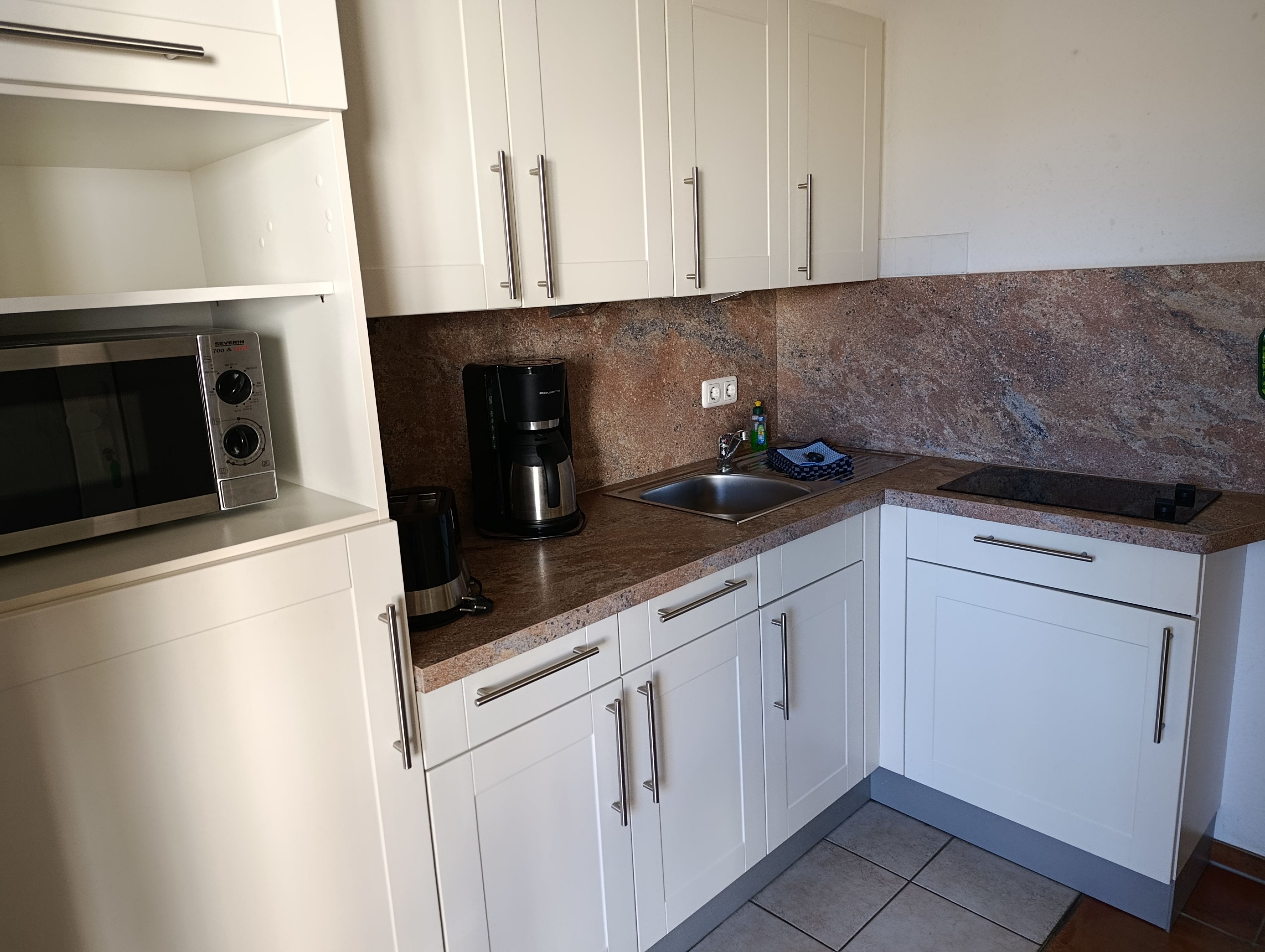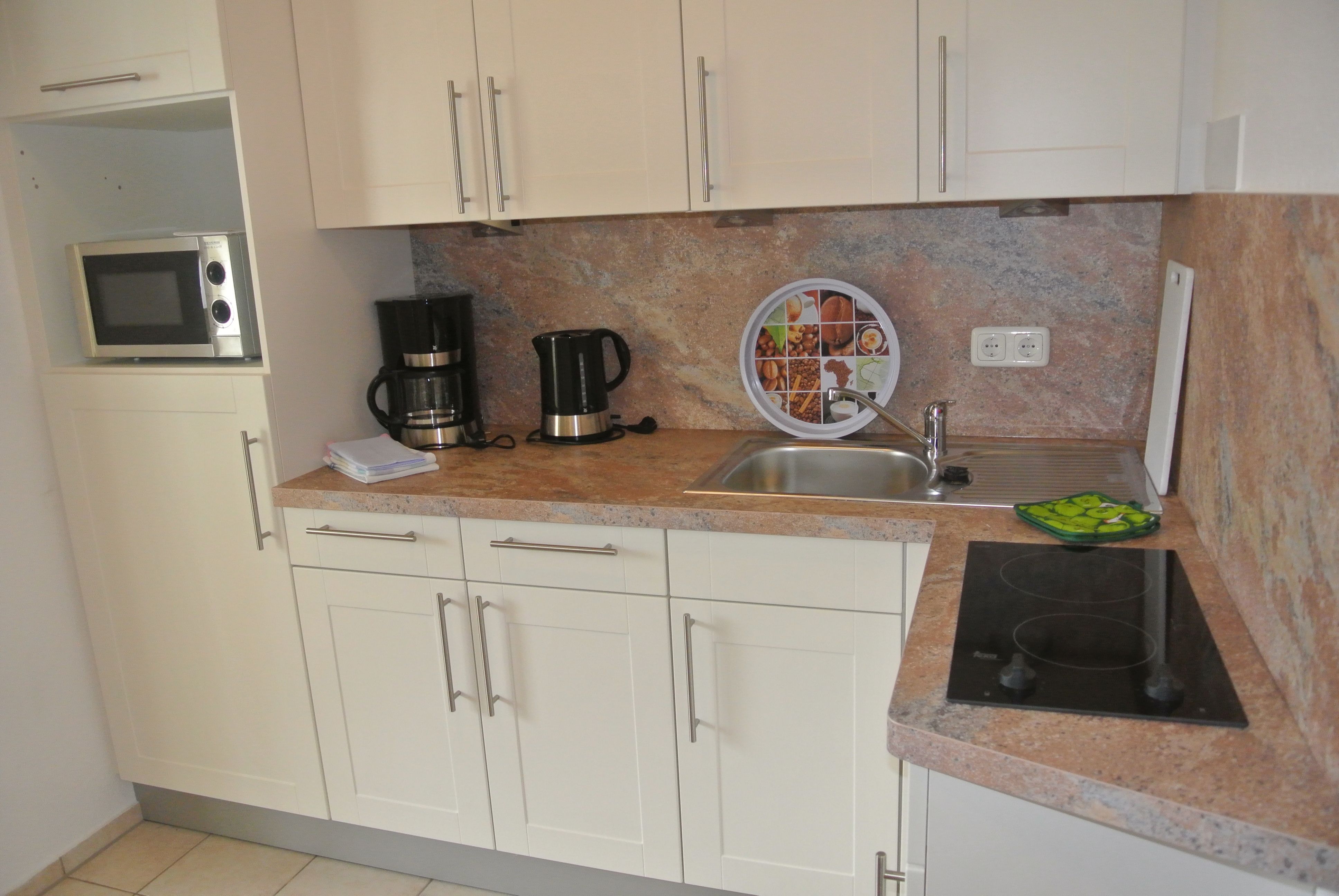 Küchenzeile mit 2-Platten-Ceranfeld, Kühlschrank mit Gefrierfach, Mikrowelle, Wasserkocher und Kaffeemaschine