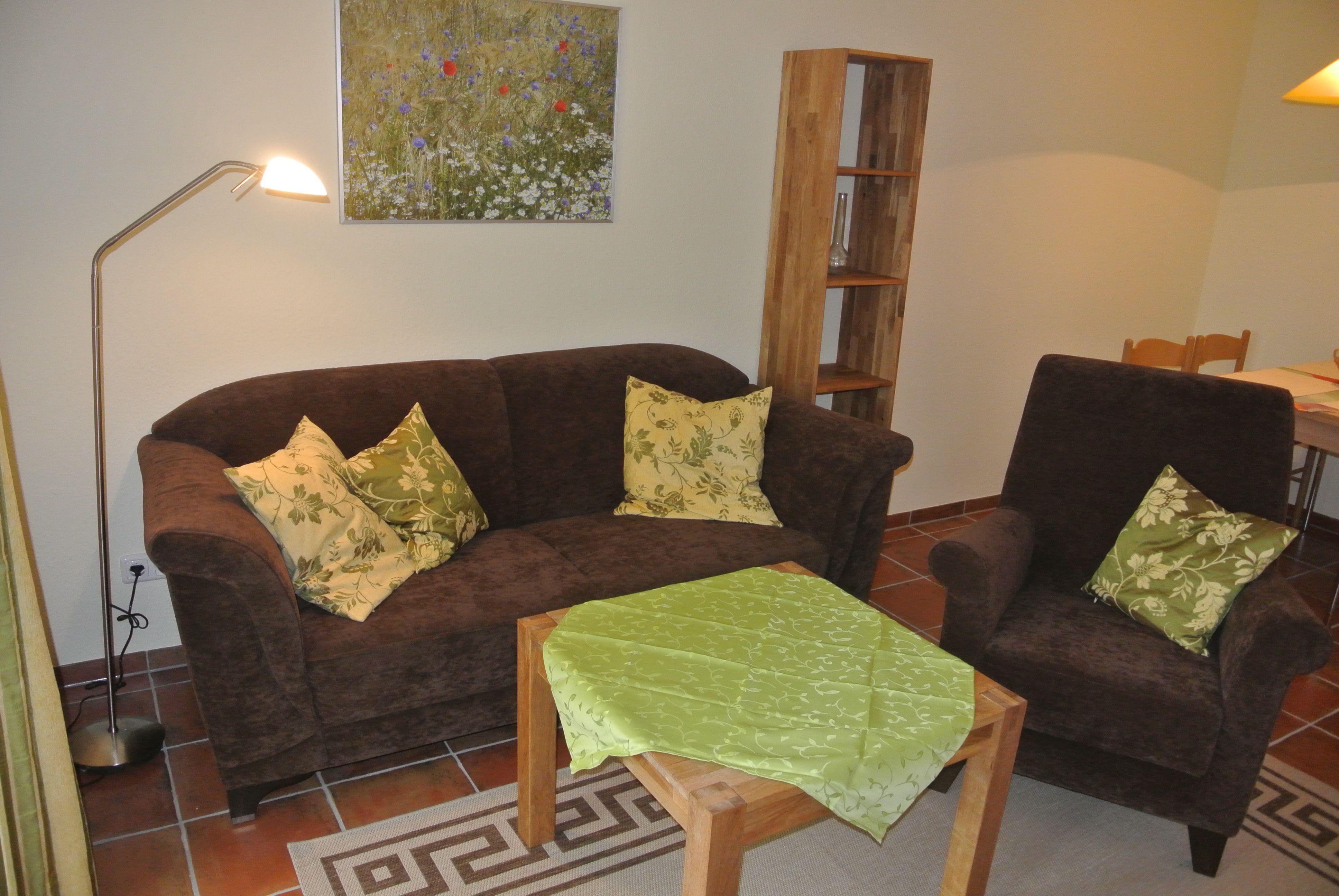 Wohnzimmer mit Couch, Sessel, Anrichte mit Kabel-TV und Radio mit CD-Player und Essecke mit Tisch und Stühle