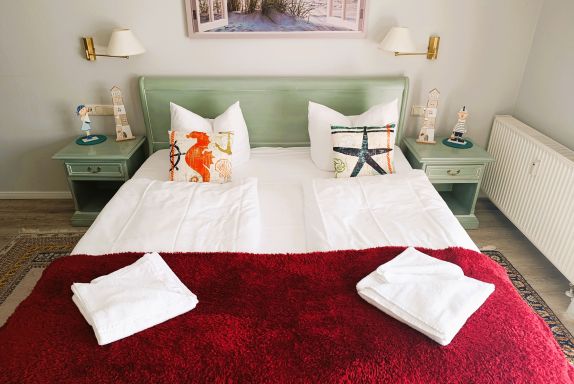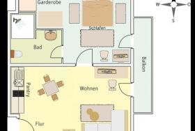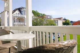 Nur 150 m vom Strand wohnen Sie in einer 2-Raum-Ferienwohnung. Die 40 qm große Wohnung liegt in der ersten Etage. Das Wohnzimmer ist mit einer Couch, Couchtisch, Sessel, Anrichte, mit Kabel-TV (Flachbildschirm), Radio, Essbereich (Tisch und Stühle) und Küchenzeile ausgestattet. Der Balkon mit Tisch und Stühle geht zur Ostseite. Im Schlafzimmer stehen ein Doppelbett und eine kleine Anrichte. Die Küchenzeile wurde ausgestattet mit Mikrowelle, Kühlschrank, Kaffeemaschine, Zwei-Platten-Kochfeld, Toaster und Wasserkocher. Das Bad mit Dusche und WC komplettiert die Wohnung.