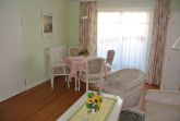 Nur 150 m vom Strand wohnen Sie in einer 2-Raum-Ferienwohnung. Die 51 qm große Wohnung liegt in der ersten Etage. Das Wohnzimmer ist mit einer Couch, Couchtisch, Sessel, Anrichte, mit Kabel-TV (Flachbildschirm), Radio, Essbereich (Tisch und Stühle) und Küchenzeile ausgestattet. Der Balkon mit Tisch und Stühle geht zur Westseite. Im Schlafzimmer stehen ein Doppelbett und eine kleine Anrichte. Die Küchenzeile wurde ausgestattet mit Mikrowelle, Kühlschrank, Kaffeemaschine, Zwei-Platten-Kochfeld, Toaster und Wasserkocher. Das Bad mit Dusche und WC komplettiert die Wohnung.