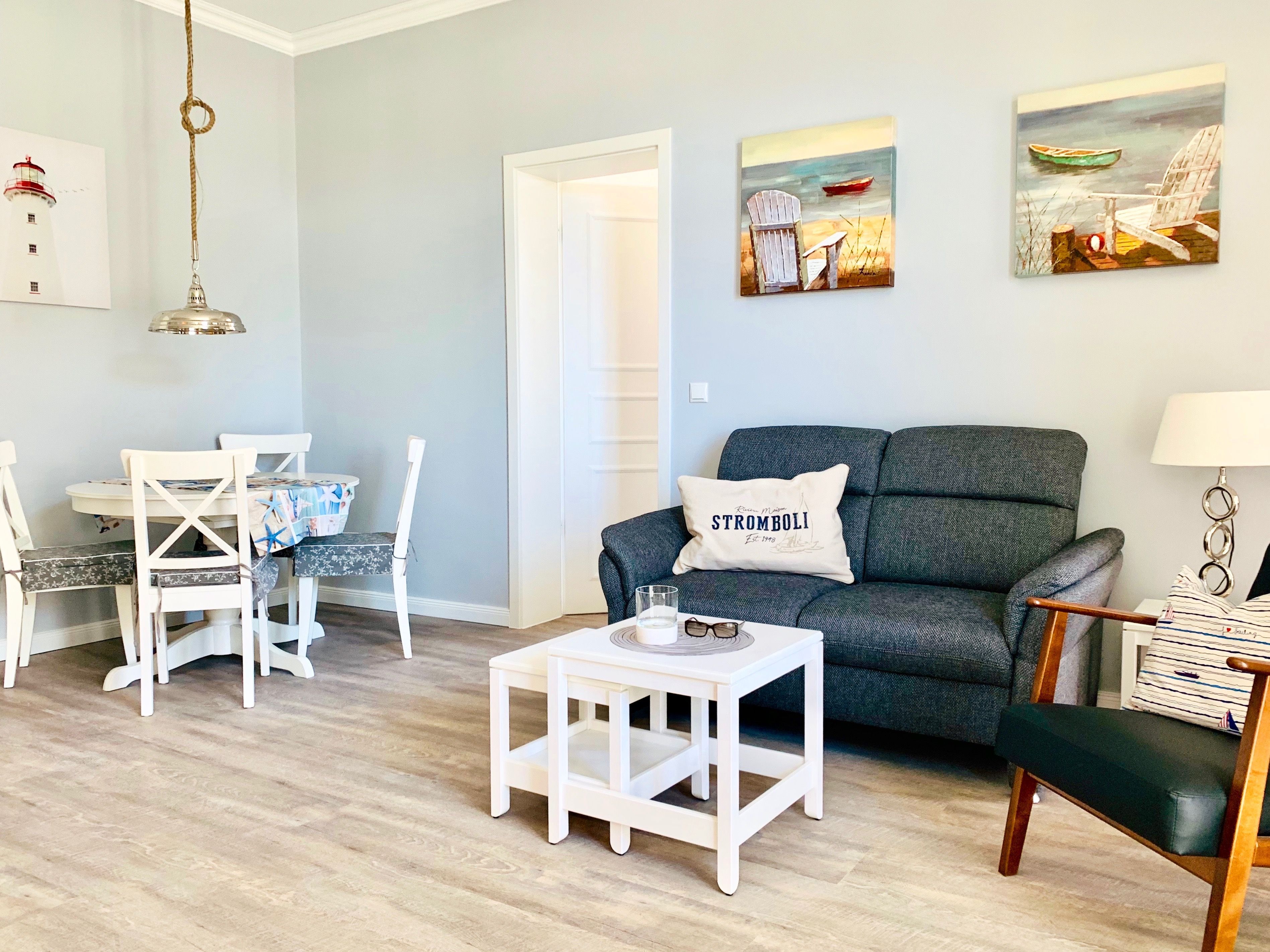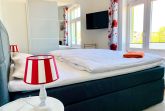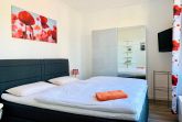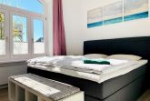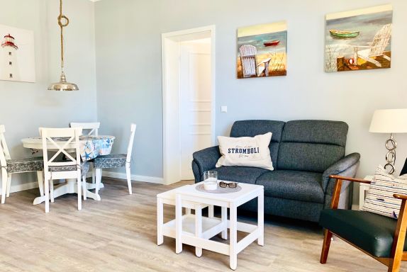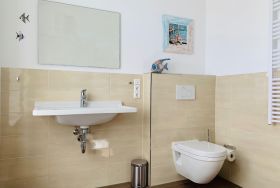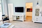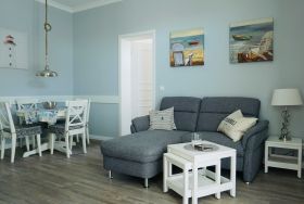 Nur 150 m vom Strand wohnen Sie in einer 3-Raum-Ferienwohnung. Die 58 qm große Wohnung liegt in der ersten Etage. Das Wohnzimmer ist mit einer Couch, Couchtisch, Sessel, Anrichte, mit Kabel-TV (Flachbildschirm), Radio, Essbereich (Tisch und Stühle) und Küchenzeile ausgestattet. Im Schlafzimmer stehen ein Doppelbett und eine kleine Anrichte. Die Küchenzeile wurde ausgestattet mit Mikrowelle, Kühlschrank, Kaffeemaschine, Zwei-Platten-Kochfeld, Toaster und Wasserkocher. Die 2 Bäder mit ebenerdiger Dusche und WC komplettieren die Wohnung.