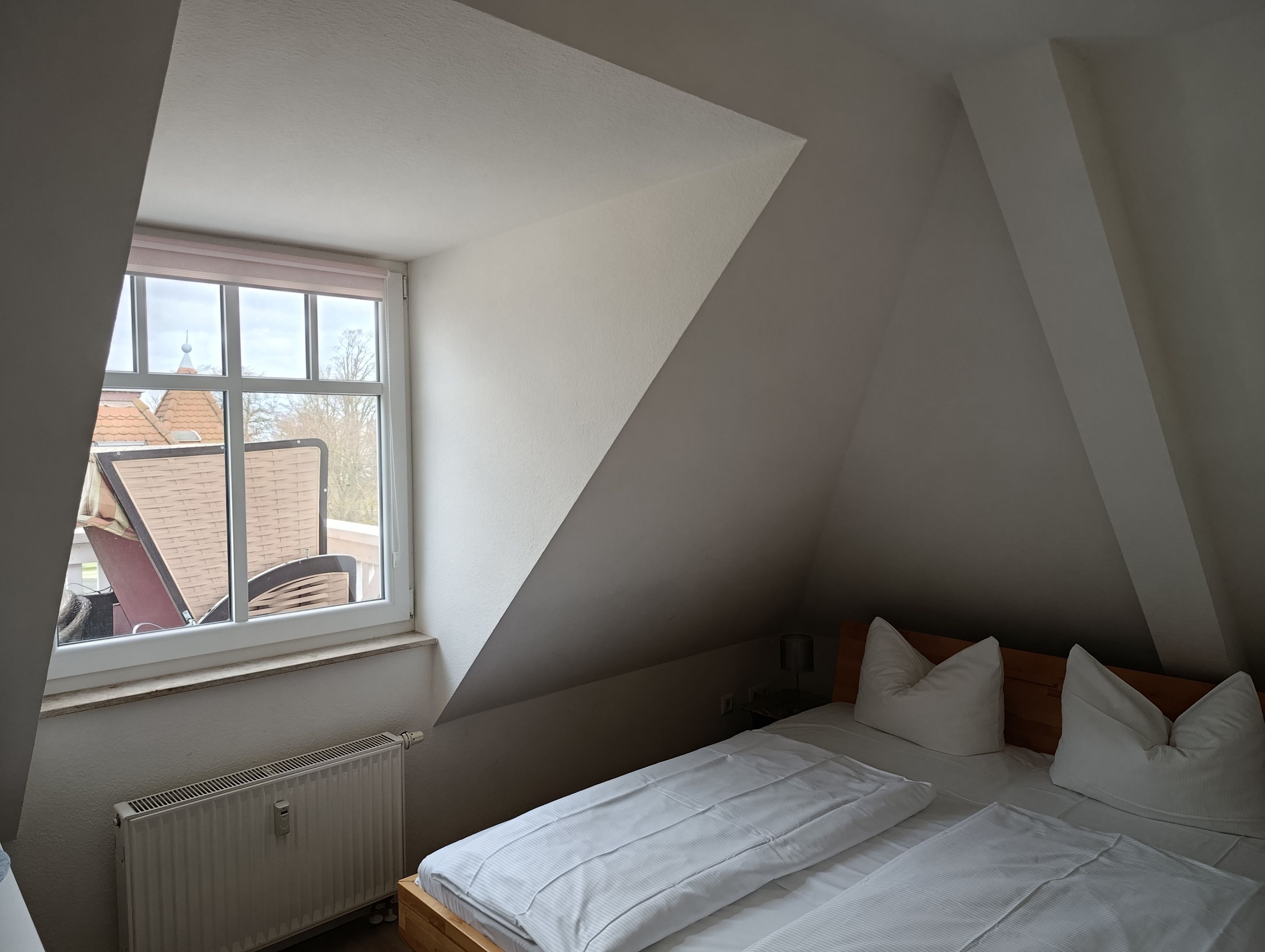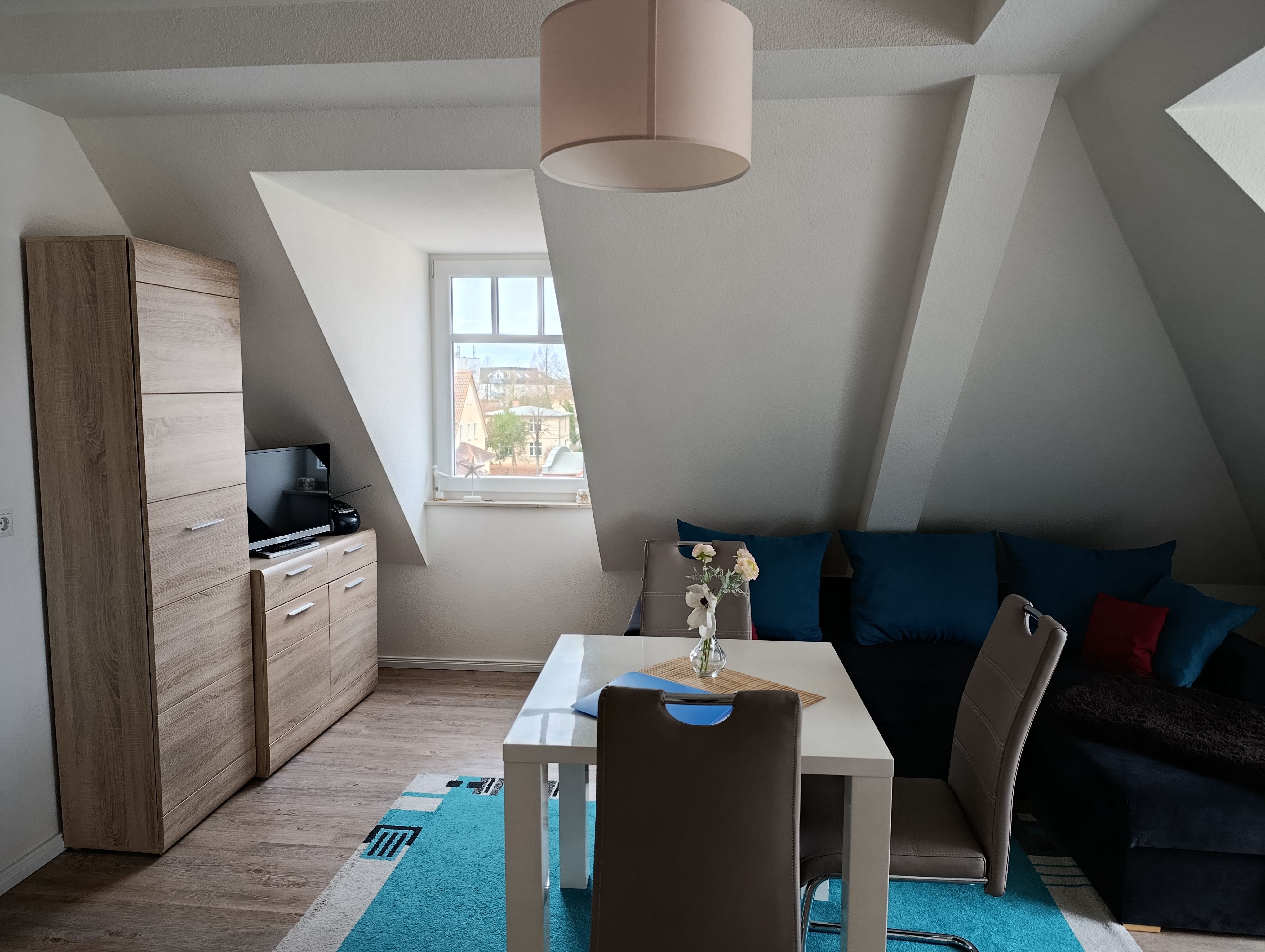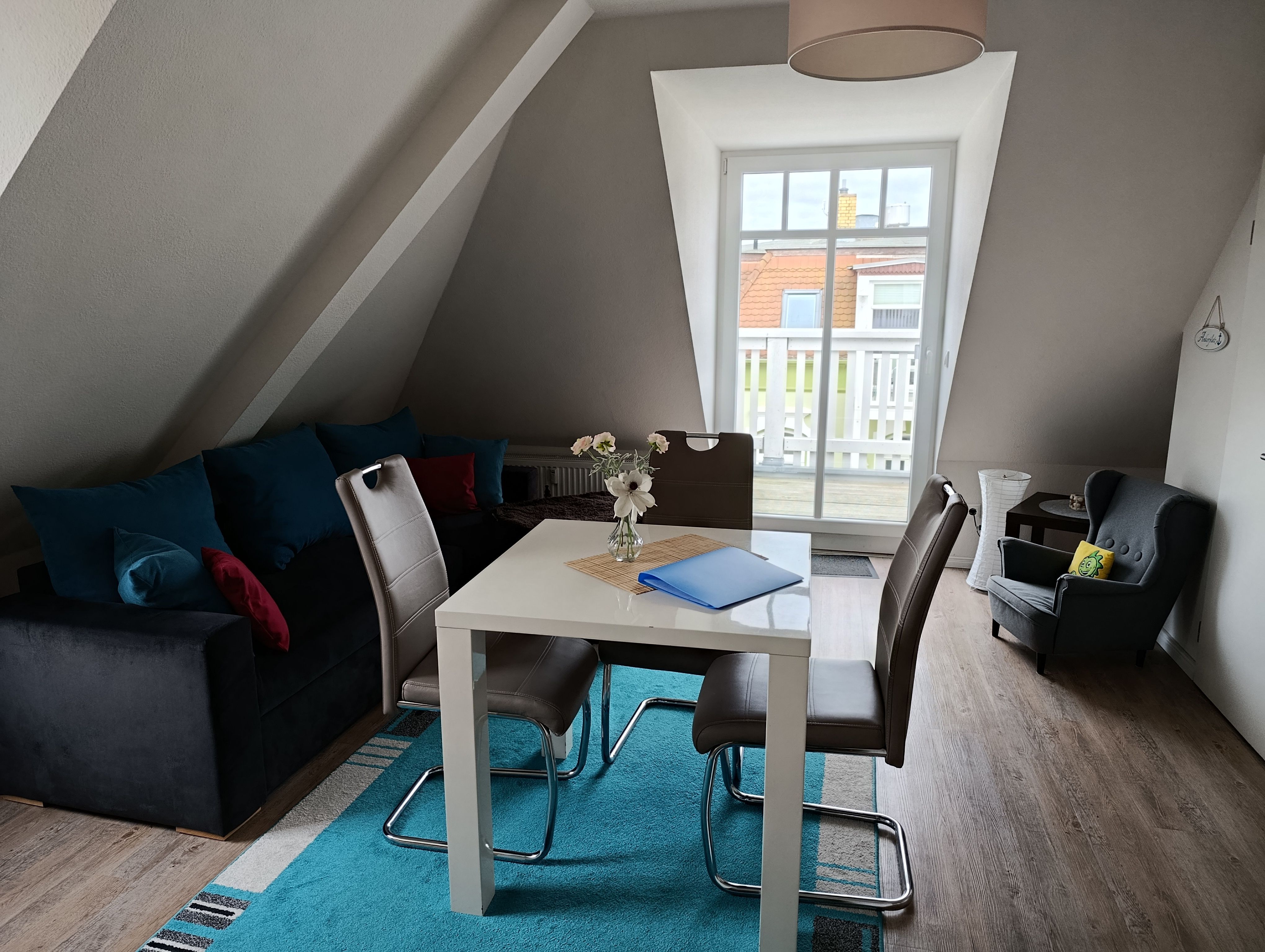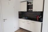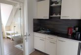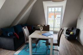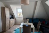 Die zeitgemäß gestaltete Ferienwohnung in der 3. Etage hat einen offenen Wohnbereich mit Küchenzeile und Essbereich, ein Schlafzimmer mit Doppelbett und einen Balkon. Die funktionale Küchenzeile ist mit 2-Platten-Ceranfeld, Kühlschrank, Kaffeemaschine und div. Geschirr ausgestattet. Ein Bad mit ebenerdiger Dusche, Waschtisch und WC komplettieren den sehr guten Gesamteindruck der Wohnung.