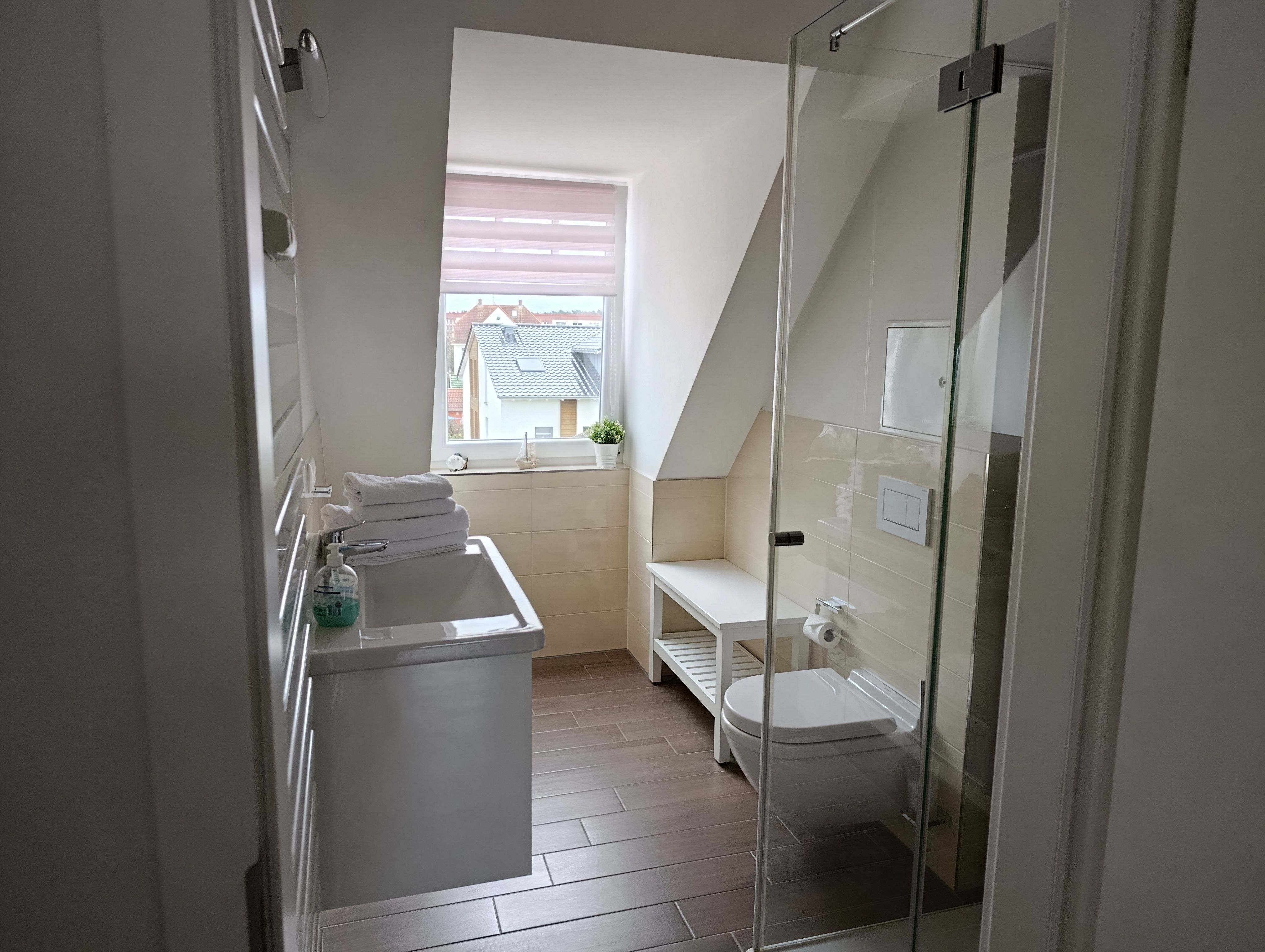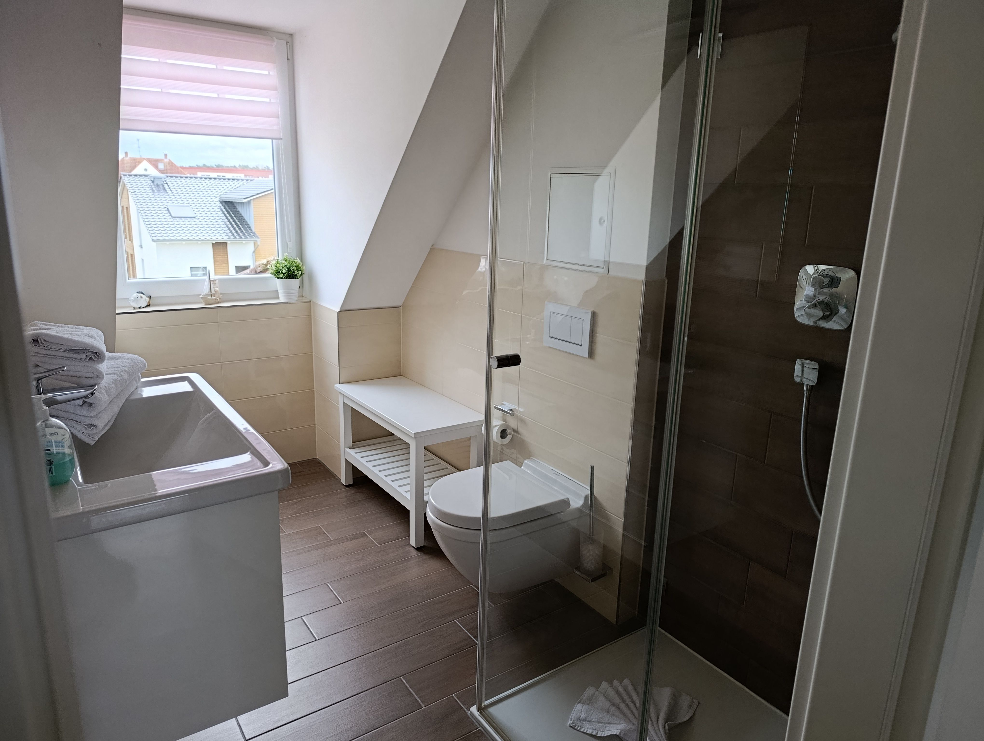 Bad mit ebenerdiger Dusche, WC, Waschbecken, Spiegel und Fenster