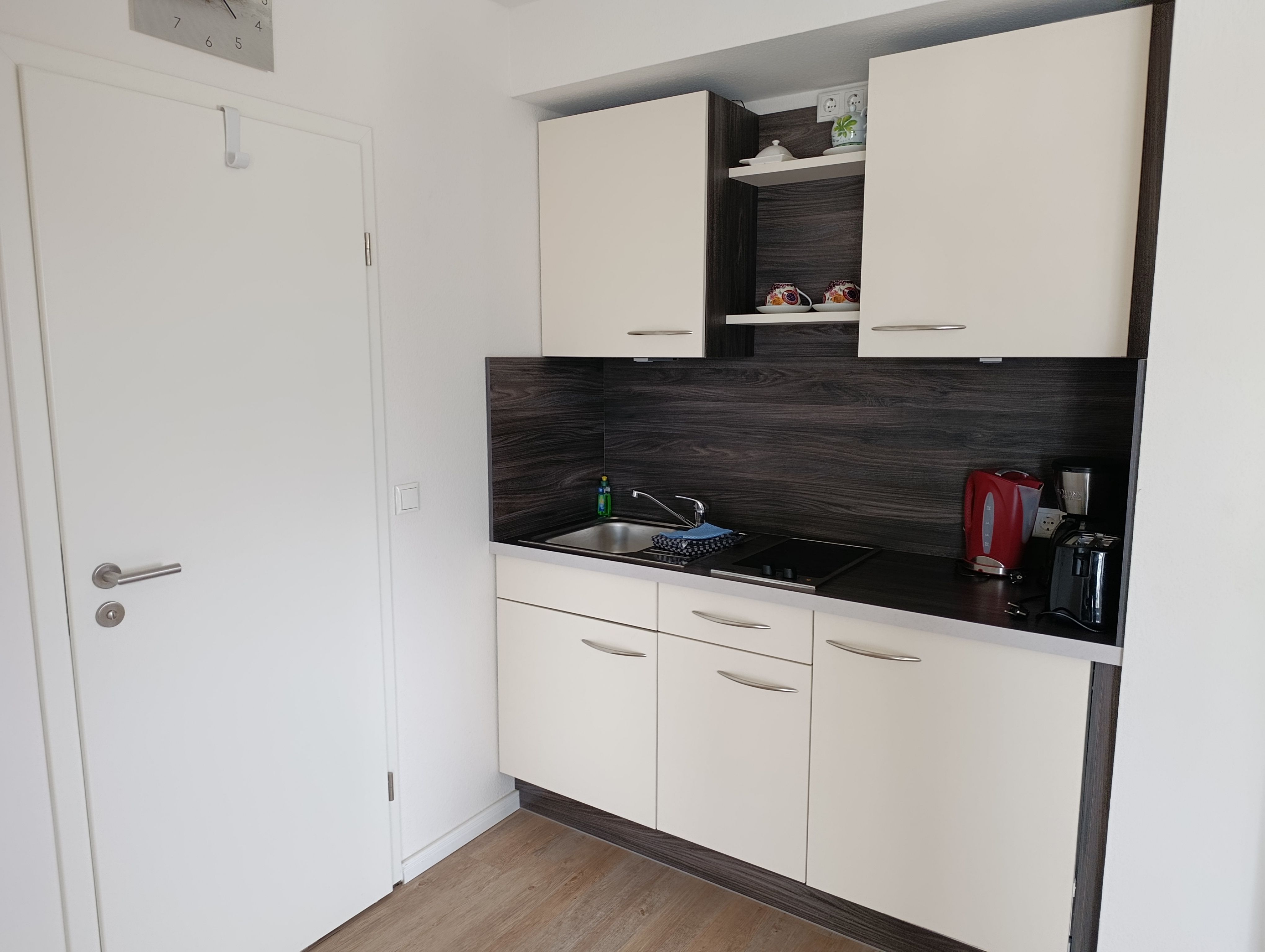 Küchenzeile mit Kühlschrank, 2-Platten-Herd, Kaffeemaschine, Wasserkocher, Toaster