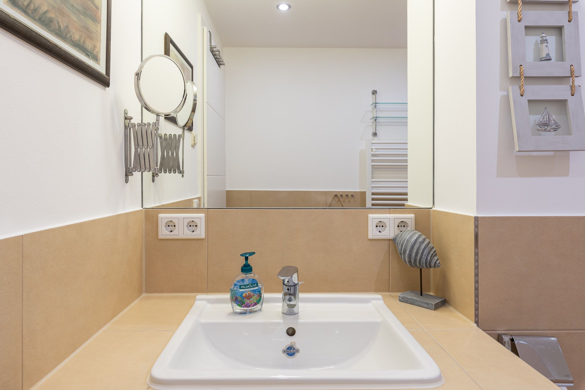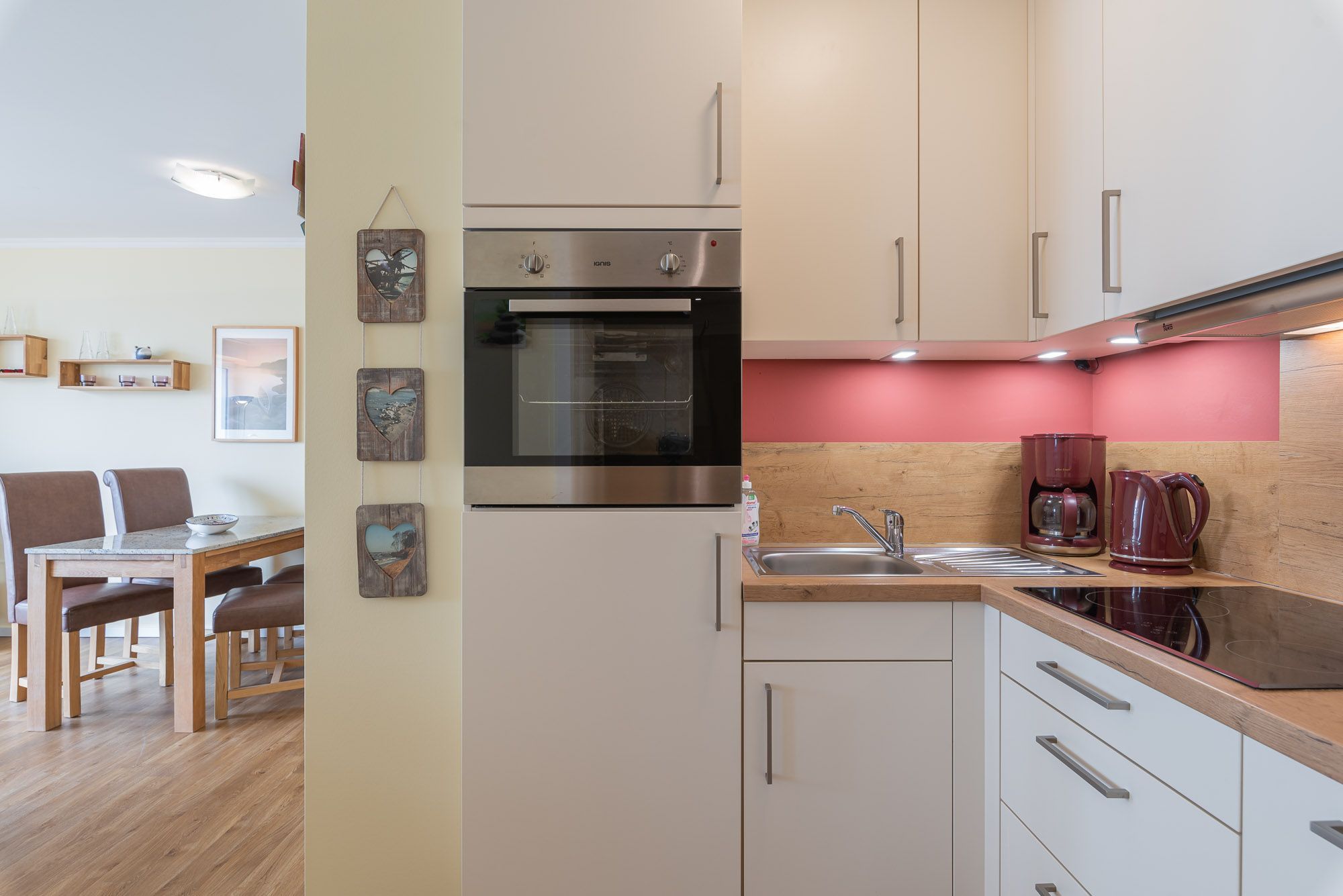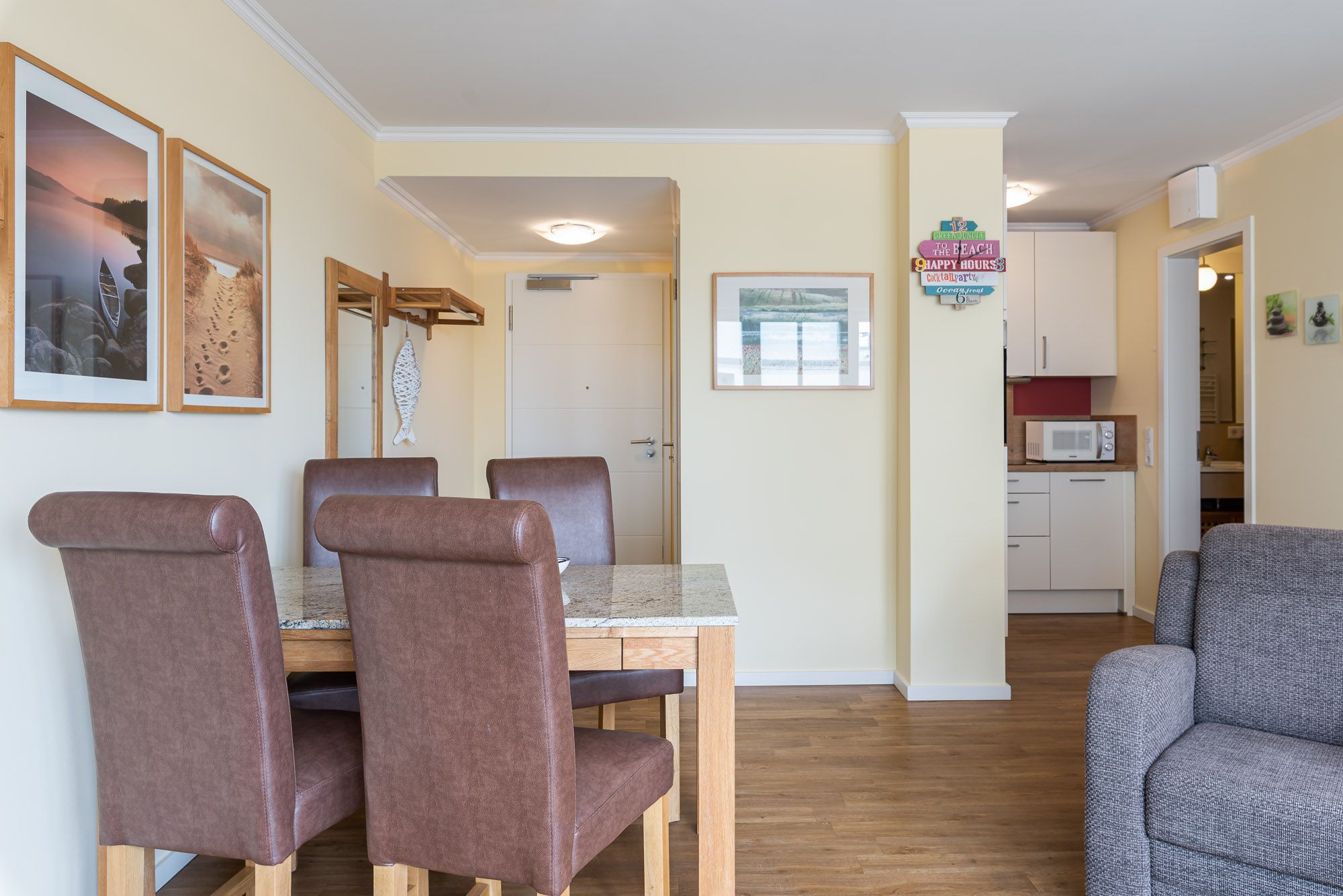 Das helle Ferienapartment ist etwa 50 qm groß, hat ein Schlafzimmer und ein Wohnzimmer mit offener Küche sowie ein Bad. Der einladende Wohnbereich heißt Sie herzlich willkommen mit einer komfortablen Couch, die sich zur bequemen Schlafcouch umfunktionieren lässt. Außerdem finden Sie hier einen großen HD-Fernseher samt DVD-Anlage, Radio und CD-Player. Die voll ausgestattete Küche bietet alles, was Sie benötigen, um feine Mahlzeiten zuzubereiten. Wie das Wohnzimmer verfügt auch das Schlafzimmer mit seinem geräumigen 1,80 m Doppelbett über einen eigenen Balkon-Zugang. Die große Sonnenterrasse in Süd-Ost-Ausrichtung bietet eine tolle Möglichkeit für das sommerliche Frühstück oder auch ein gemütliches Kaffeetrinken unter dem Sonnenschirm. Balkonmöbel sind vorhanden. Hier können Sie täglich bereits die Morgensonne genießen. Das Badezimmer ist mit hochwertigen Grohe-Armaturen und einer bodenebenen Dusche ausgestattet. Weitere Annehmlichkeiten wie Haartrockner, Kosmetikspiegel und Bad Accessoires stehen für Sie bereit.