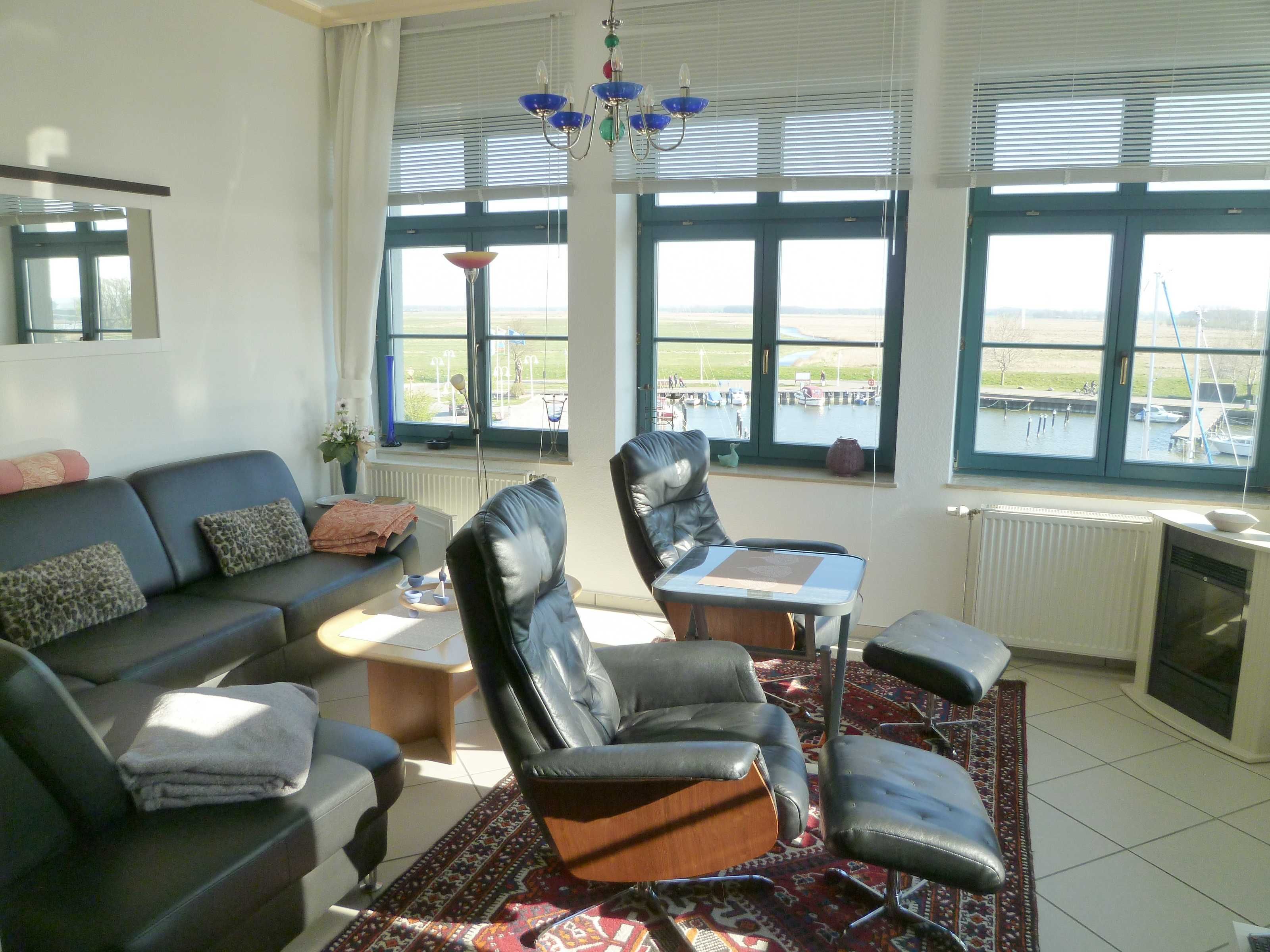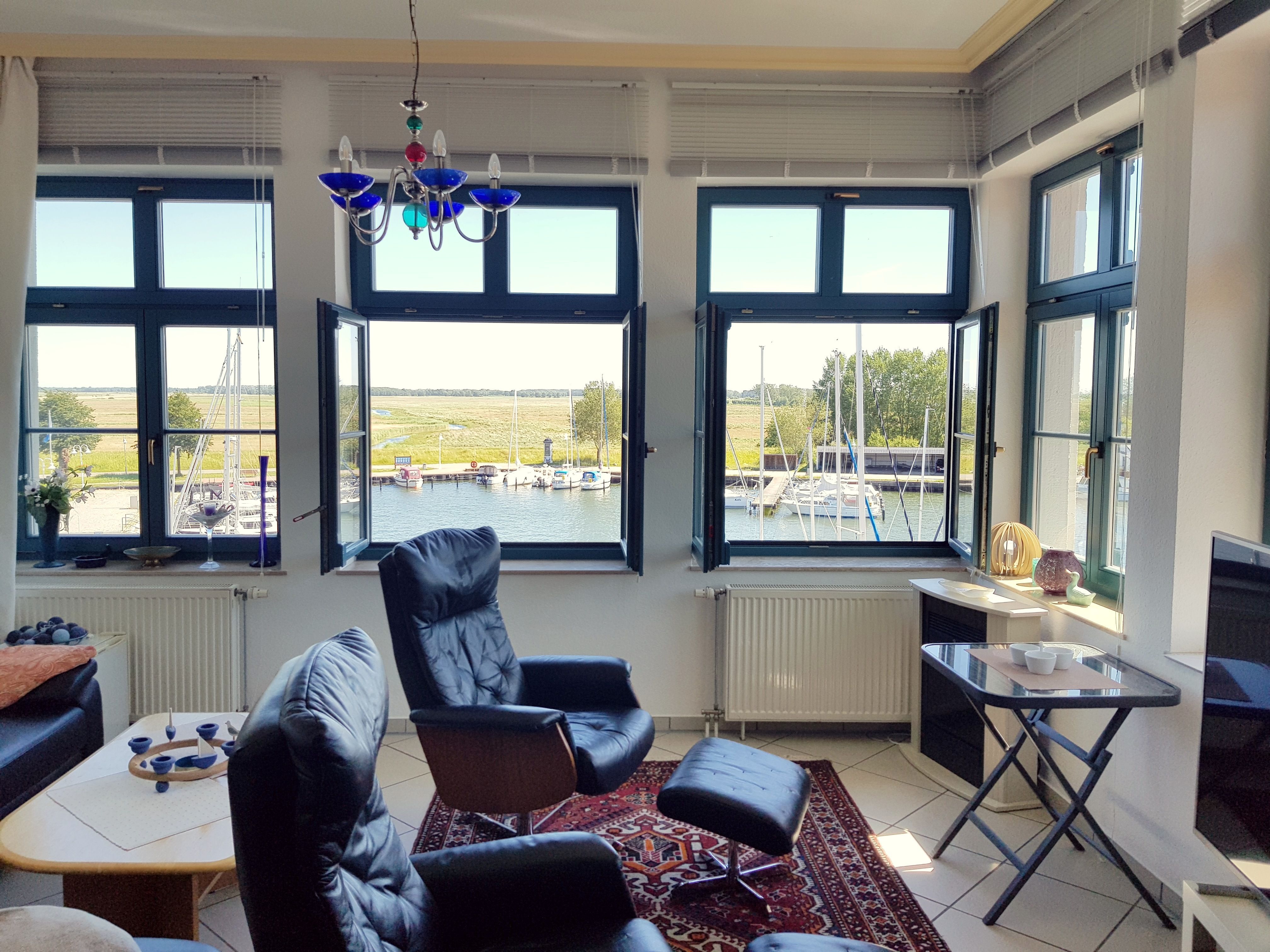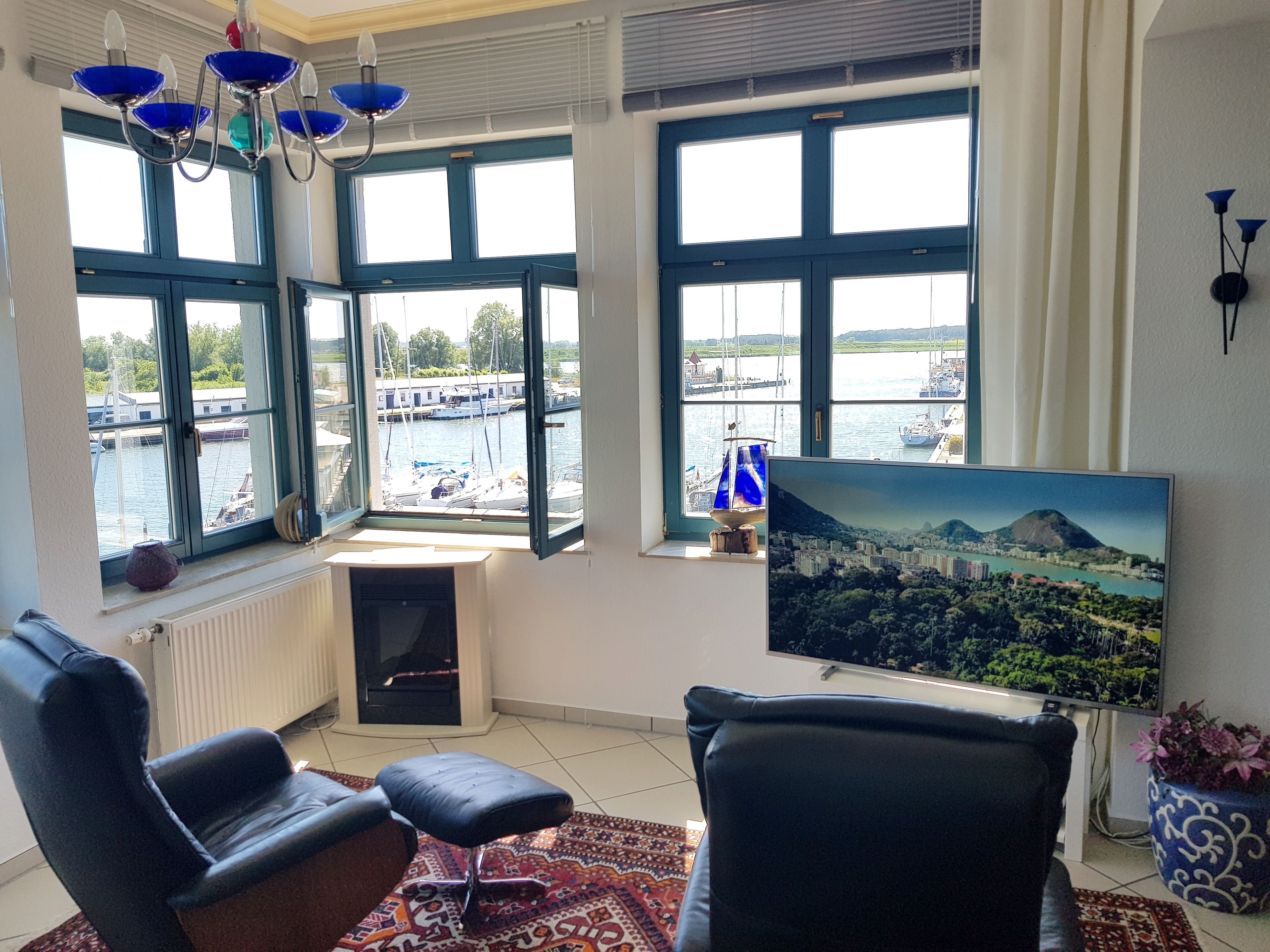 Wohnen direkt am Wasser mit traumhafter Aussicht - in unserer komfortablen und sonnigen Ferienwohnung Yachthafenidyll in direkter Wasserlage am idyllischen Hafen von Karlshagen genießen Sie einen erholsamen Urlaub. Die helle und großzügige 3-Raum-Wohnung (im 2. OG über Eck) verfügt über einen herrlichen Panoramablick auf den Segelhafen und die unbebauten Peenewiesen von allen Räumen (8 große Fenster) und ist somit ideal für alle, die Ruhe schätzen und die Natur genießen wollen. Aufgrund der günstigen Lage gibt es in die Wohnung keinerlei Einsicht, so dass Sie Ihren Aufenthalt ganz ungestört genießen können. Ein großer 58'' LCD-Fernseher mit Ambilight LED-Hintergrundbeleuchtung sorgt für ein ausgezeichnetes Fernseherlebnis. Mit der Smart-TV Funktion greifen Sie auch auf die Mediatheken und Inhalte aus dem Internet zu. Zwei Relaxsessel mit Fußstützen stehen für Sie bereit.