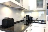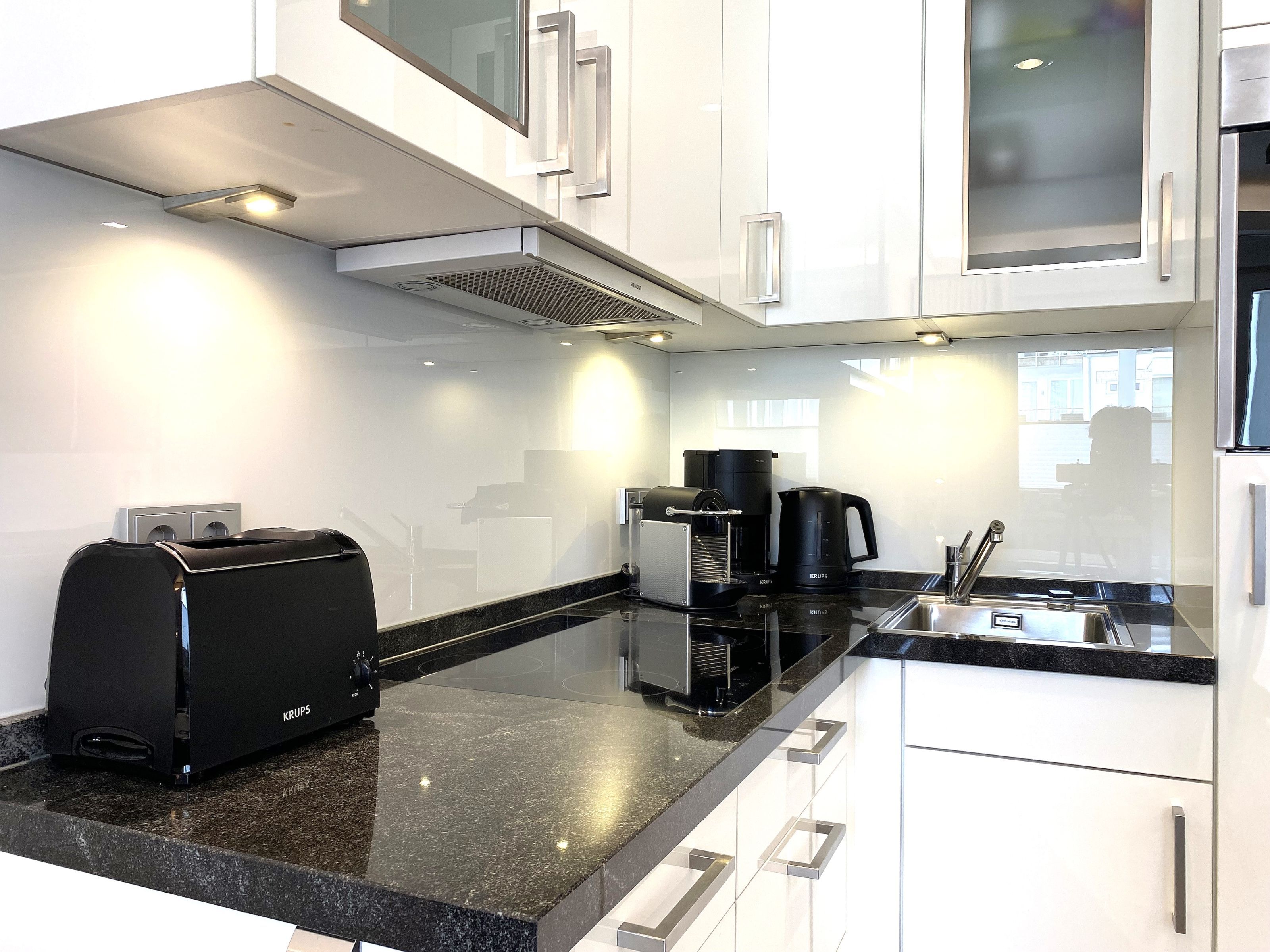 Im Wohnzimmer erwartet Sie eine moderne offene Küche mit Granitarbeitsplatte, Esstisch, Einbaumarkengeräten ( Geschirrspüler, Backofen, Cerankochfeld, Kühlschrank mit Gefrierfach) und entsprechenden Kleingeräten, Kaffeemaschine, Nespressomaschine, Toaster, Wasserkocher.