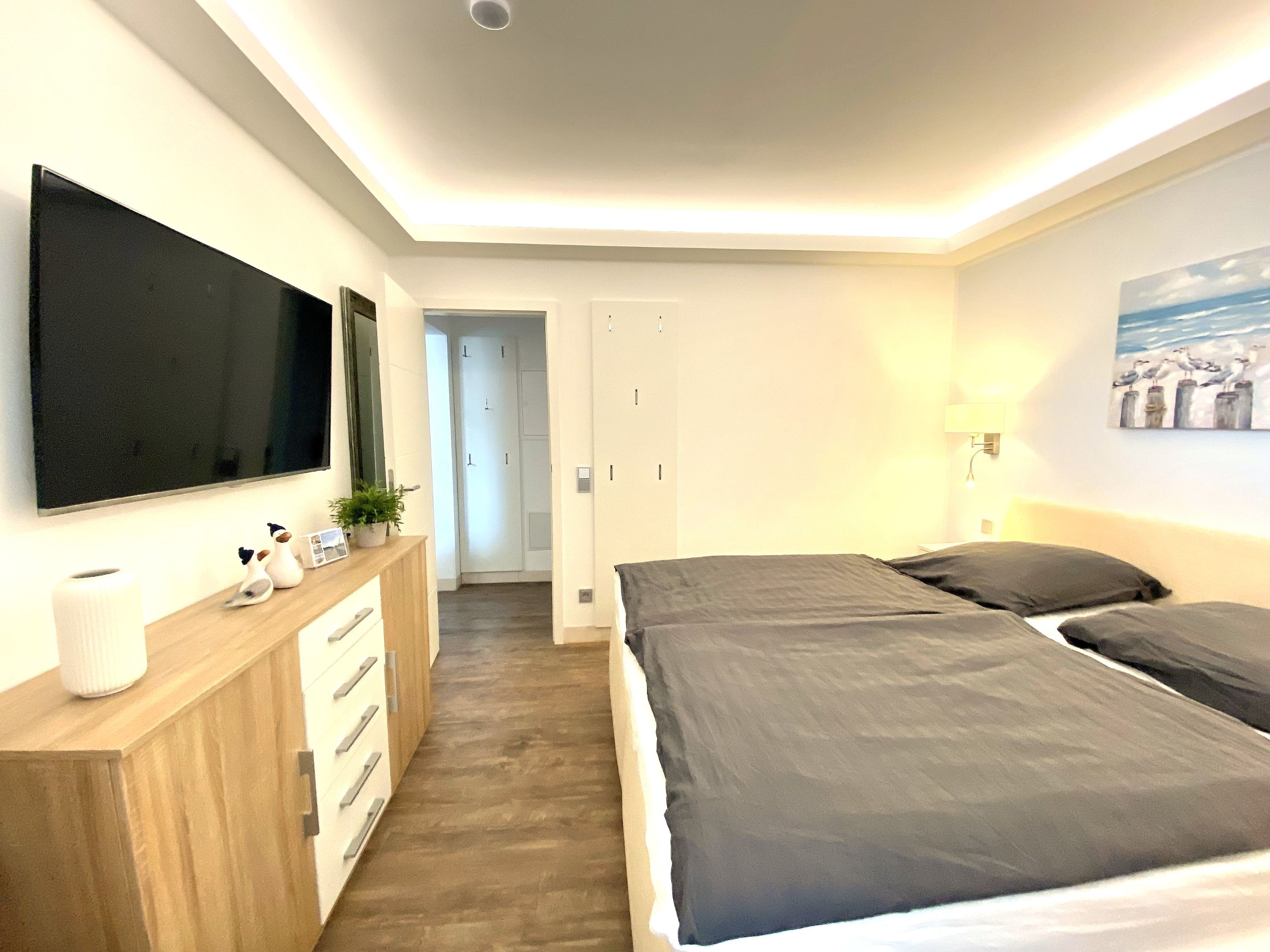Das Schlafzimmer verfügt über ein 1,80 x 2,00 m komfortables Bett (durchgängiger Topper) , einem Flachbildfernseher, Kleiderschrank etc.