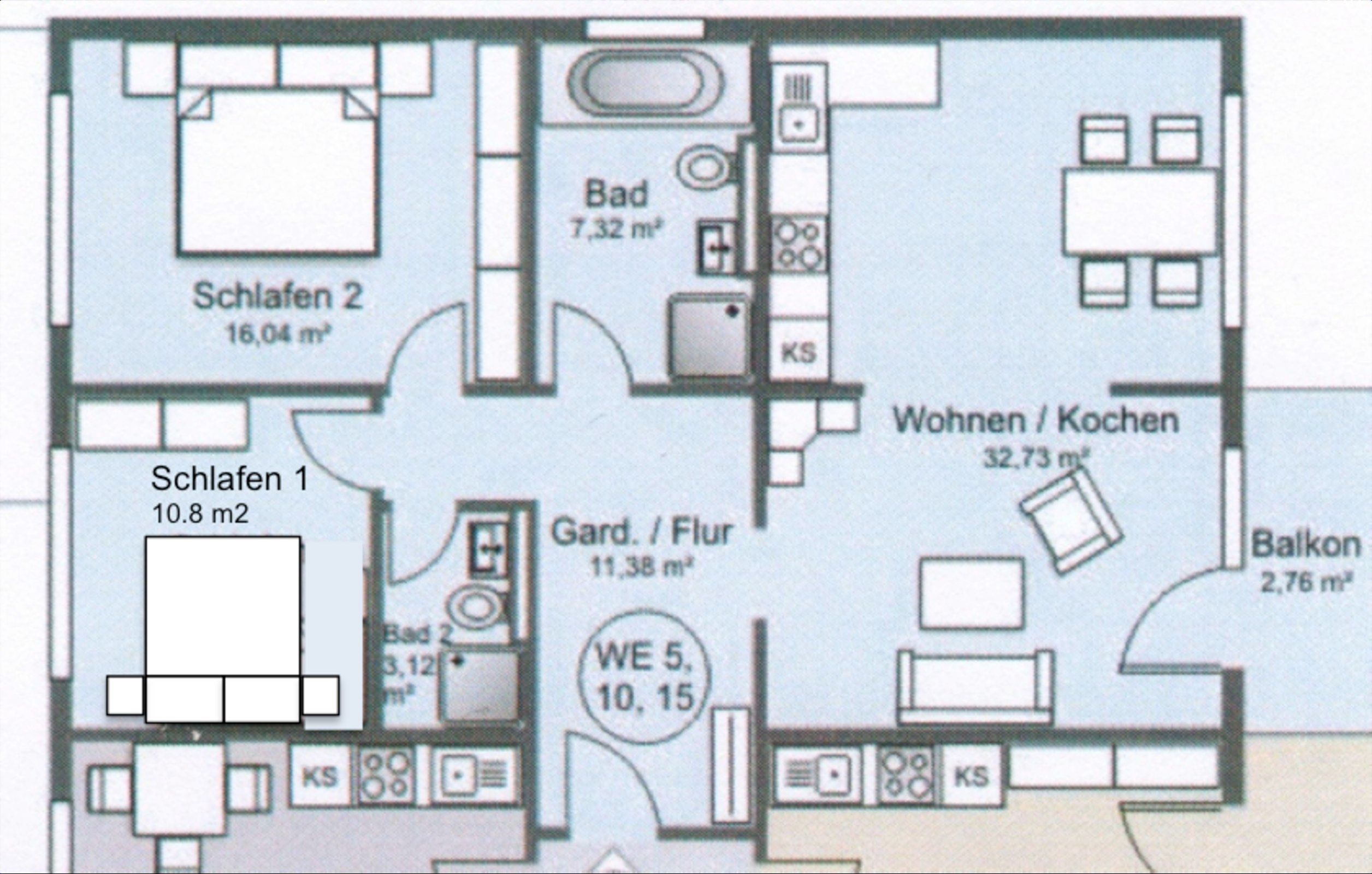 Ein großer Eingangsbereich, großzügiger, heller Wohnraum mit Sitzbereich, offener Küche und Essbereich. Es besteht ein Südbalkon vom 3m² mit Sitzgelegenheit und Strandkorb zum Sonnen.