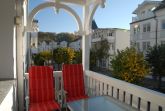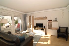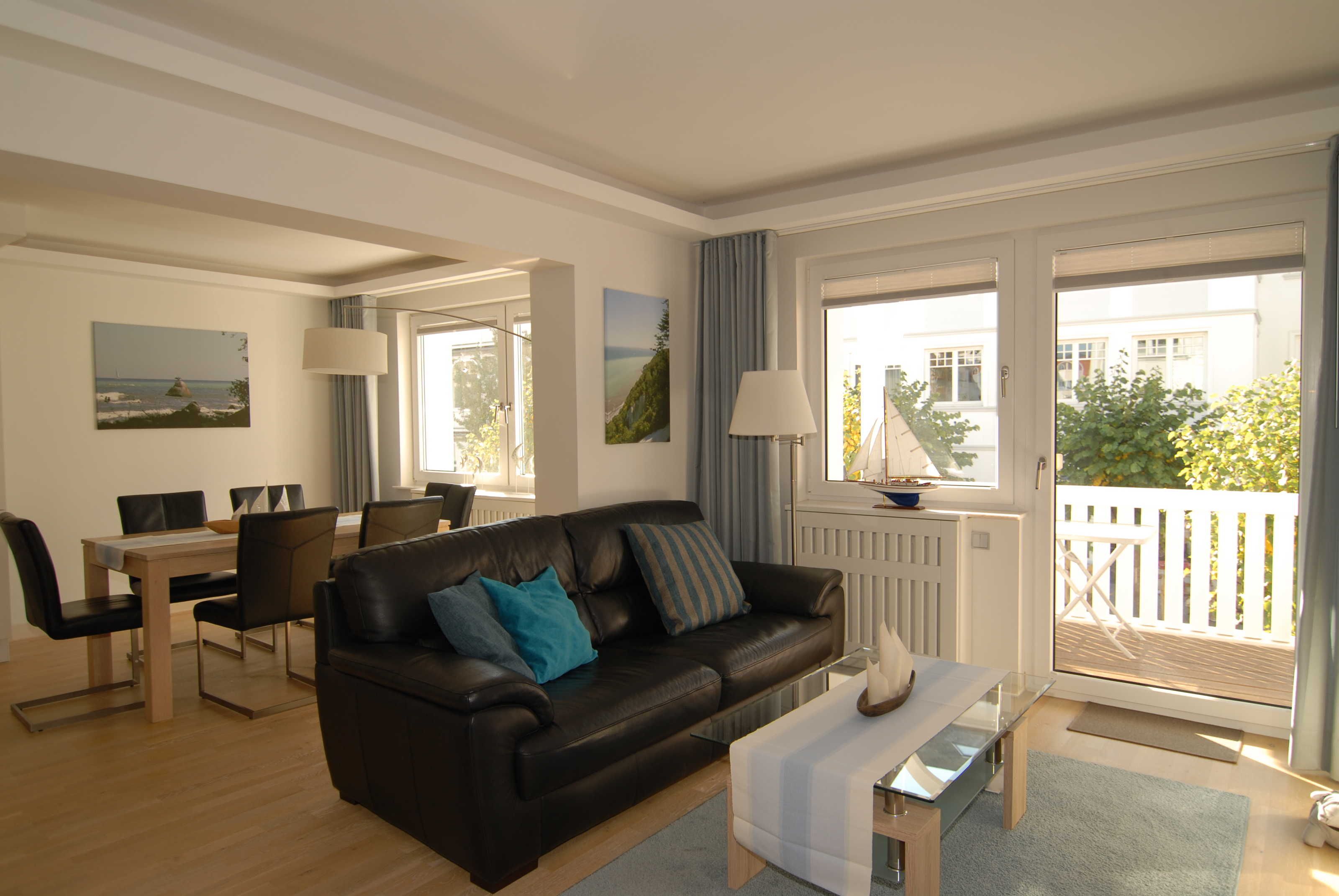 Das stilvoll maritim ausgestattete 3-Zimmer-Appartement hat eine Größe von 84 qm und befindet sich im 1. Obergeschoss. Es ist auch mit einem Fahrstuhl erreichbar. Alle Räume verfügen über Eichenparkett bzw. Marmorfußböden. Die Fenster sind mit Plissees, die Decken mit modernen Lichtleisten versehen.