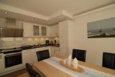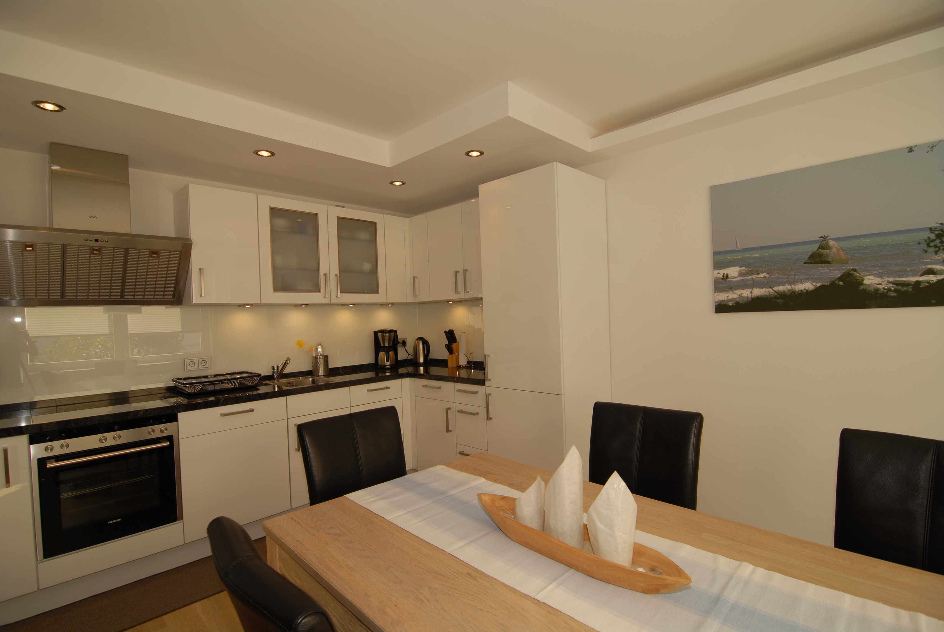 Im angrenzenden, großzügigen Essbereich befindet sich ein Eichentisch mit lederbezogenen Schwingstühlen und eine moderne, offene Hochglanzküche mit Granitarbeitsplatte und Markengeräten (Backofen, Cerankochfeld, Kühl- und Gefrierschrank, Spülmaschine, Kaffeemaschine etc.).