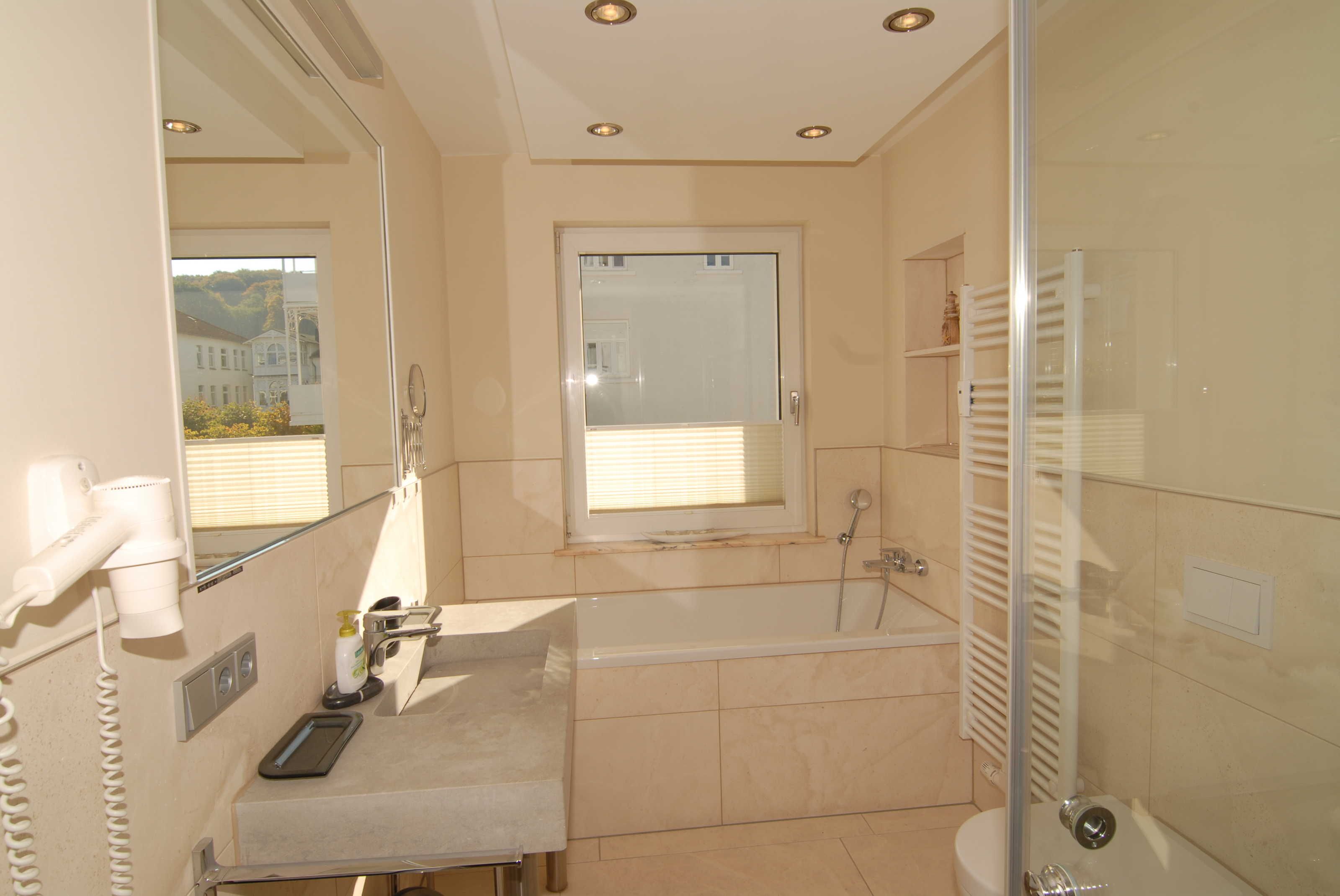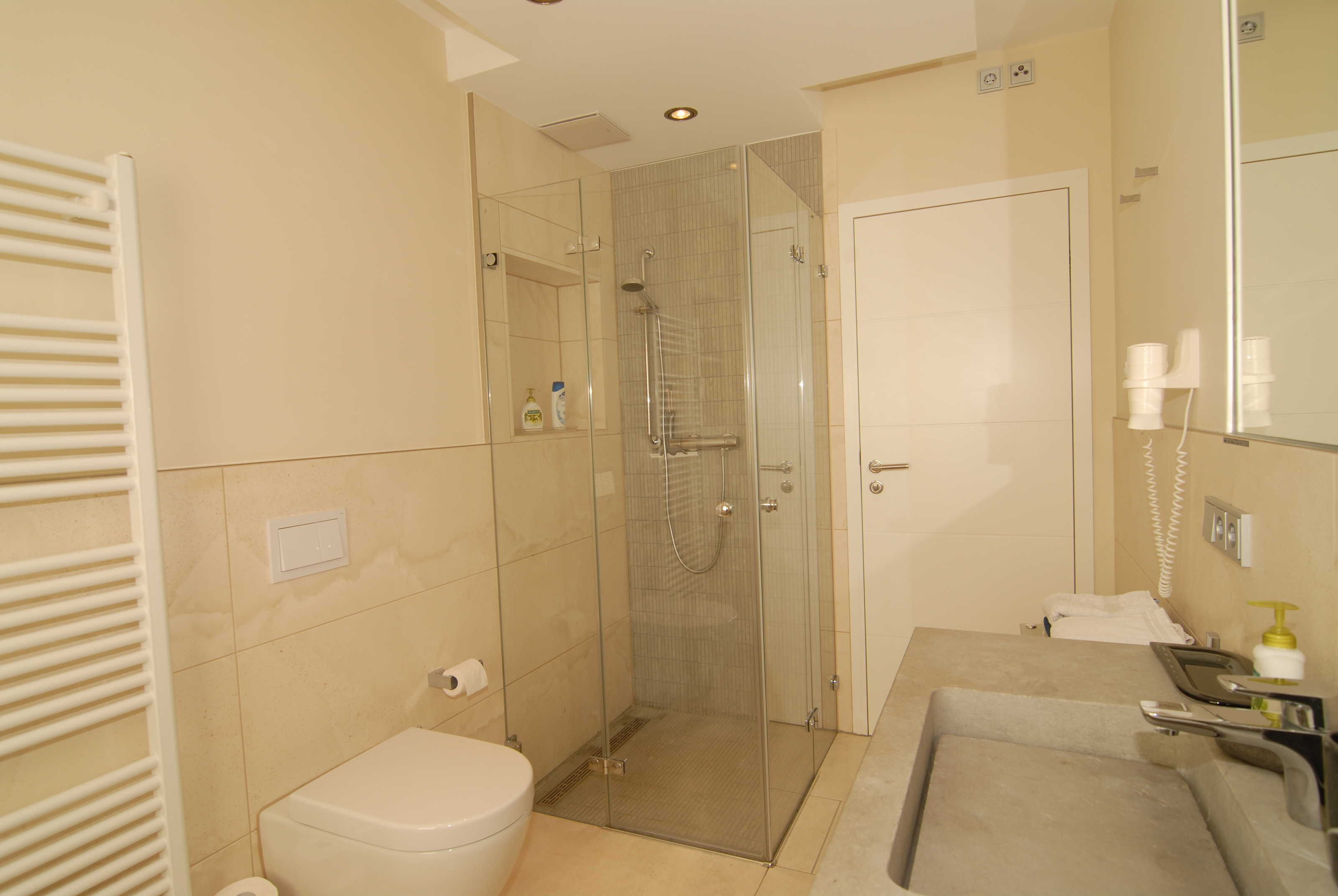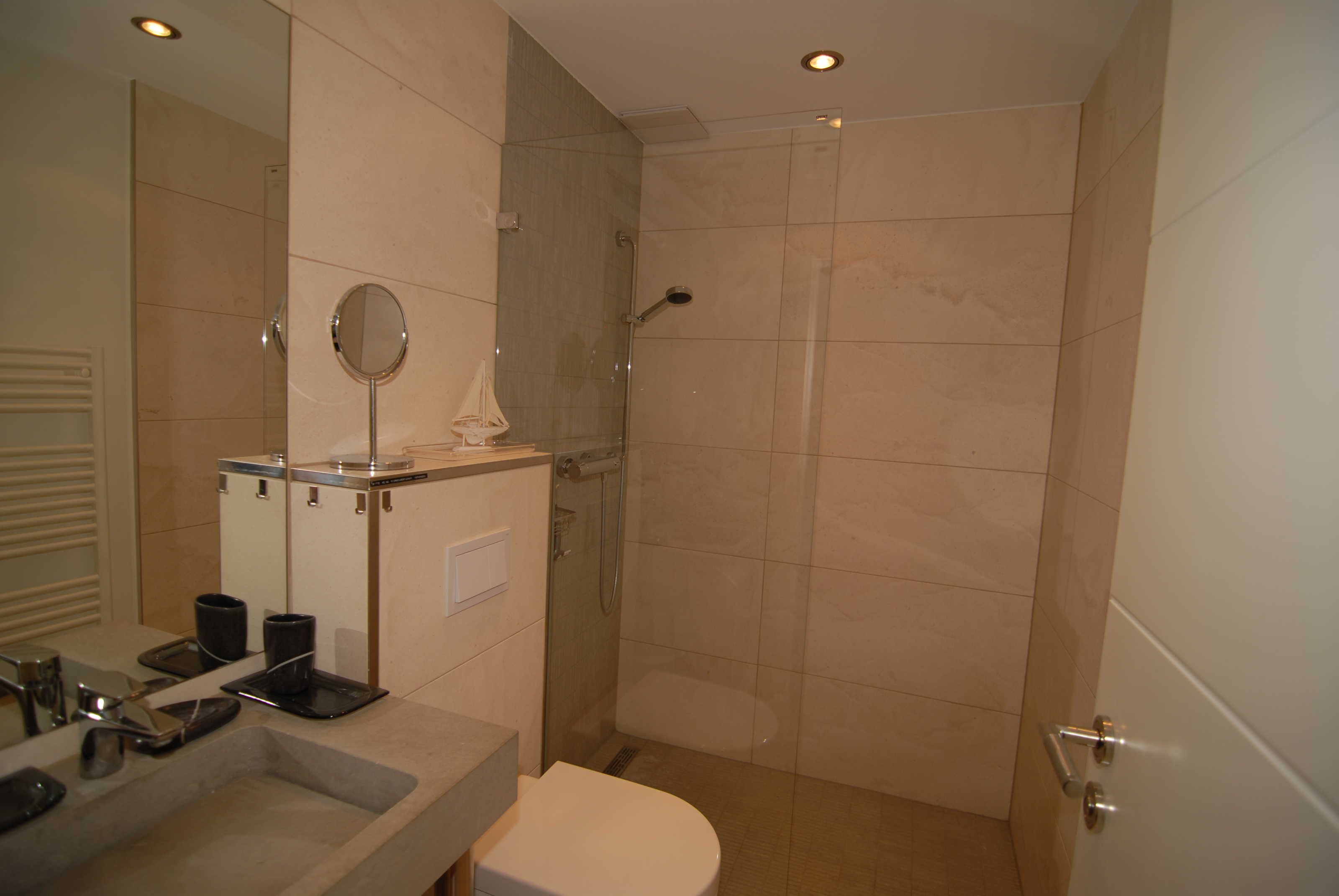 Die beiden Bäder sind mit Marmorfliesen und Natursteinwaschbecken, WC, geräumigen Duschen, Fußboden- und Handtuchheizung und Haartrocknern ausgestattet, das Masterbad zusätzlich mit einer Badewanne.