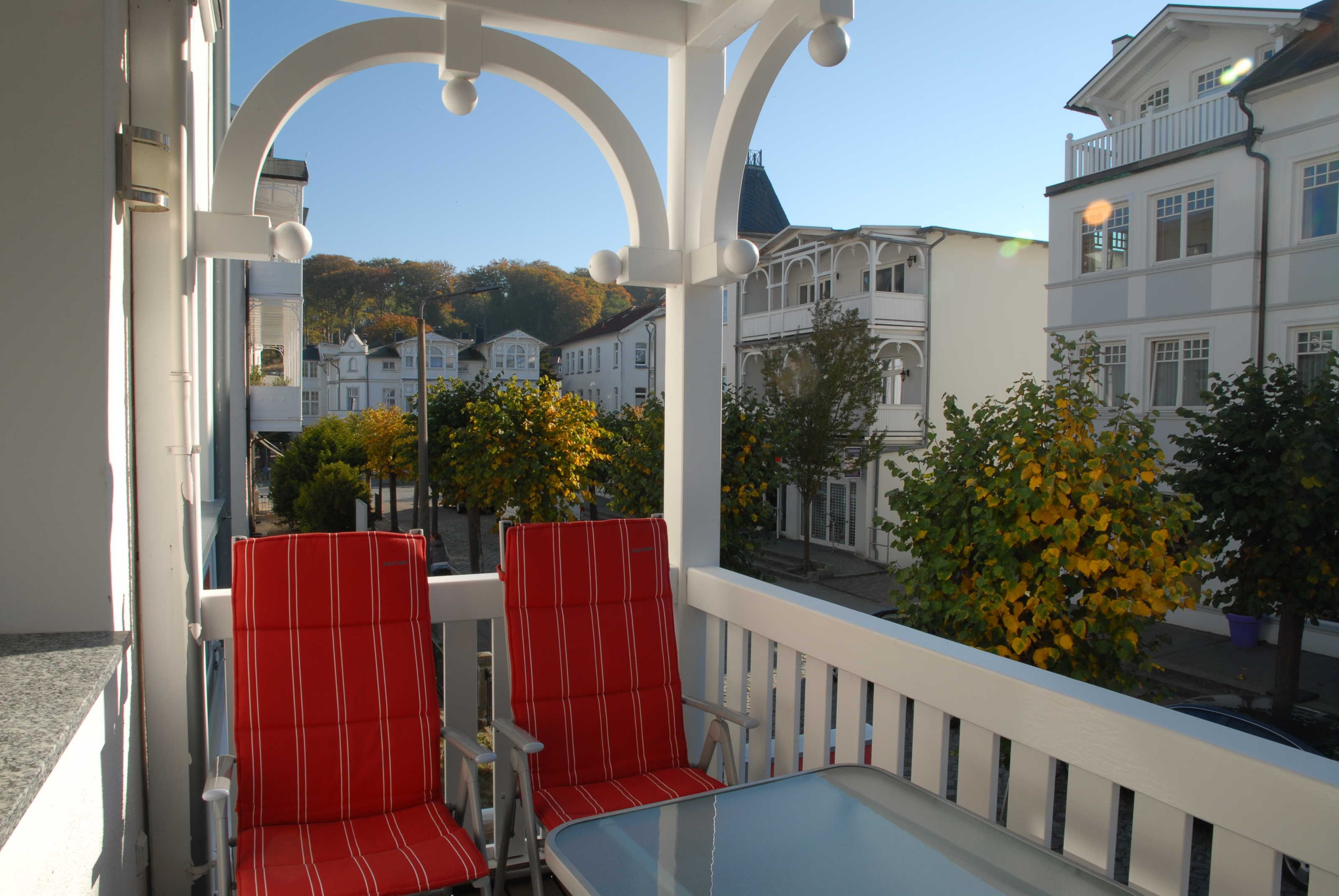 Ein sonniger, nach Südwesten ausgerichteter Balkon lädt mit seinen bequemen Balkonmöbeln zum Entspannen ein.