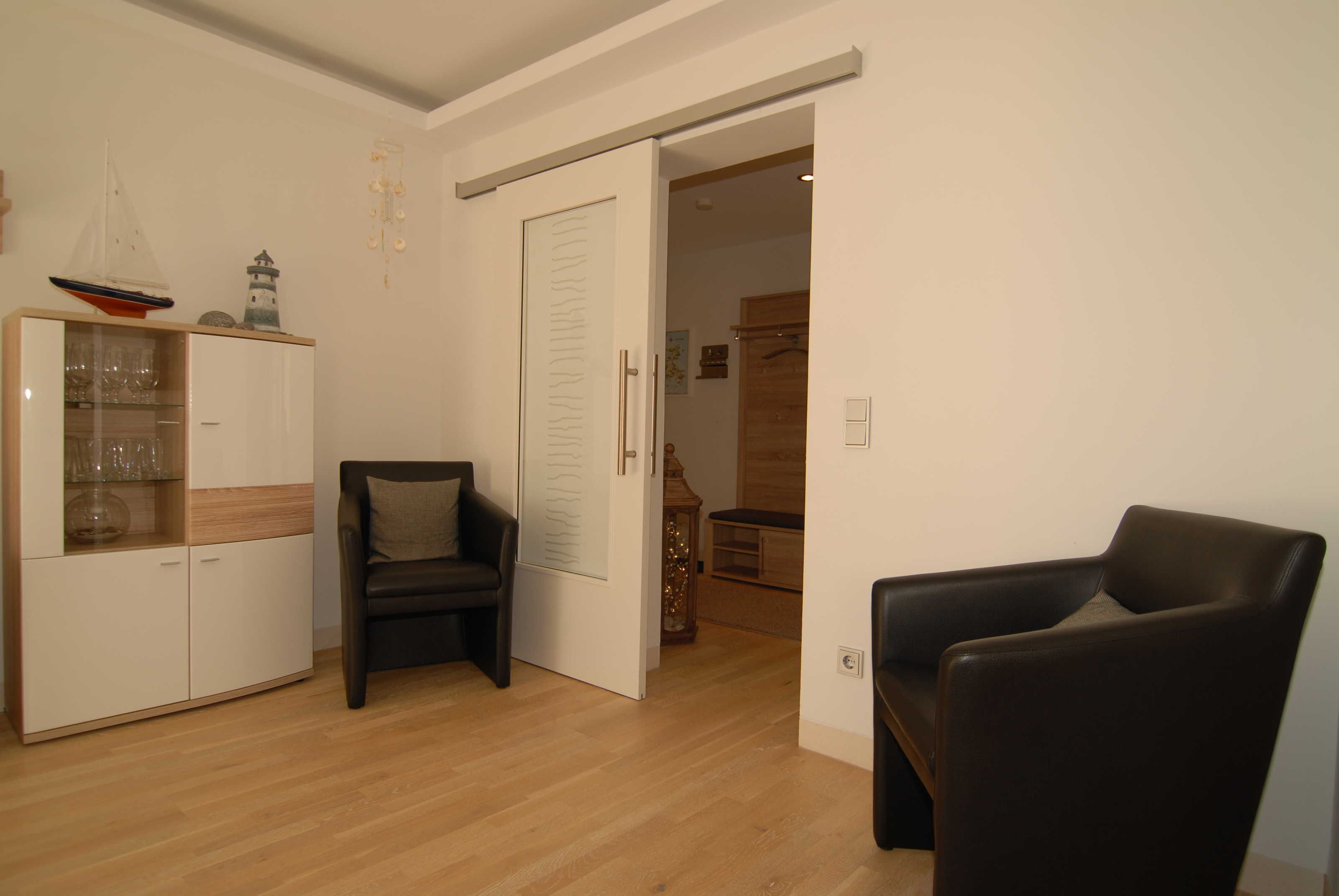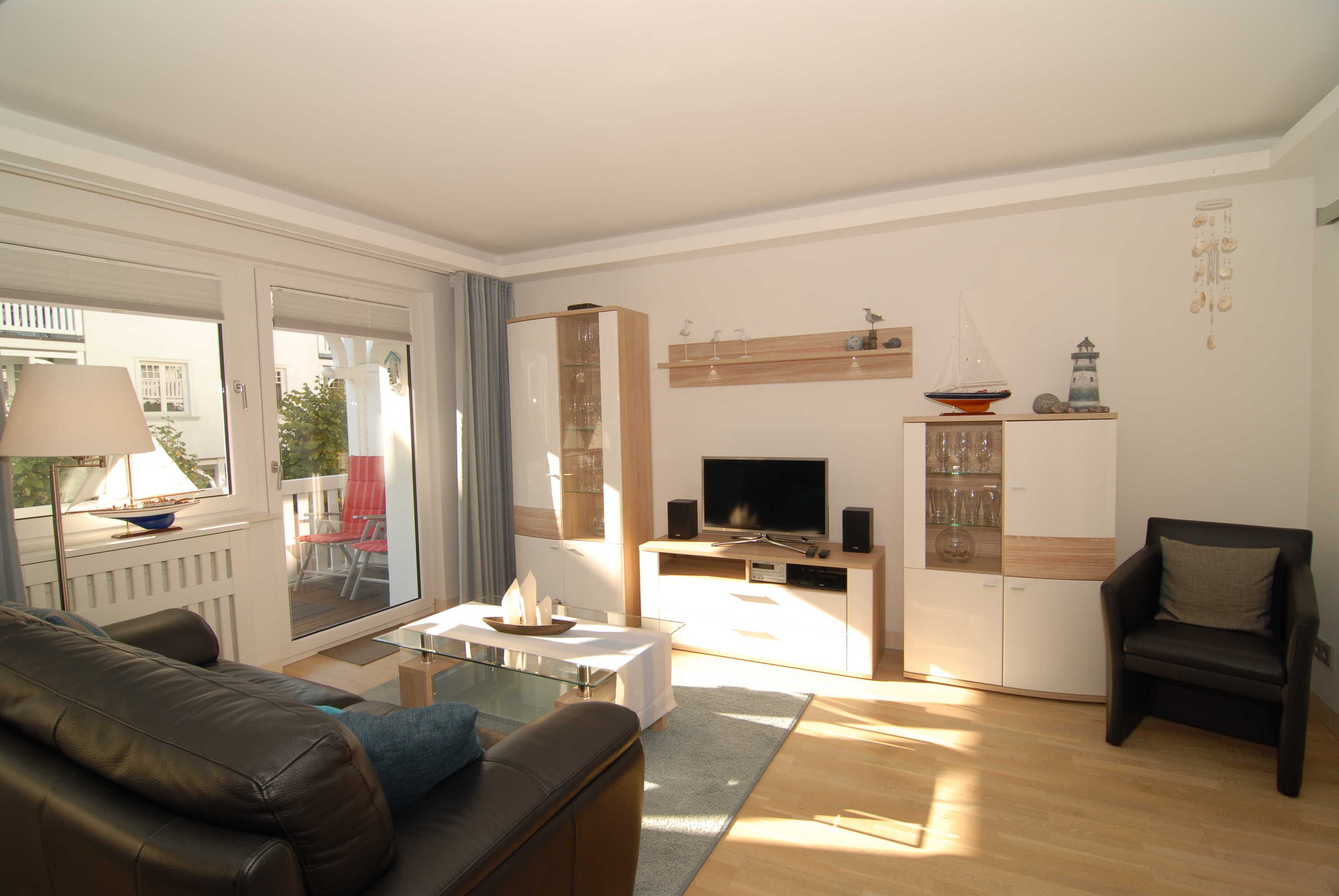 Das lichtdurchflutete Wohnzimmer schafft mit seiner Ledergarnitur und der Schrankwand eine freilassende Atmosphäre zum Wohlfühlen. Es bietet SMART-TV, DVD- Player, Stereoanlage (Radio, CD, MP3 über USB) und einen schnellen kostenlosen Internetzugang über WLAN.