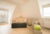 Das komfortable moderne Sofa im Wohnraum kann bequem als zusätzliche Schlafgelegenheit (1,60 x 2m) genutzt werden. In dem separaten, individuell gestalteten Schlafzimmer steht ein großzügiges Boxspringbett (2x2x1m) für höchste Ansprüche an eine entspannte Nachtruhe. Die maßgefertigten Sideboard-Schränke bieten ausreichend Stauraum. Das Bad ist geräumig und mit hochwertigen Natursteinen ausgelegt. Die ebenerdige Dusche, der Waschtisch mit zwei Waschbecken sowie die Armaturen folgen modernem Design und Qualität. Ein Föhn ist installiert. Waschmaschine und Trockner befinden sich im Erdgeschoss.