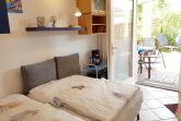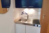 1-Raum-Appartement mit separatem Eingang für 1 bis 2 Personen, kombiniertes Wohn-/Schlafzimmer mit Schlafcouch, hochwertige Miniküche im Wohnraum mit Cerankochfeld und Kühlschrank (4-Sterne Eisfach). Modern ausgestattet, schöner Fliesenboden. Modernes Bad mit Dusche und WC. Große, möblierte Terrasse nach Süden und Westen orientiert, teilweise überdacht (2,40 m) mit zwei Rollliegen und Strandkorb. 32 LCD-Fernseher, Sat-TV, Radio mit CD-Player, Kaffeemaschine, Mikrowelle mit Grill.
