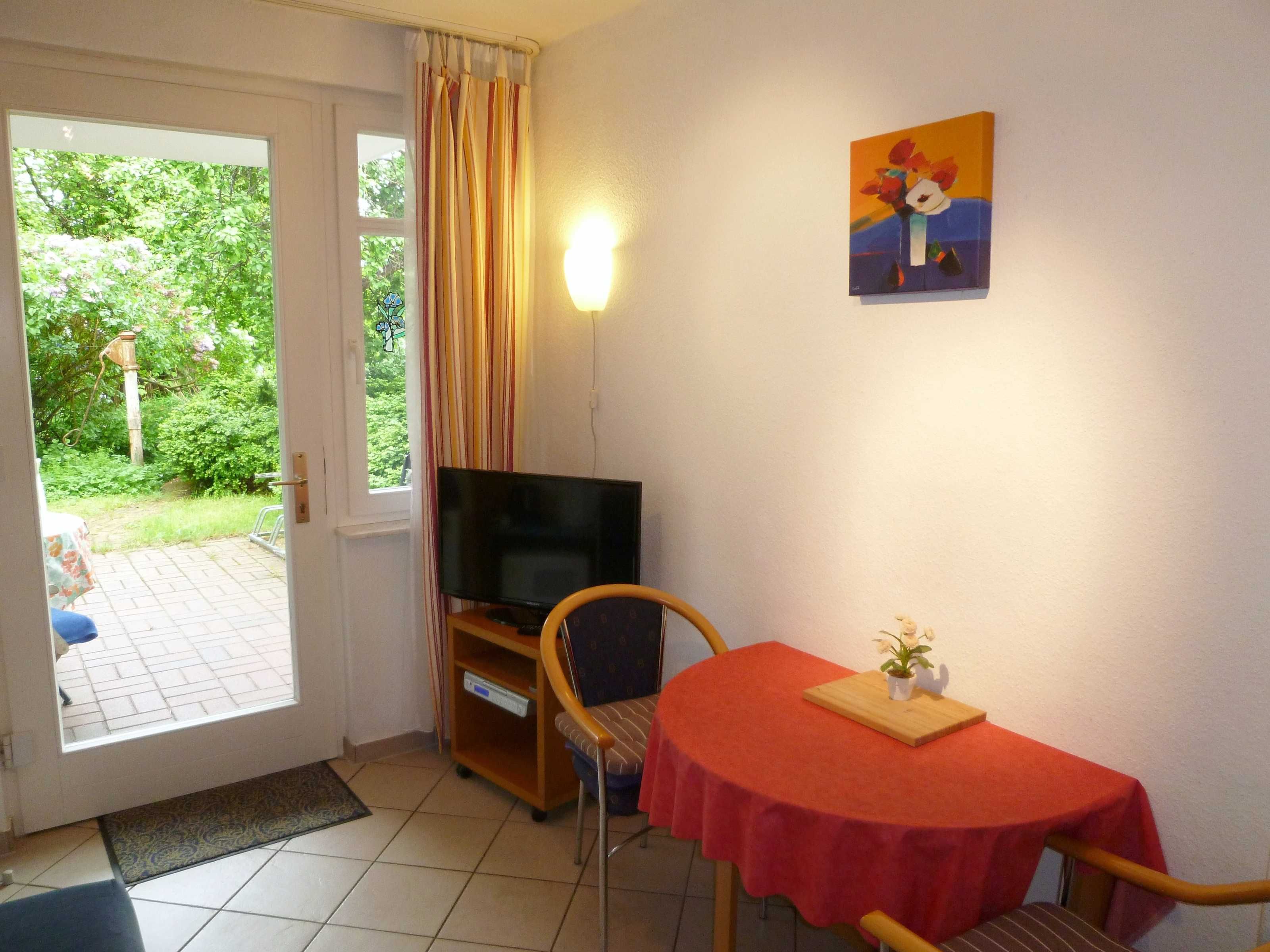 1-Zimmer-Appartement mit separatem Eingang, zusätzlich ca. 7 m² überdachte, möblierte Terrasse mit Rollliegen und Strandkorb, das Appartement ist komfortabel und gemütlich ausgestattet, sehr hell, die Südseite ist großzügig verglast, hochwertige Miniküche mit Cerankochfeld und Kühlschrank (4-Sterne Eisfach), Mikrowelle und Grill, 32 LCD-Fernseher, Sat-TV und Radio mit CD-Player, chices, sehr modernes Duschbad mit Fenster, das Appartement befindet sich inmitten eines herrlichen Naturgartens in absolut ruhiger Lage, 2 Gehminuten zum Strand, im OG befindet sich eine Wohnung.