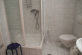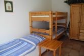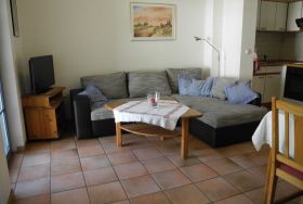 Diese Wohnung befindet sich im Erdgeschoss und verfügt über einen Wohnraum mit integrierter Einbauküche, Essplatz und einer Couchecke, ein Elternschlafzimmer mit Doppelbett, ein Kinderzimmer mit einem stabilen Etagenbett und einer ausziehbaren Liege, eine Dusche/WC und eine halbüberdachte Terrasse, die direkt in den Garten führt.