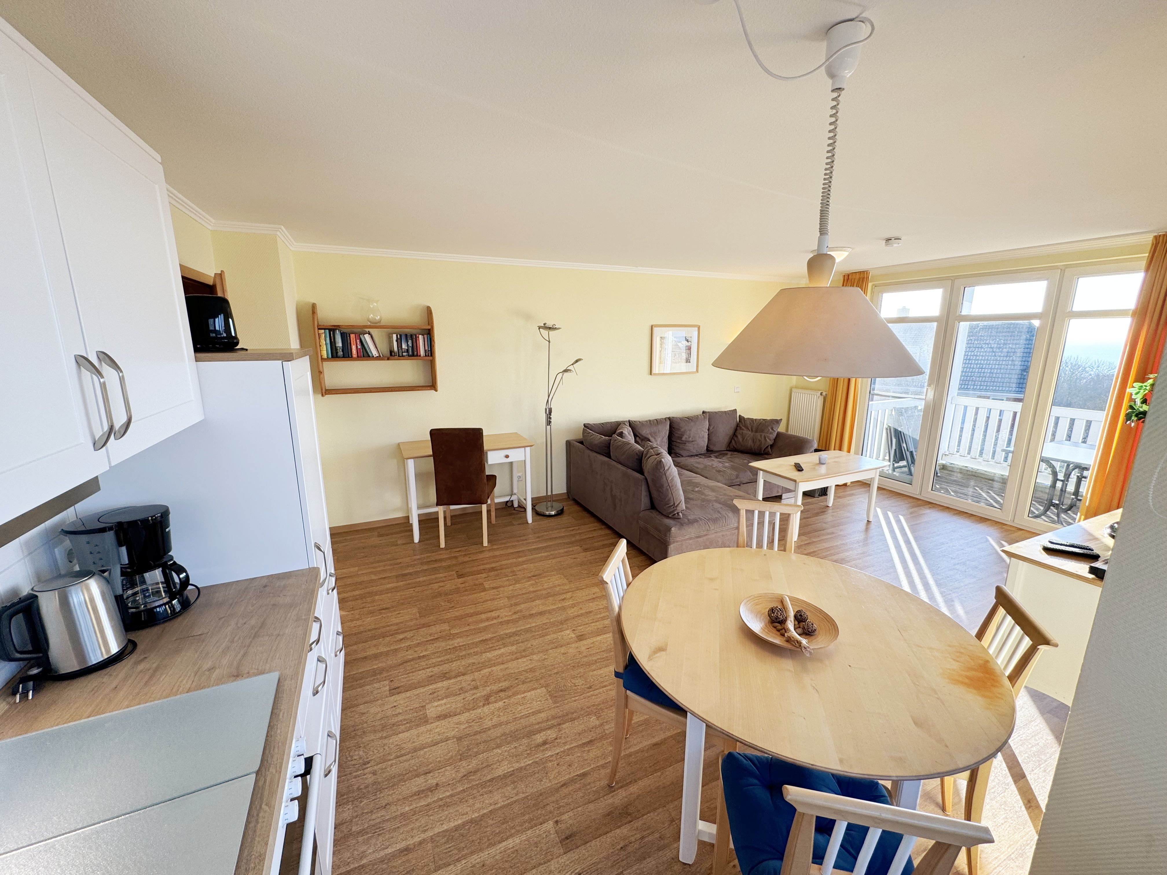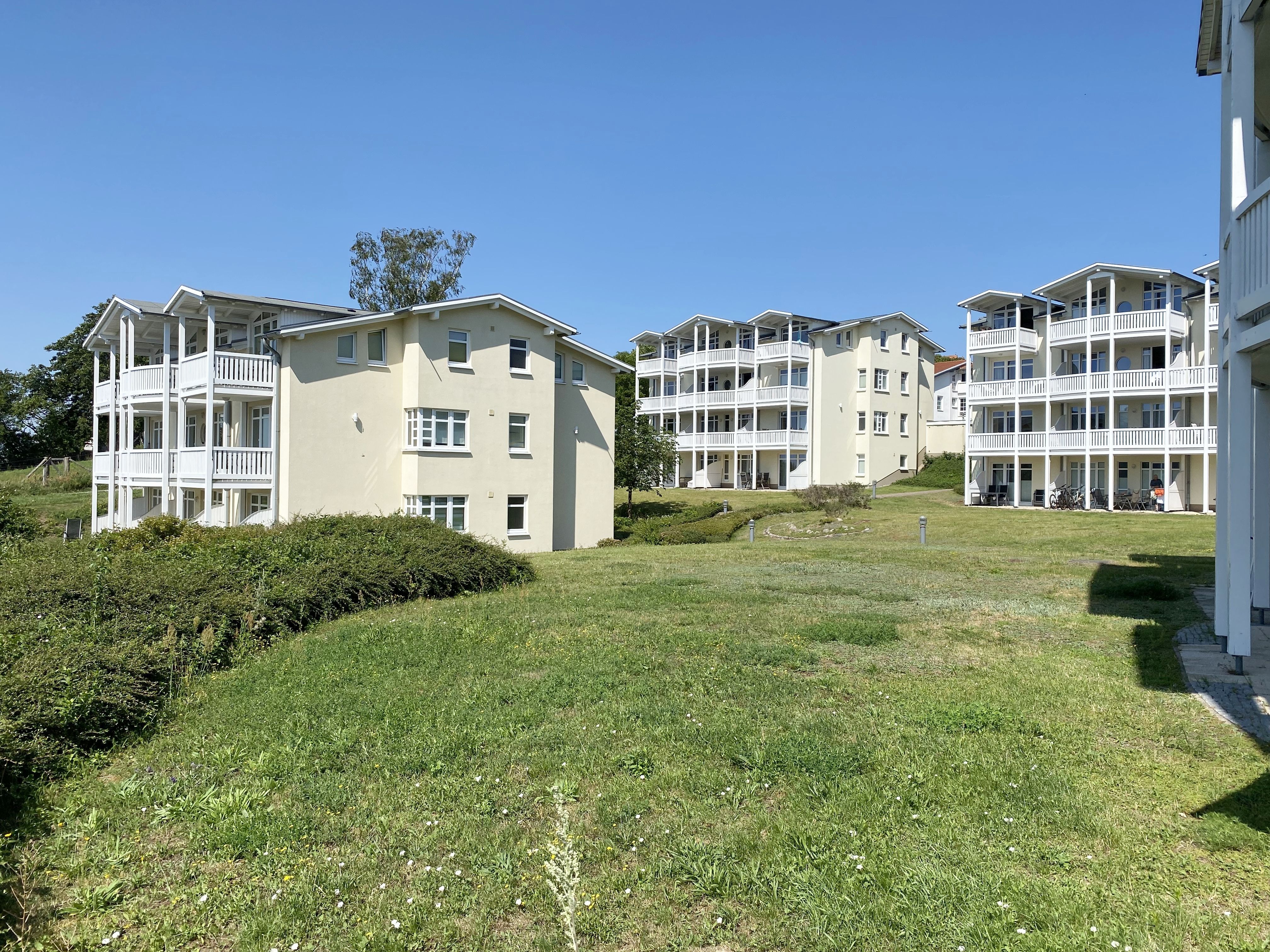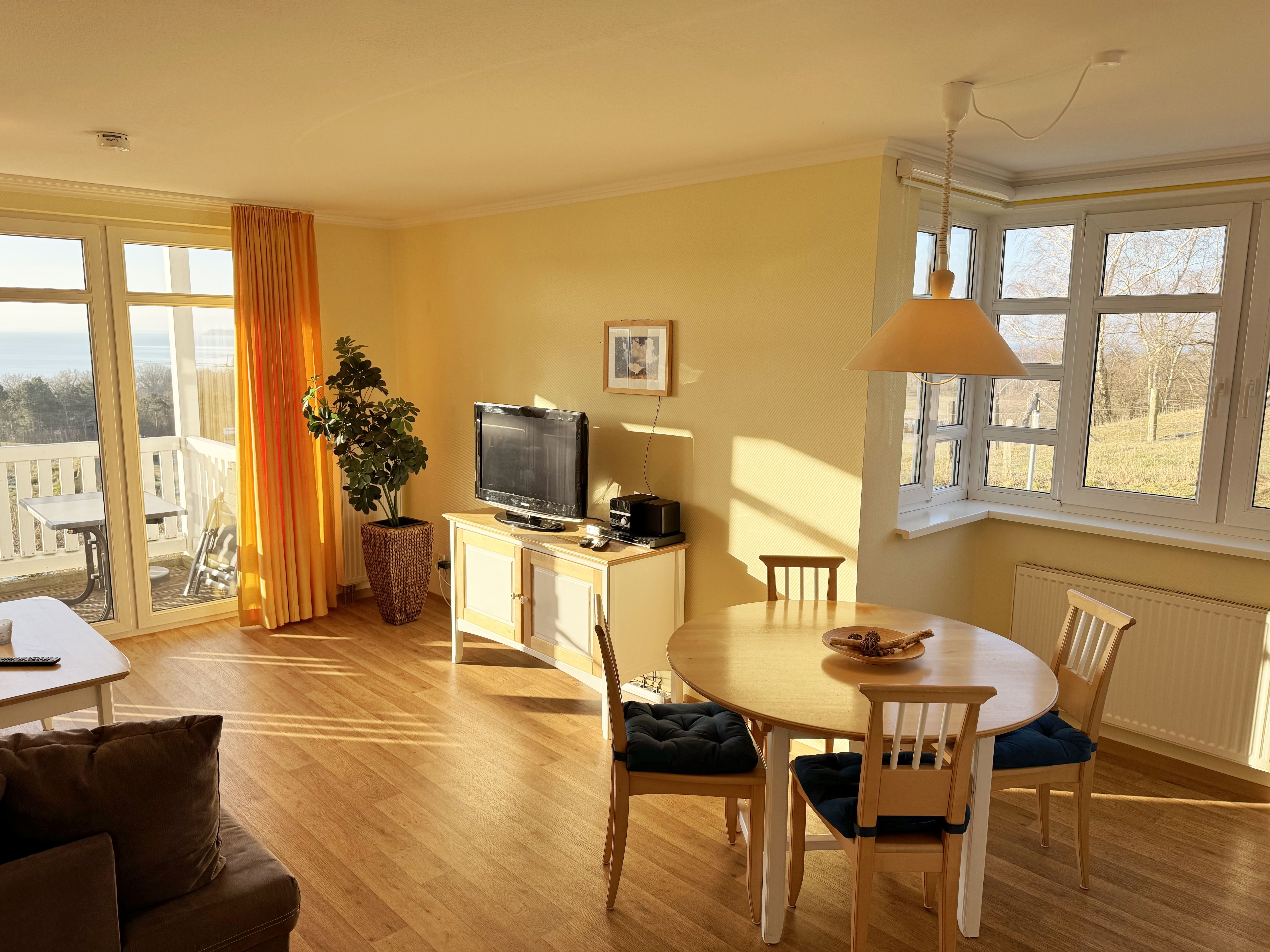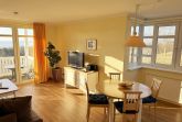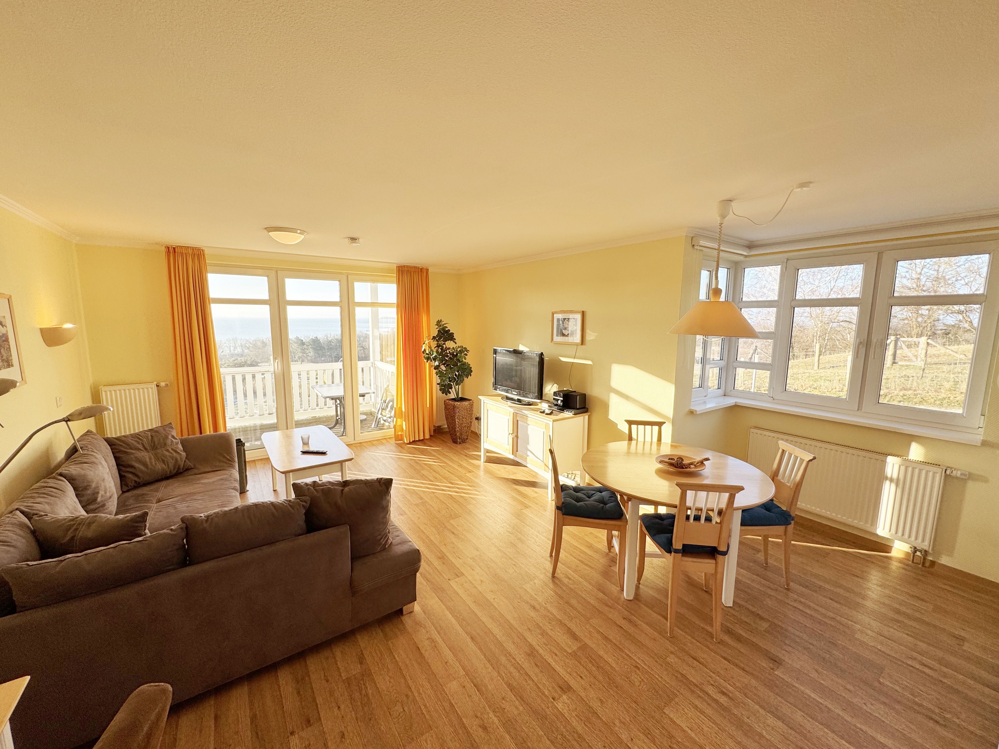 Unsere komfortable Nichtraucherwohnung von ca. 60 m² befindet sich in der 1. Etage und ist für max. 4 Erwachsene und 1 Kleinkind bis 3 Jahre im Kinderreisebett ausgelegt. Der Wohnbereich mit integrierter Küchenzeile und Essplatz ist großzügig ausgestattet. Die Küchenzeile verfügt unter anderem über einen Backofen, 4-Zonencerankochfeld, Kühlschrank mit Eisfach, Geschirrspüler, Kaffeemaschine, Wasserkocher, Toaster sowie diverse Küchenutensilien, die Ihnen beim Kochen keine Wünsche offen lassen. Der Essplatz besteht aus einem runden Holzesstisch mit 4 Stühlen. Ein Sideboard mit Flachbild-TV, DVD-Player, Ministereoanlage, Leselampe, Couch mit Couchtisch und einem Sessel runden den Wohnbereich ab. Das große Schlafzimmer verfügt über ein Doppelbett (2 x 0,90 m x 2,00 m) mit Nachttischkonsolen und Kleiderschrank. Das kleine Schlafzimmer ist ausgestattet mit einem französischem Bett, Nachttischablage sowie einem Kleiderschrank. Im Wohnbereich sowie im Schlafbereich befinden sich Insektenschutzgitter. Genießen Sie von Ihrem bestuhlten Balkon mit Ausrichtung (Süd/Südwest) den einmaligen Blick auf die Ostsee. Das Bad ist mit einem Waschtisch, Dusche, WC, Urinal, Kosmetikspiegel und Fön eingerichtet. Ein Fenster im Badbereich spendet Ihnen Tageslicht. Ein eigener PKW-Stellplatz Nr. 06 sowie eine Fahrradabstellmöglichkeit sind für Sie vorhanden. Ein WLAN-Zugang steht Ihnen inklusive zur Verfügung. Ein Kinderreisebett (ohne Matratze und Bett Inlett) und ein Hochstuhl können auf Anfrage gegen eine Gebühr für unsere kleinen Gäste gestellt werden. Waschmaschine und Trockner kann in einem separaten Raum genutzt werden. Die Erstausstattung eines Wäschepaketes (komplette Bettwäsche, 1 Duschhandtuch, 2 kleine Handtücher) können Sie bis 14 Tage vor Anreise gegen einen Aufpreis dazu buchen oder durch eigene ergänzen. Ab 2 gebuchten Paketen erhalten Sie einmalig 1 Geschirrhandtuch und 1 Duschvorleger dazu.
