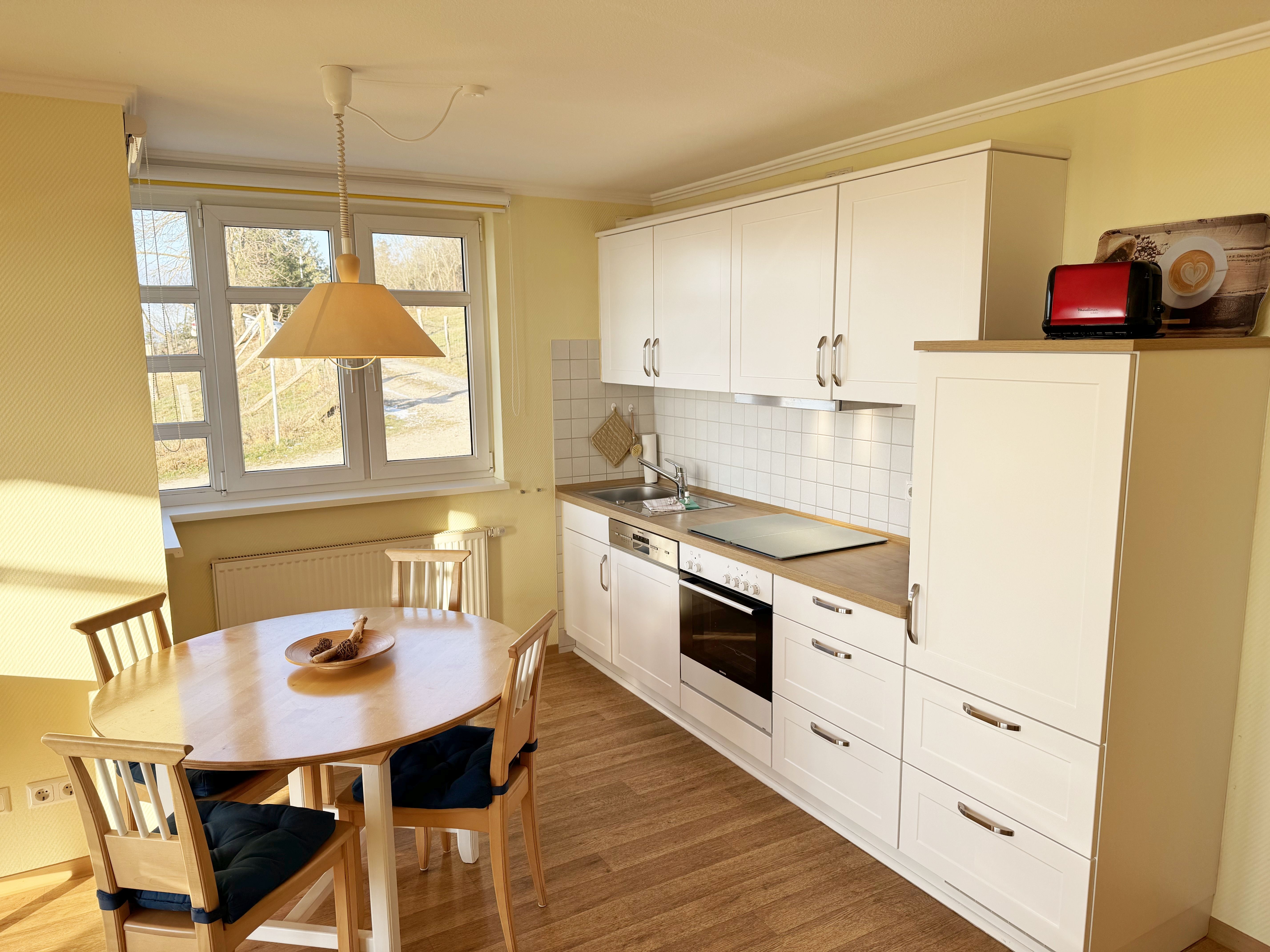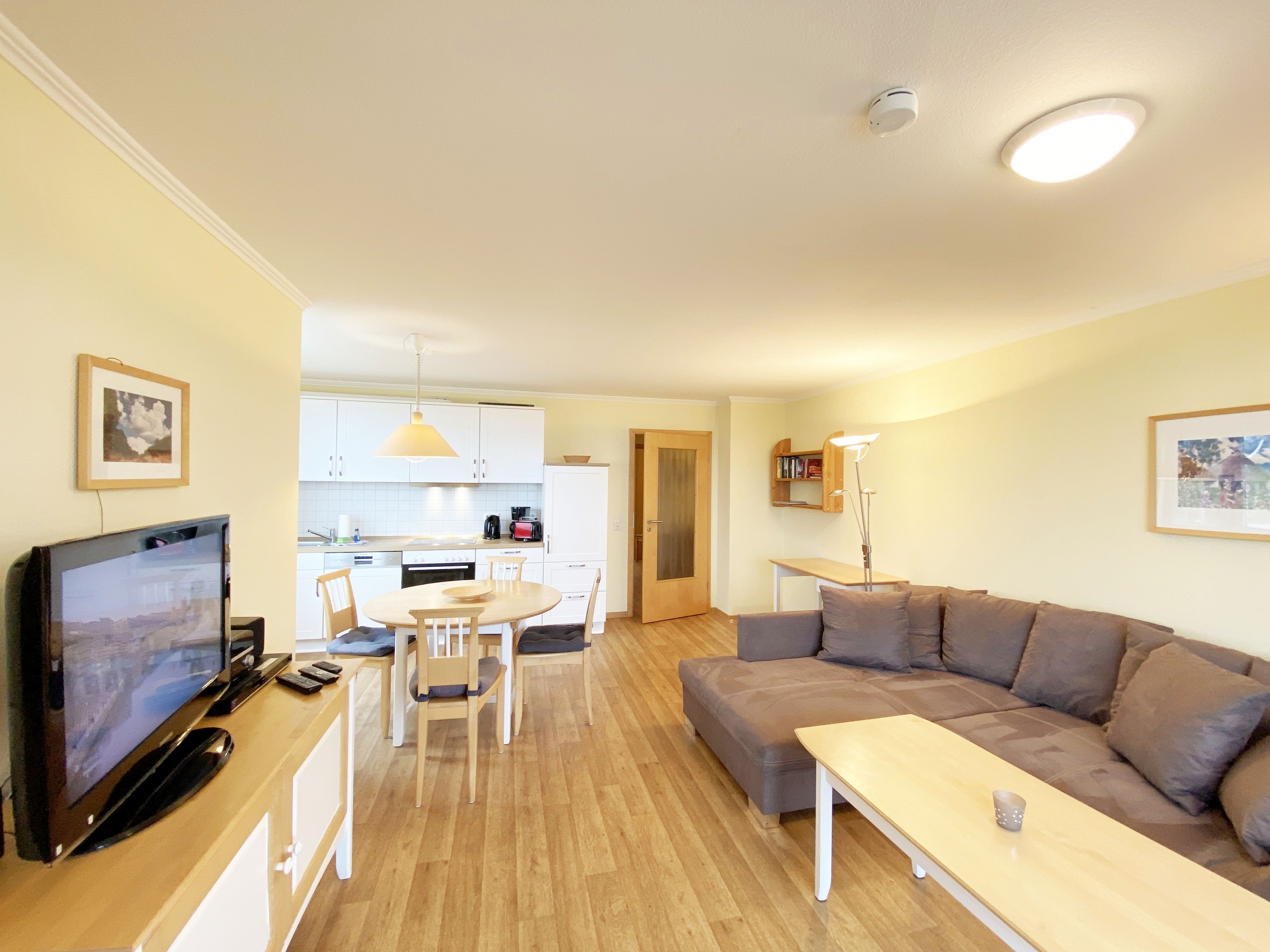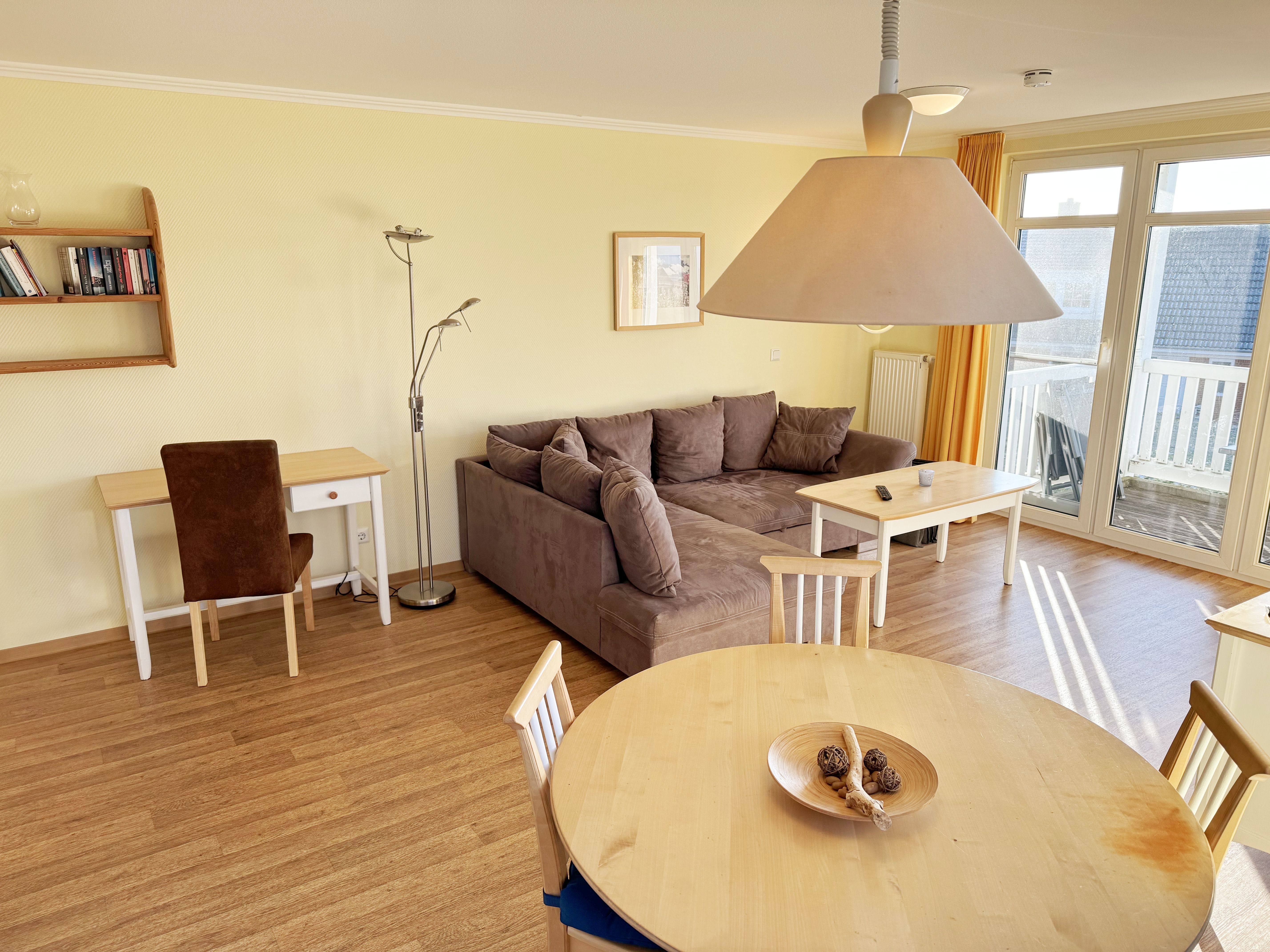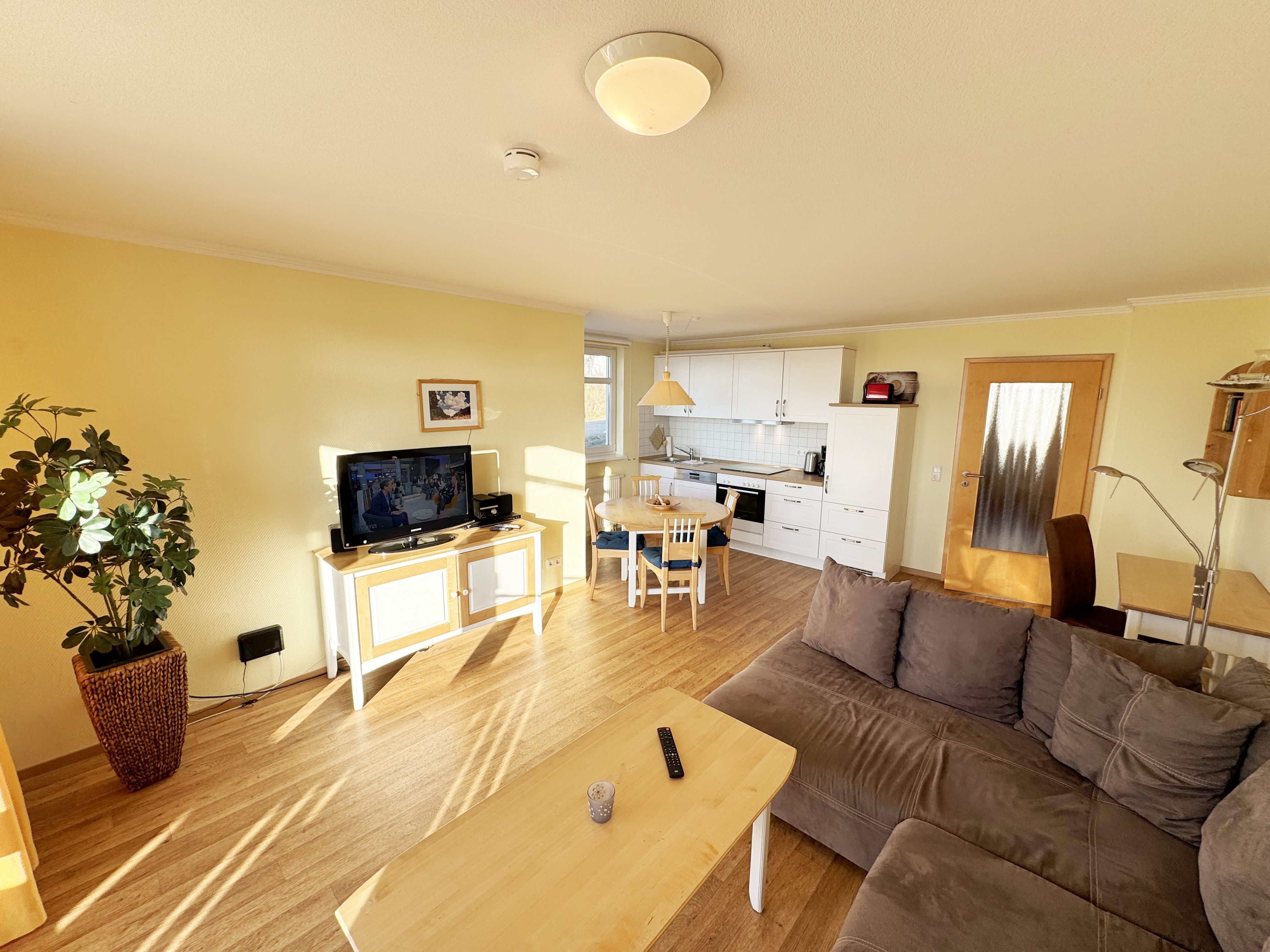 Unsere komfortable Nichtraucherwohnung von ca. 60 m² befindet sich in der 1. Etage und ist für max. 4 Erwachsene und 1 Kleinkind bis 3 Jahre im Kinderreisebett ausgelegt. Der Wohnbereich mit integrierter Küchenzeile und Essplatz ist großzügig ausgestattet. Die Küchenzeile verfügt unter anderem über einen Backofen, 4-Zonencerankochfeld, Kühlschrank mit Eisfach, Geschirrspüler, Kaffeemaschine, Wasserkocher, Toaster sowie diverse Küchenutensilien, die Ihnen beim Kochen keine Wünsche offen lassen. Der Essplatz besteht aus einem runden Holzesstisch mit 4 Stühlen. Ein Sideboard mit Flachbild-TV, DVD-Player, Ministereoanlage, Leselampe, Couch mit Couchtisch und einem Sessel runden den Wohnbereich ab. Das große Schlafzimmer verfügt über ein Doppelbett (2 x 0,90 m x 2,00 m) mit Nachttischkonsolen und Kleiderschrank. Das kleine Schlafzimmer ist ausgestattet mit einem französischem Bett, Nachttischablage sowie einem Kleiderschrank. Im Wohnbereich sowie im Schlafbereich befinden sich Insektenschutzgitter. Genießen Sie von Ihrem bestuhlten Balkon mit Ausrichtung (Süd/Südwest) den einmaligen Blick auf die Ostsee. Das Bad ist mit einem Waschtisch, Dusche, WC, Urinal, Kosmetikspiegel und Fön eingerichtet. Ein Fenster im Badbereich spendet Ihnen Tageslicht. Ein eigener PKW-Stellplatz Nr. 06 sowie eine Fahrradabstellmöglichkeit sind für Sie vorhanden. Ein WLAN-Zugang steht Ihnen inklusive zur Verfügung. Ein Kinderreisebett (ohne Matratze und Bett Inlett) und ein Hochstuhl können auf Anfrage gegen eine Gebühr für unsere kleinen Gäste gestellt werden. Waschmaschine und Trockner kann in einem separaten Raum genutzt werden. Die Erstausstattung eines Wäschepaketes (komplette Bettwäsche, 1 Duschhandtuch, 2 kleine Handtücher) können Sie bis 14 Tage vor Anreise gegen einen Aufpreis dazu buchen oder durch eigene ergänzen. Ab 2 gebuchten Paketen erhalten Sie einmalig 1 Geschirrhandtuch und 1 Duschvorleger dazu.