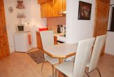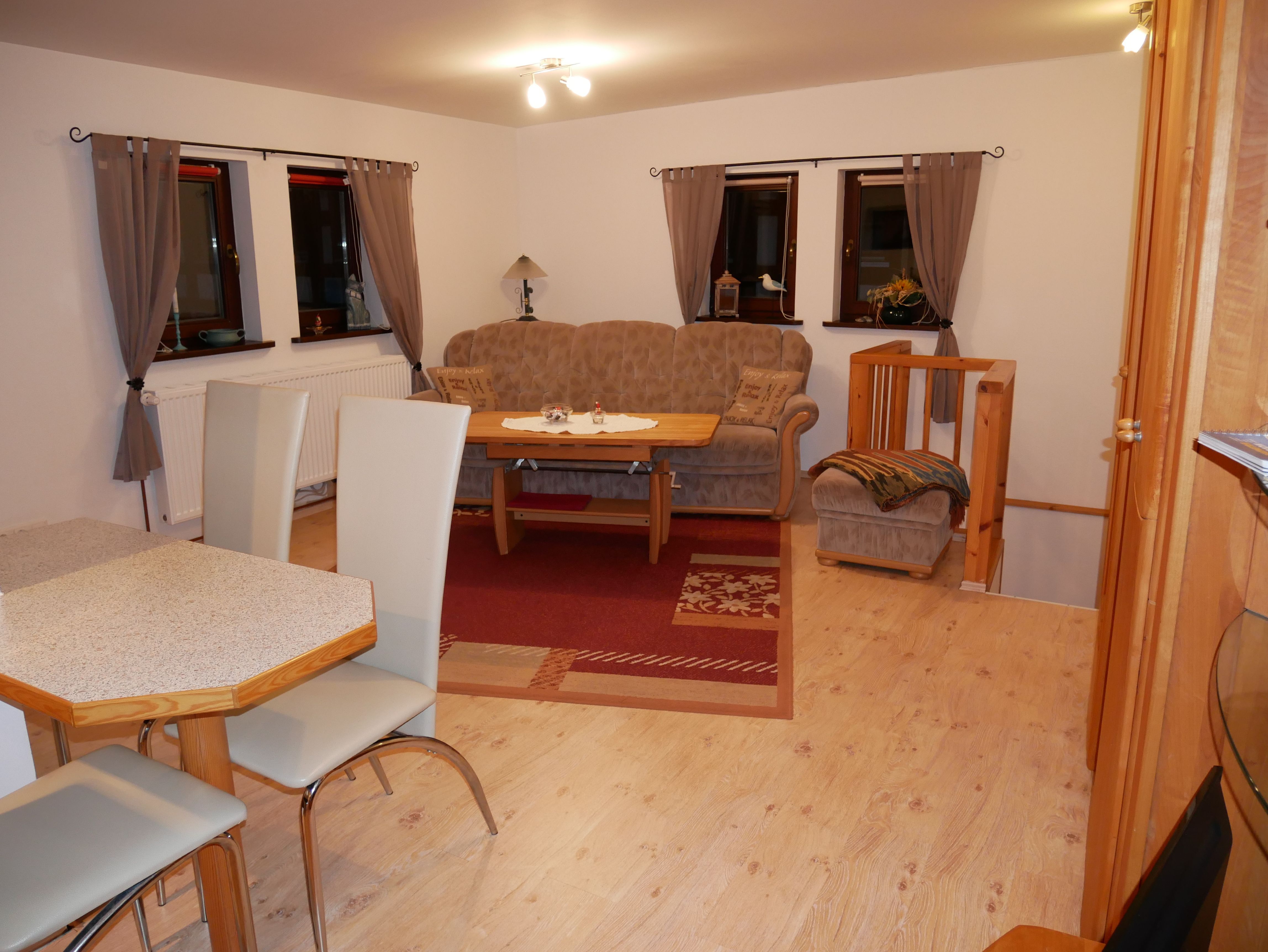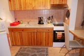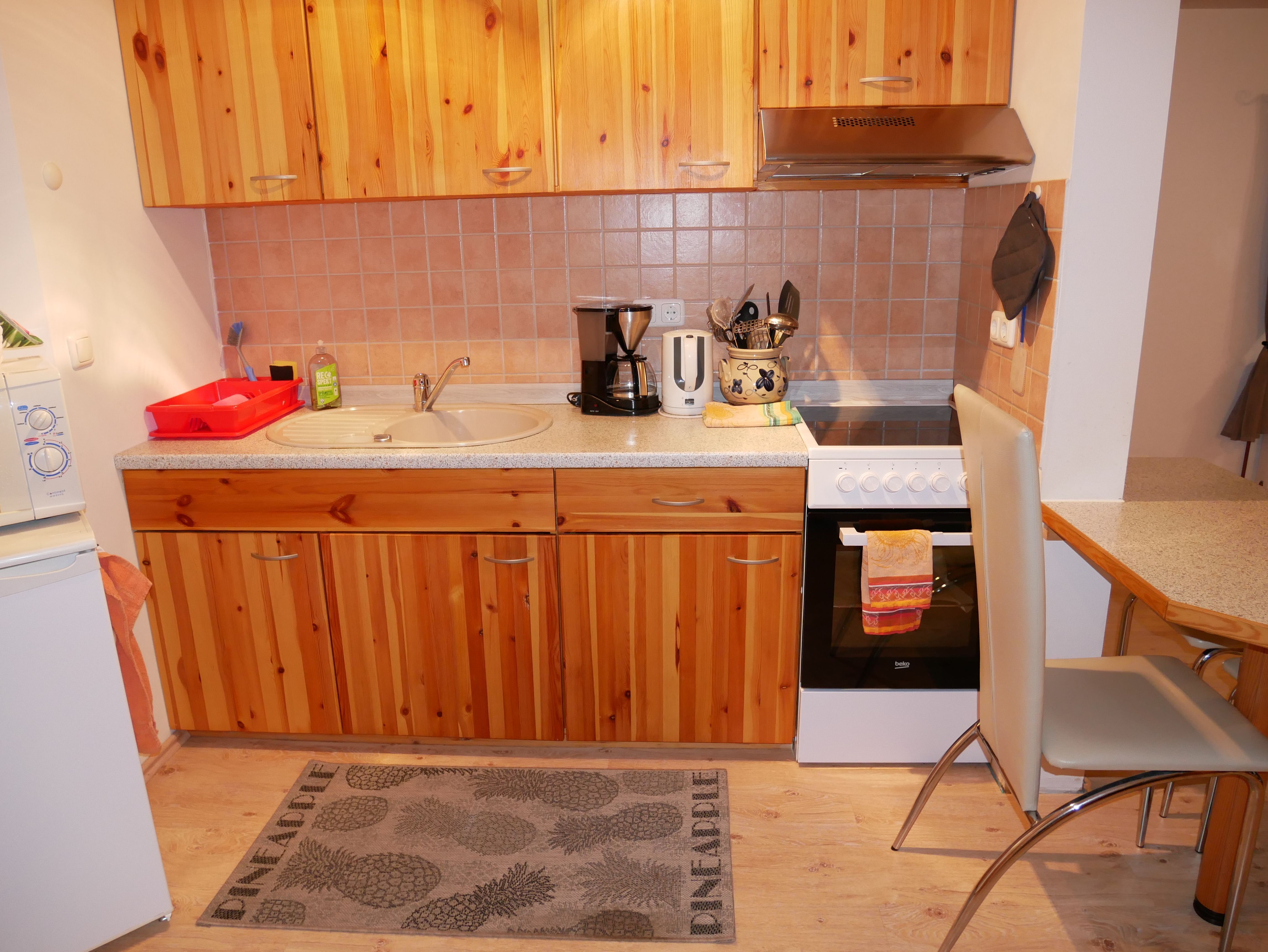 Das 40 qm große Ferienhaus erstreckt sich über 2 Etagen. In der oberen Etage befindet sich der offen gestaltete Wohnbereich mit Schlafsofa, Flachbild TV und Küchenzeile. Die Küchenzeile verfügt über ein 4 Platten-Herd mit Backofen, Kühlschrank, Wasserkocher, Toaster und Kaffeemaschine.