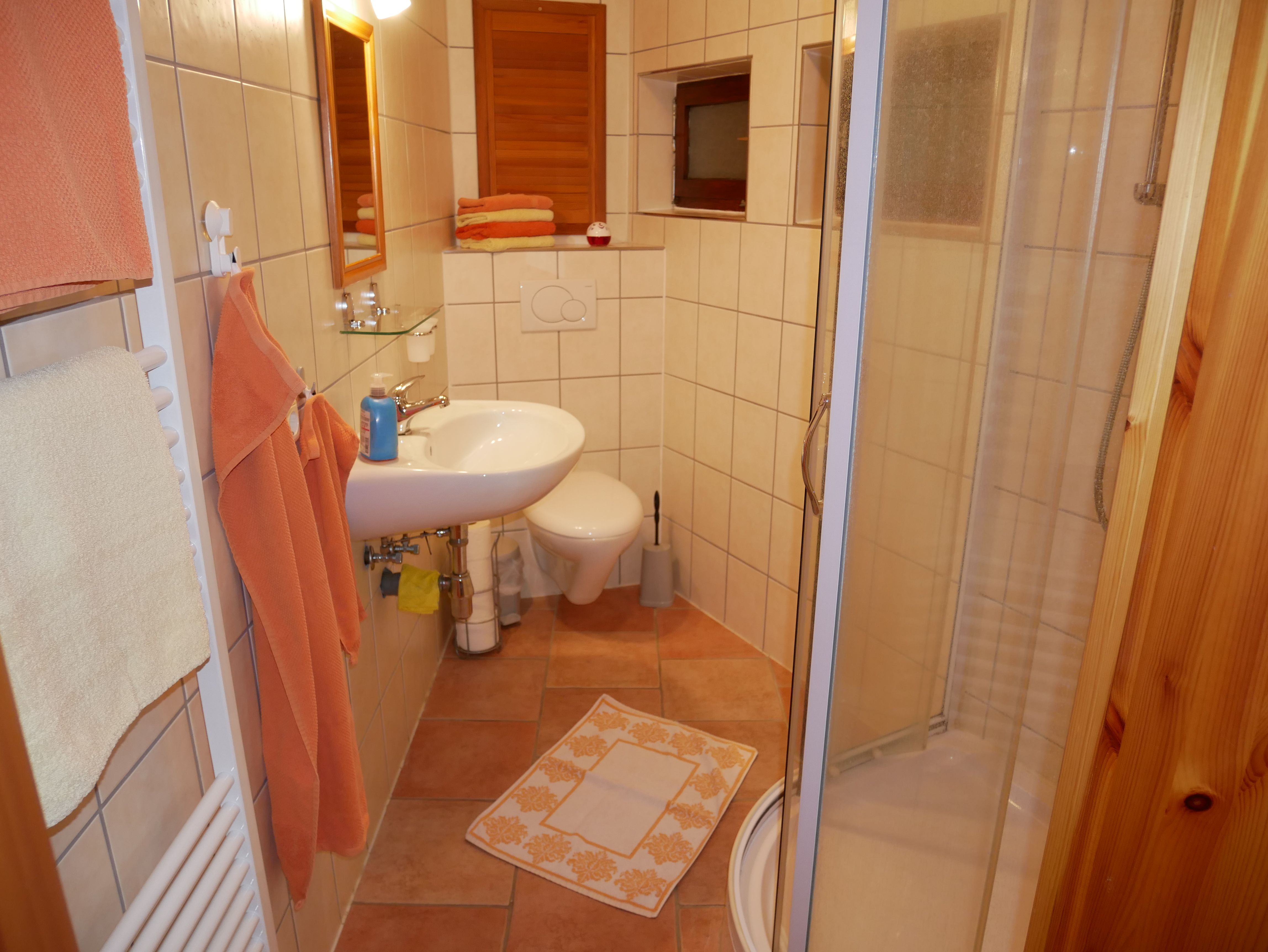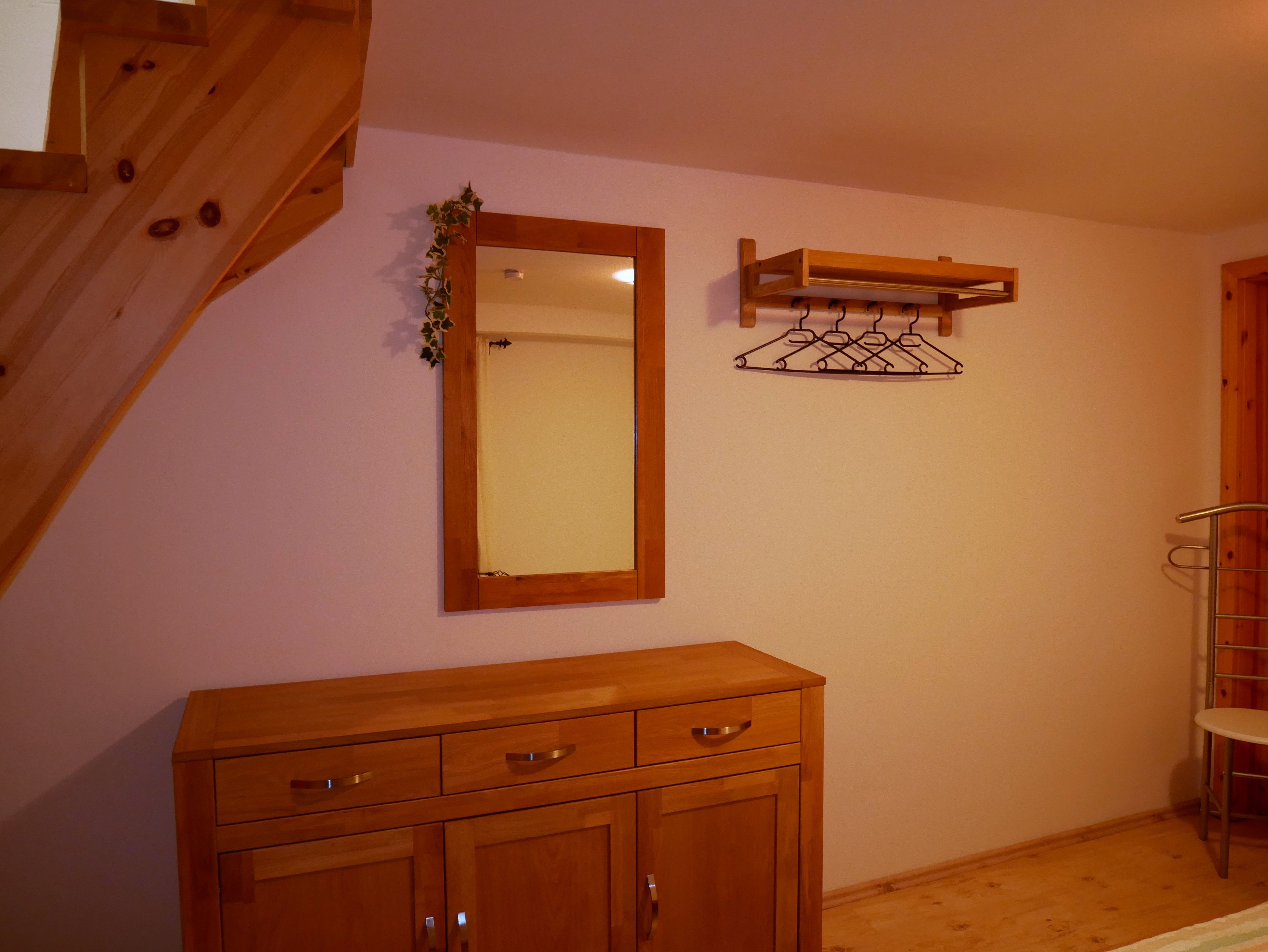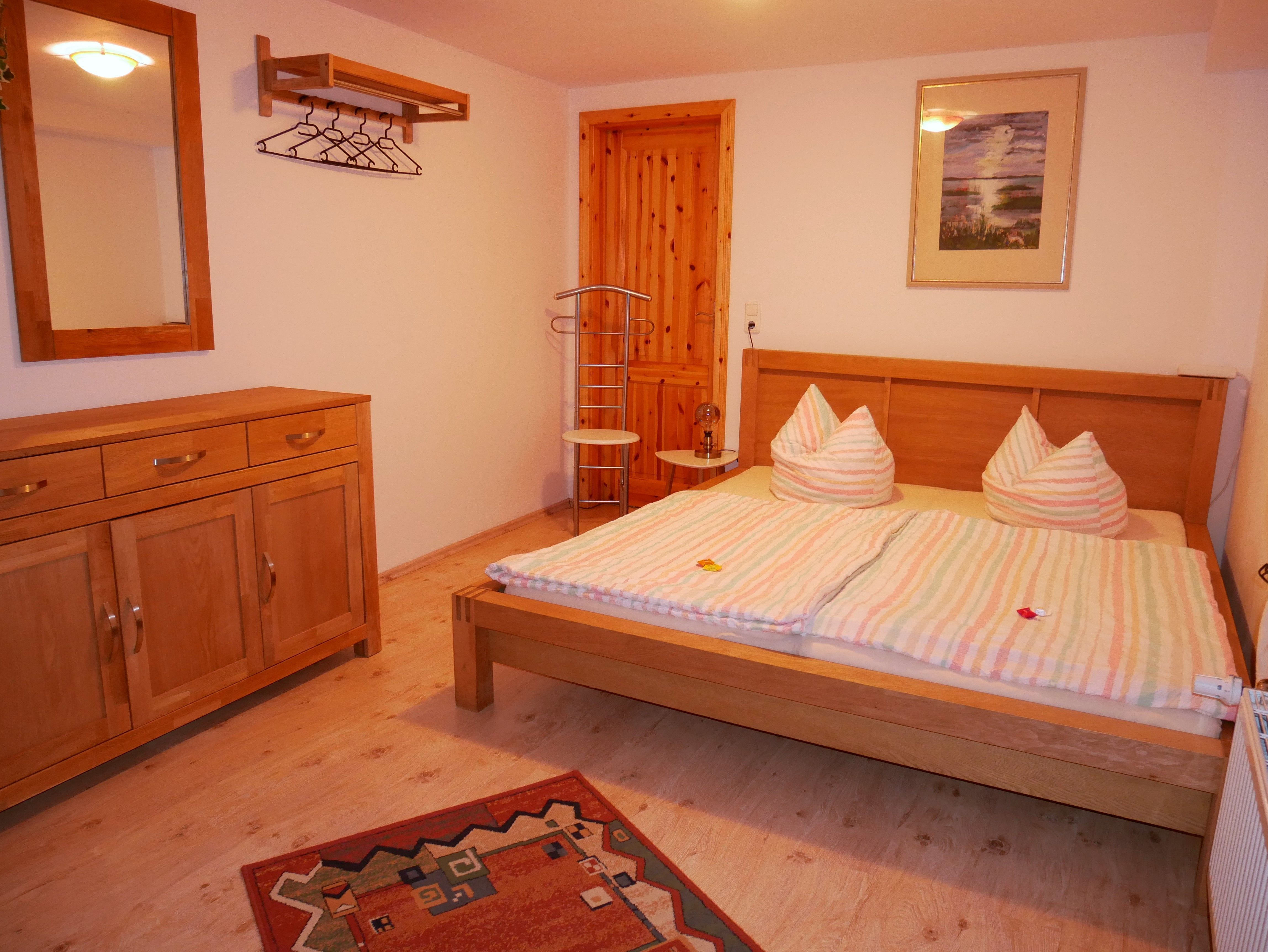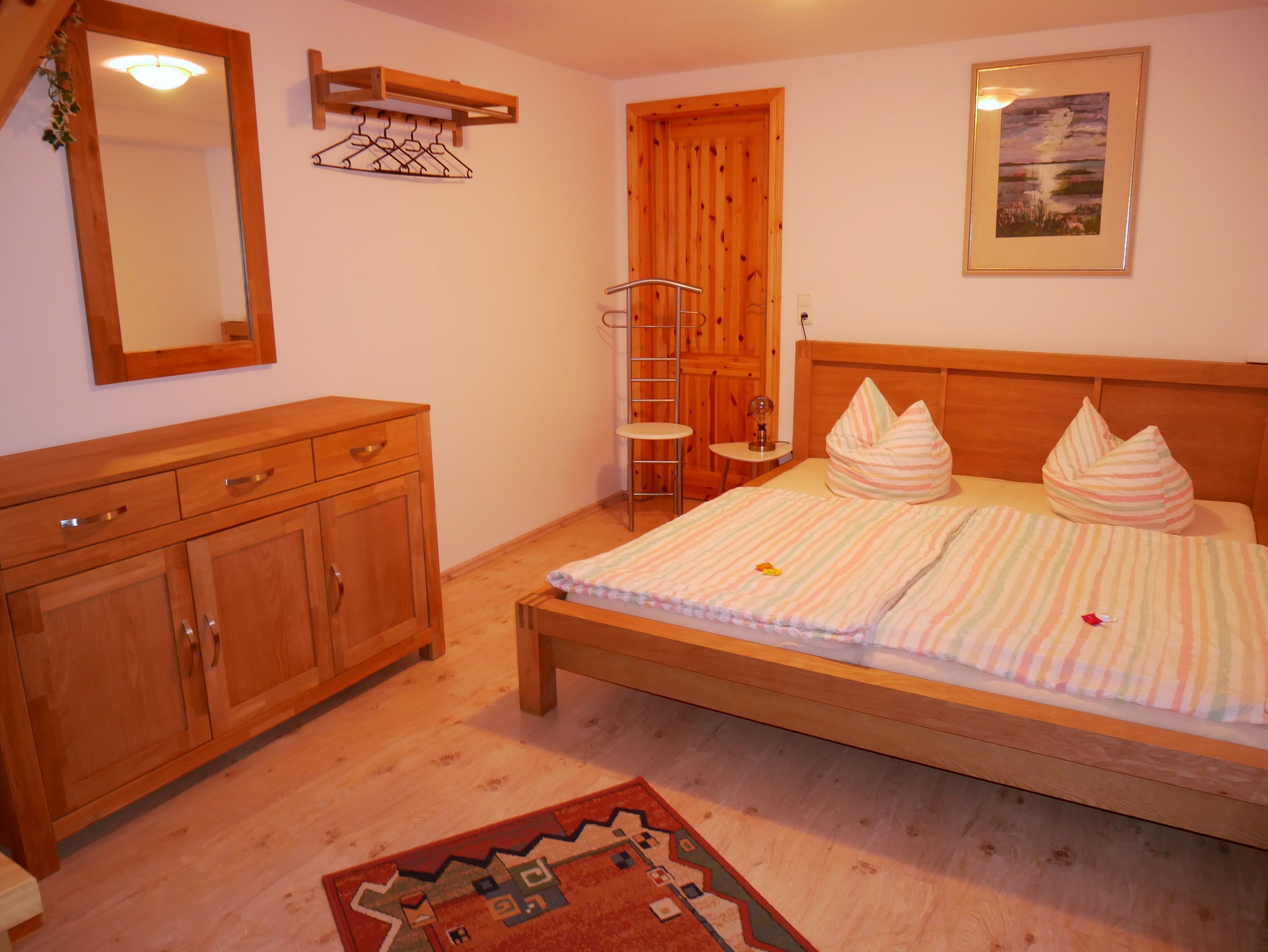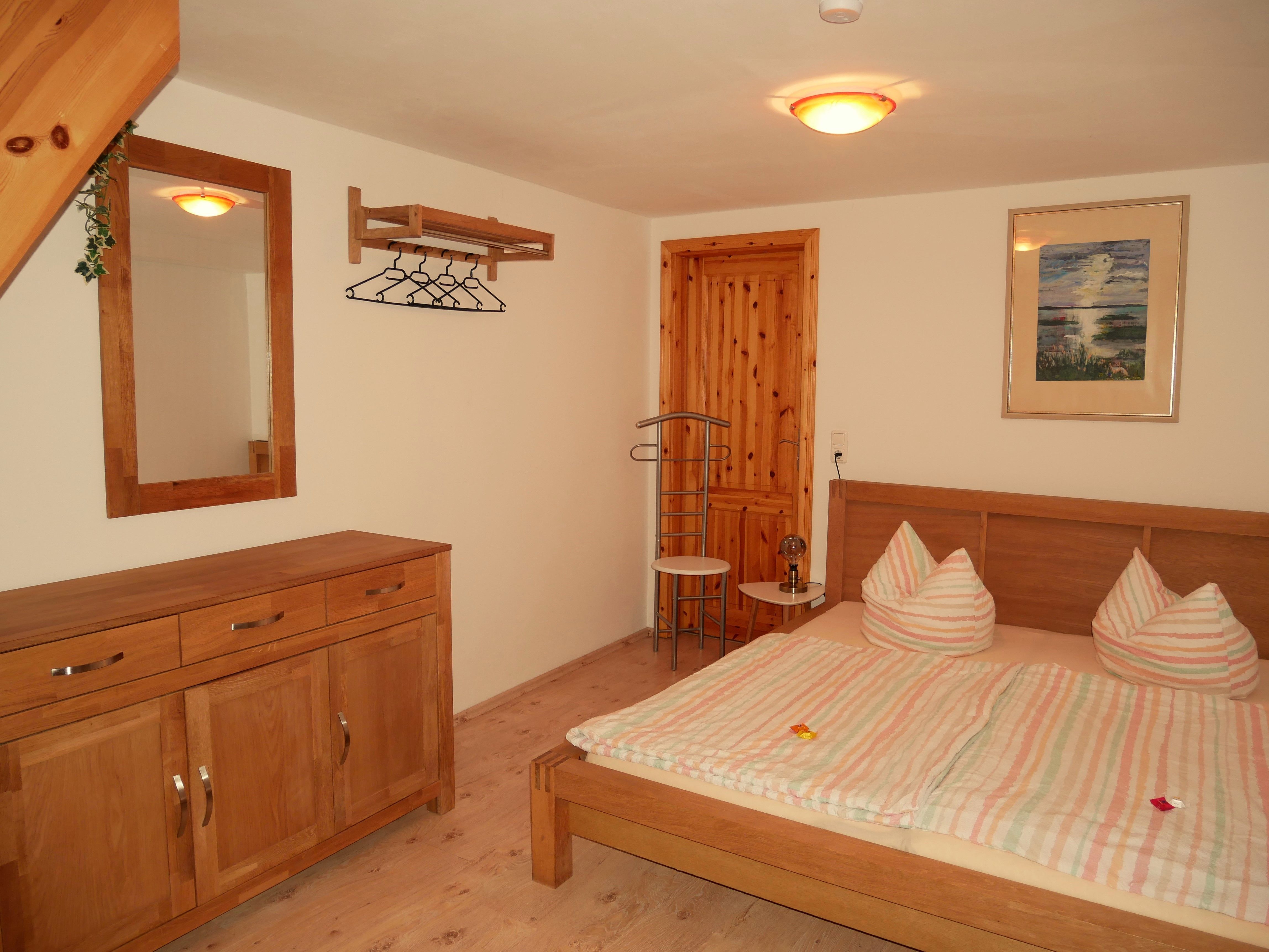 Über eine offene Treppe erreichen Sie die untere Ebene. Dort befindet Sich der Schlafbereich mit Doppelbett (1,80x2,00 Meter). Das Badezimmer ist mit Dusche, Waschbecken und WC ausgestattet.