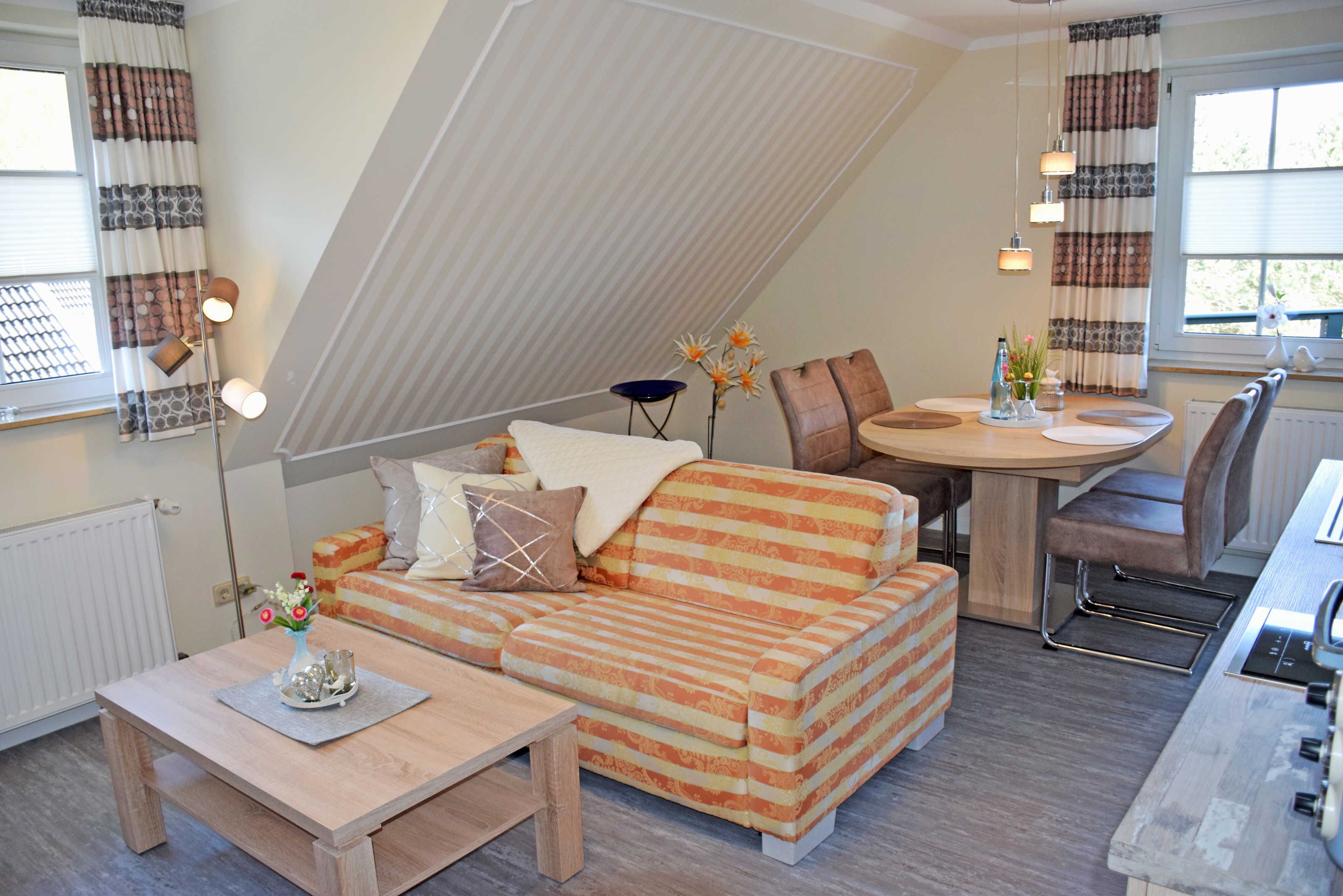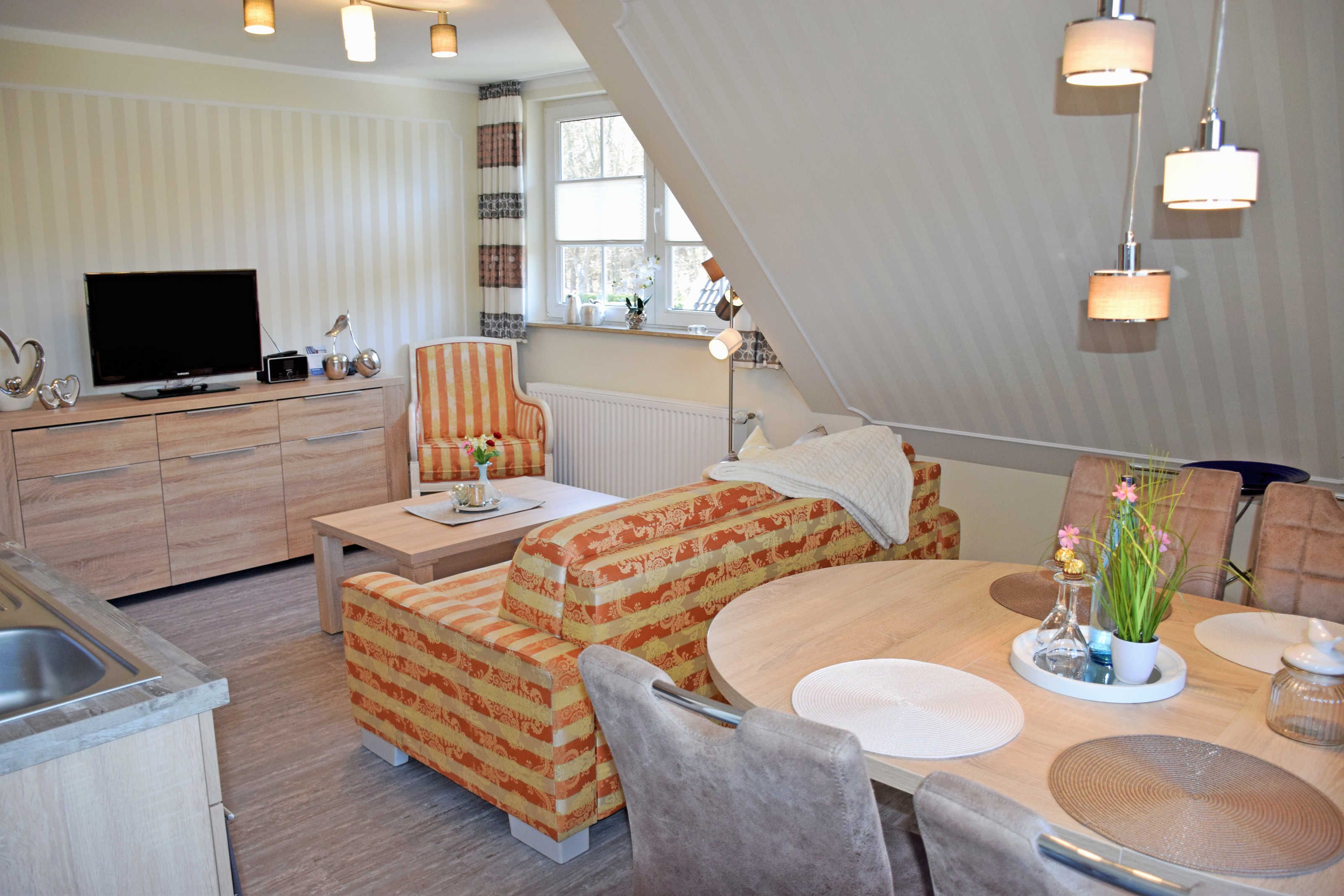 Unser moderne und liebevoll eingerichteten Ferienappartements am Granitzwald (ca. 48 qm, 1 Wohnzimmer, 1 Schlafzimmer; max. 3 Erw., mit WLAN - Anschluss) befinden sich im Obergeschoss eines 2000 neu erbauten Wohnhauses. Das Haus liegt sehr ruhig und naturnah direkt am Beginn der Garnitz mit herrlichen Misch- und Buchenwäldern. Bis zum kilometerlangen, feinsandigen Badestrand an der Ostsee sind es nur ca. 1.500 m.