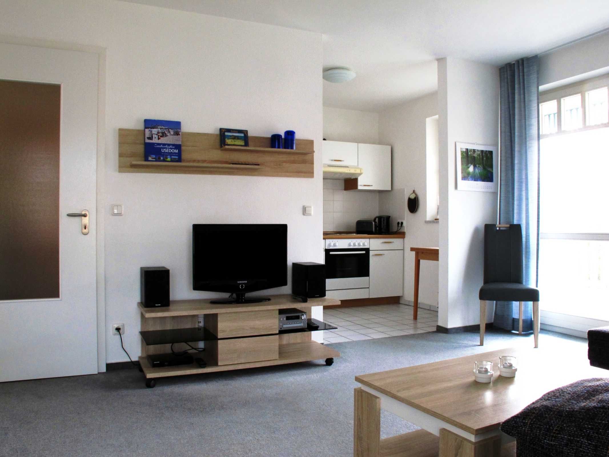 Sie verfügt über einen nach SW ausgerichteten möblierten Balkon sowie einen nach NW ausgerichteten Erker mit bodentiefen Fenstern. Die Wohnung befindet sich am Ortsrand von Koserow.