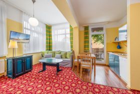 2-3 Pers.: Studio mit 35 qm Wohnfläche, 1. Etage/kein Fahrstuhl. Wohn-/Schlafraum mit Esstisch, Pantry-Küche (2 P. E-Herd, Spülmaschine, Minibackofen, Kaffeemaschine, Wasserkocher, 6-Set-Ess-Geschirr und Besteck, kleine Auswahl an Gläsern, kleine Topfsammlung, ein paar kleine Küchenhelfer --- Grundausstattung!!!), Doppelbett, Couchgarnitur (1 Pers.). Bad/WC. Balkon mit Sitzmöbeln.