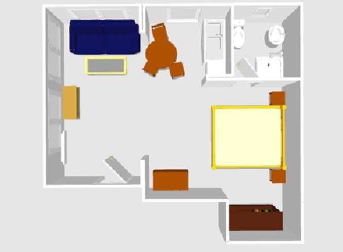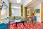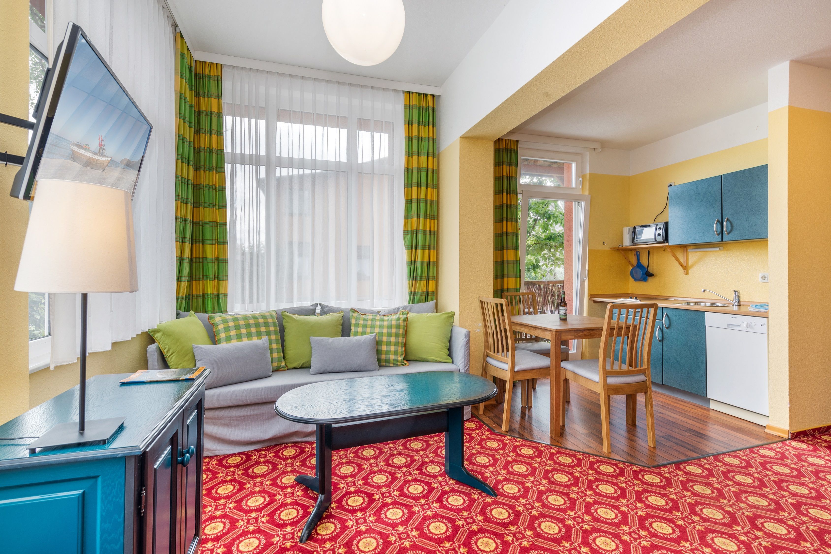 Im kombinierten Wohn-/Schlafraum befinden sich ein bequemes Doppelbett mit Nachttischen und Leselampen sowie ein Kleiderschrank, eine Schlafcouch mit Tisch und ein TV-Gerät. Hier steht auch ein Esstisch mit Stühlen.
