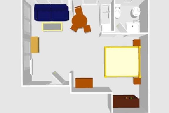 2-3 Pers.: Studio mit 35 m² Wohnfläche, Parterre. Wohn-/Schlafraum mit Esstisch, Pantry-Küche (2 P. E-Herd, Spülmaschine, Minibackofen, Kaffeemaschine, Wasserkocher, 6-Set-Ess-Geschirr und Besteck, kleine Auswahl an Gläsern, kleine Topfsammlung, ein paar kleine Küchenhelfer --- Grundausstattung!!!), Doppelbett, Couchgarnitur (weitere Schlafmöglichkeit 1 Pers.). Bad/WC. Terrasse mit Sitzmöbeln.