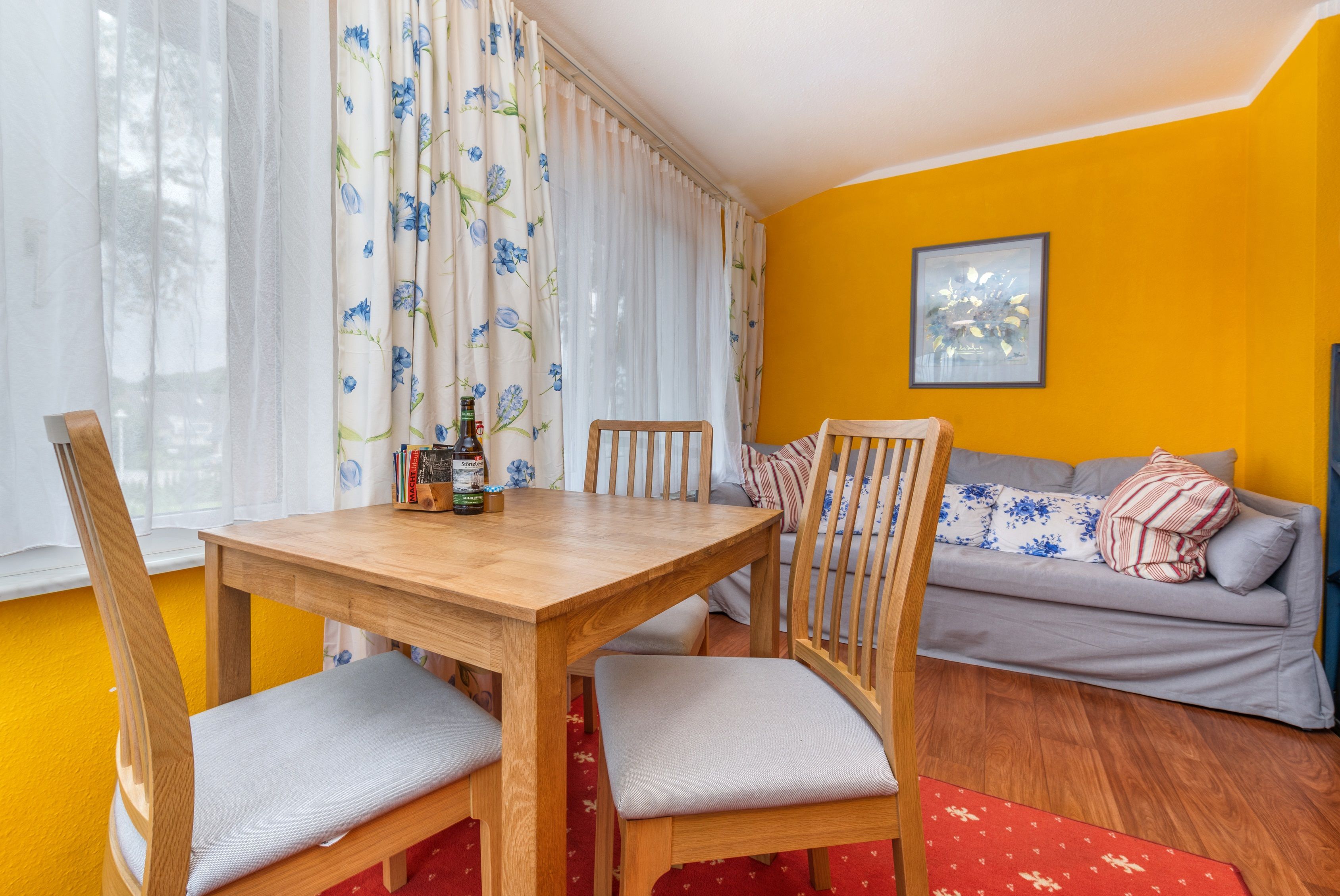 2-3 Pers.: Studio mit 30 qm Wohnfläche, 1. Stock. Wohn-/Schlafraum mit Esstisch, Mini-Küche (2 P. E-Herd, Minibackofen, Kaffeemaschine, Wasserkocher, 6-Set-Ess-Geschirr und Besteck, kleine Auswahl an Gläsern, kleine Topfsammlung, ein paar kleine Küchenhelfer --- Grundausstattung!!!), zwei getrennte Betten (1x 200 cm lang, 1x 180 cm), Couchgarnitur (weitere Schlafmöglichkeit 1 Pers.). Bad/WC.
