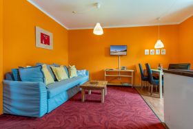 Im kombinierten Wohn-/Küchenbereich befinden sich ein Schlafsofa, welches ausgeklappt Platz für 2 Erwachsene bietet, ein Tisch und ein TV-Gerät. Hier steht auch ein Esstisch mit 4 Stühlen.