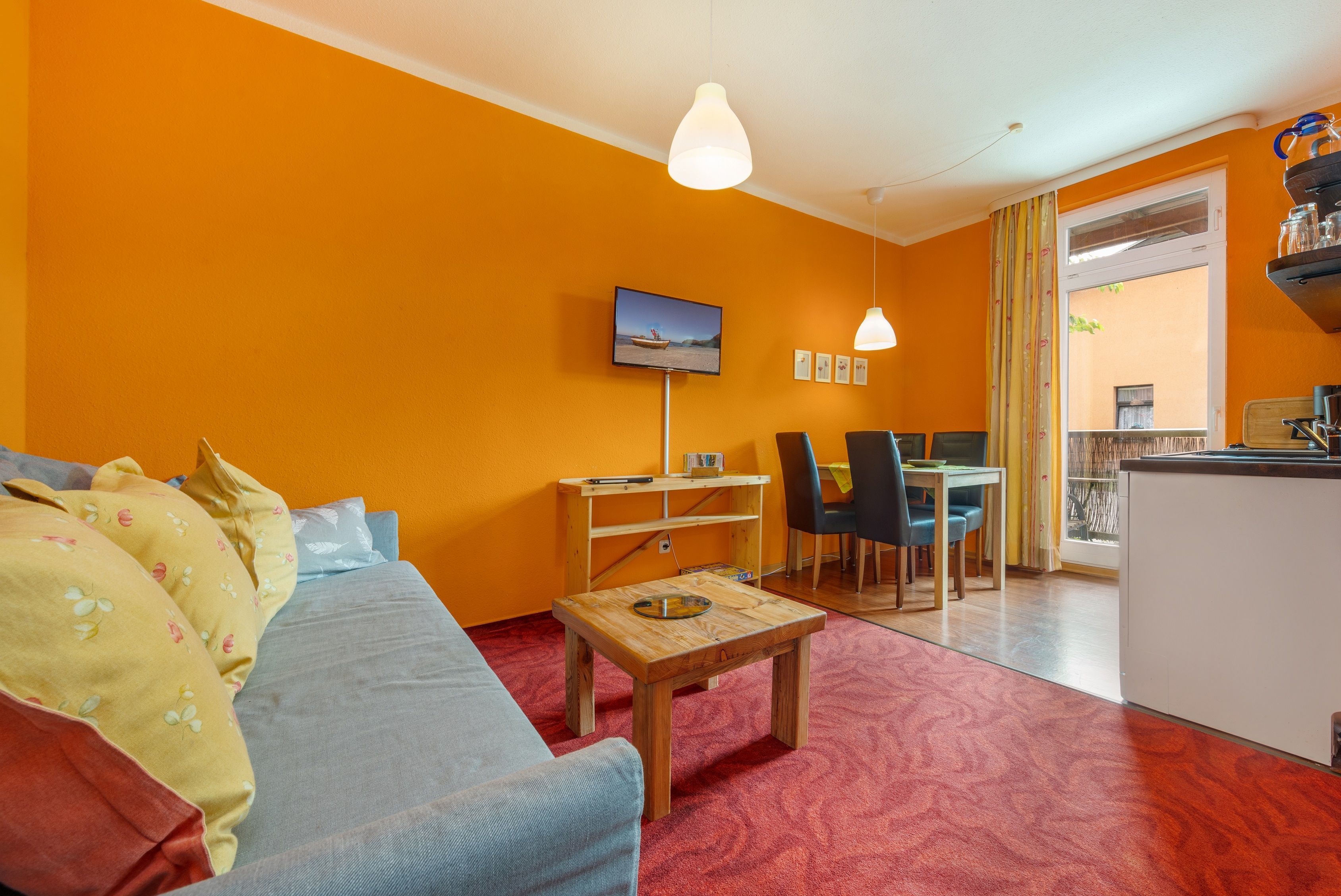 2-4 Pers.: 2-Zimmer-Wohnung mit 37 qm Wohnfläche, Parterre. Wohn-/Essraum mit Couchgarnitur (Ausziehcouch 2 Pers.), Esstisch, Küchenzeile (2 P. E-Herd, Spülmaschine, Minibackofen, Kaffeemaschine, Wasserkocher, 6-Set-Ess-Geschirr und Besteck, kleine Auswahl an Gläsern, kleine Topfsammlung, ein paar kleine Küchenhelfer --- Grundausstattung!!!)). Doppelbett, Couchgarnitur (Ausziehcouch 2 Personen), Bad/WC. Balkon mit Sitzmöbeln.