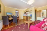 Im kombinierten Wohn-/Küchenbereich befinden sich ein Schlafsofa, welches ausgeklappt Platz für 2 Erwachsene bietet, ein Tisch und ein TV-Gerät. Hier steht auch ein Esstisch mit 4 Stühlen.