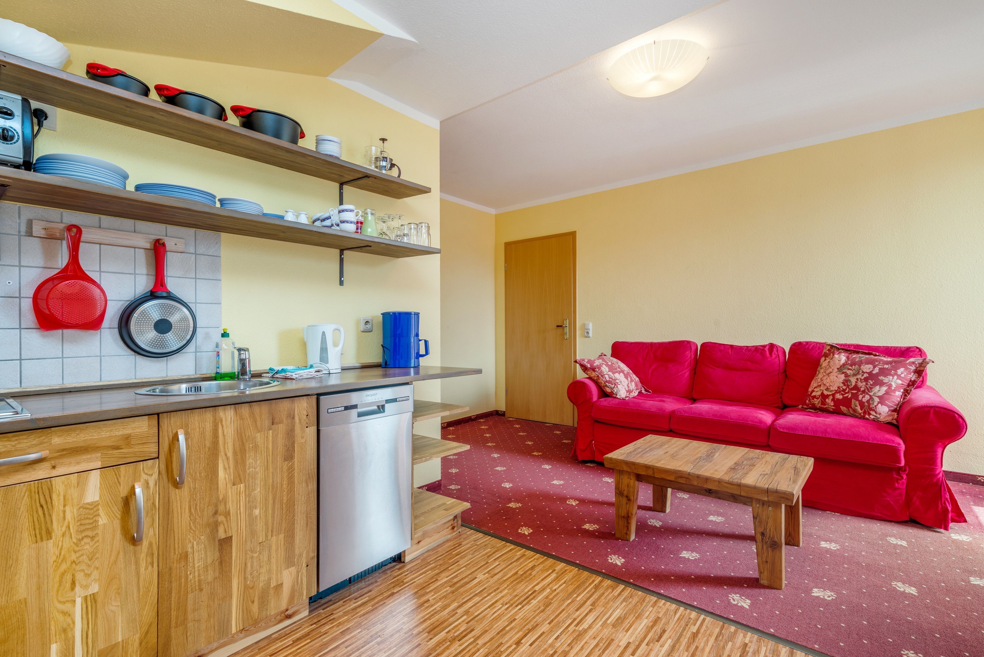Die Küchenzeile ist mit einem 2-Plattenherd, Geschirrspüler, Wasserkocher, Kaffeemaschine, Minibackofen und Kühlschrank komplett ausgestattet. Es sind Geschirr und Besteck, Töpfe, Schlüsseln vorhanden. Anstatt von Hängeschränken, wurden Regale verbaut.