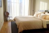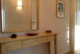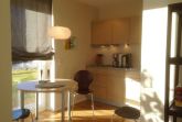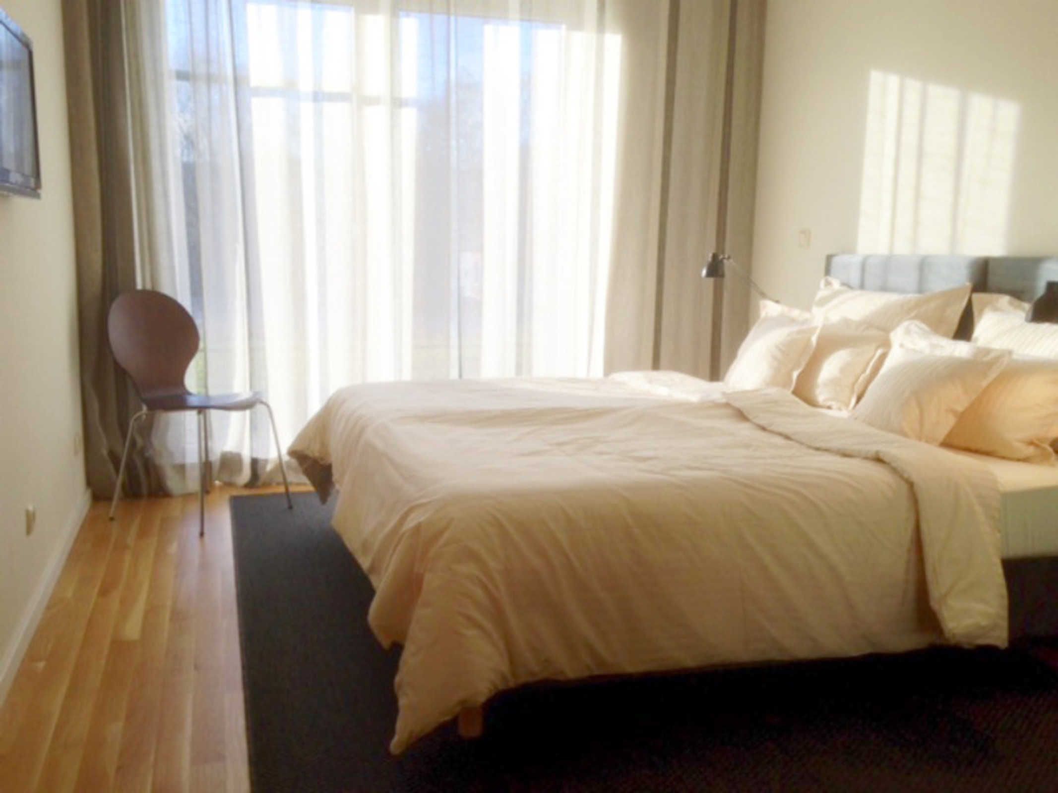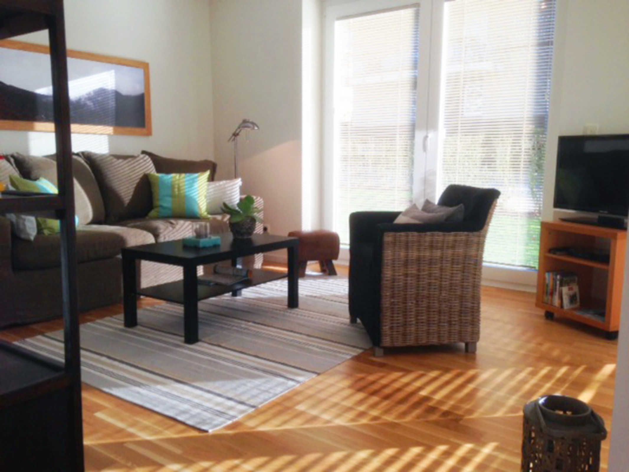 Die lichtdurchflutete Erdgeschoss-Wohnung mit Eichenparkett verfügt über einen angenehmen Grundriss mit Eingangsbereich, ein geräumiges Schlafzimmer mit Boxspring-Betten und elektr. Rolläden, ein Badezimmer mit bodengleicher Dusche, eine offene Küche mit Essplatz für max. 4 Personen und ein Wohnzimmer (inkl. Schlafsofa für eine 3. bis 4. Person) mit großen Flügeltüren zur möblierten Terrasse.