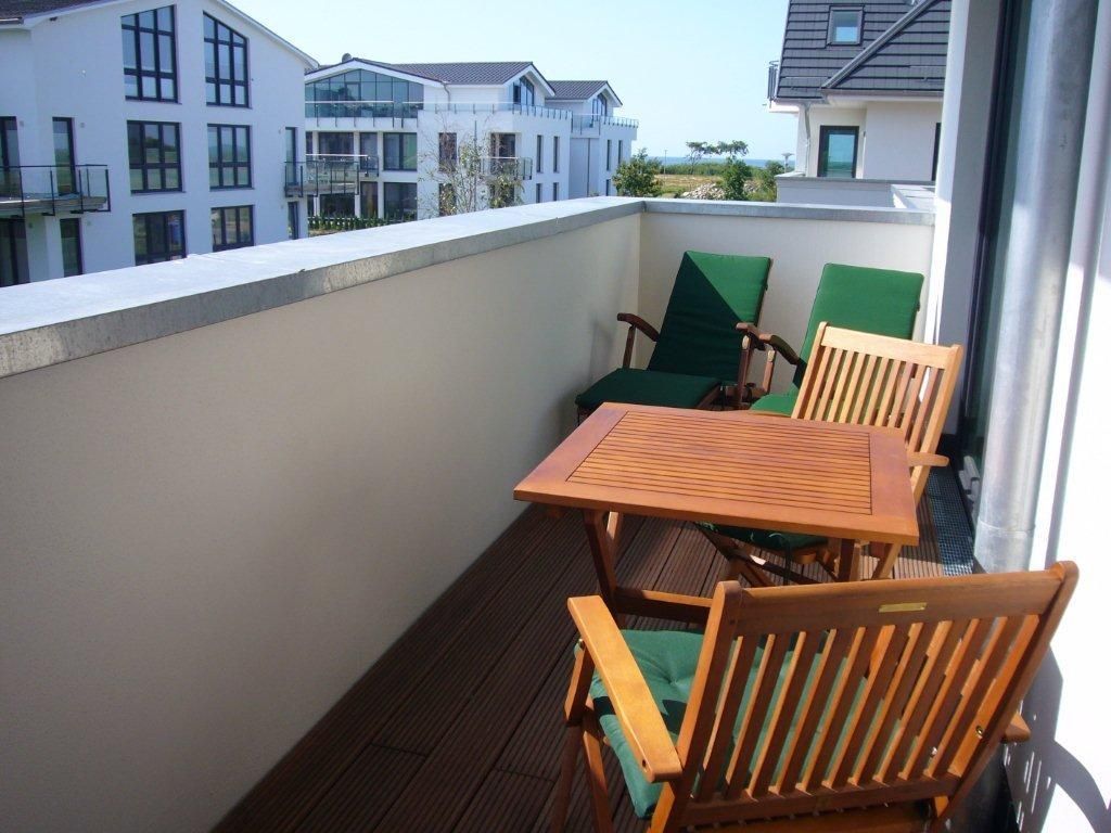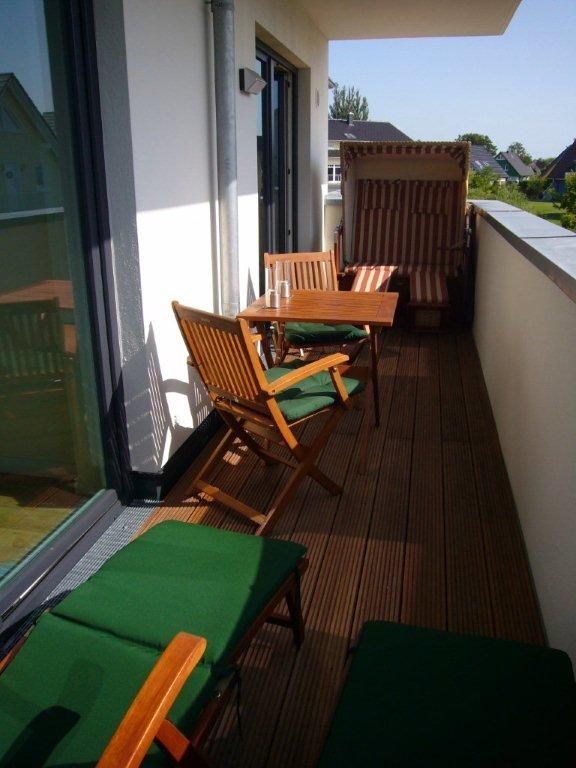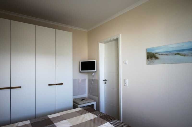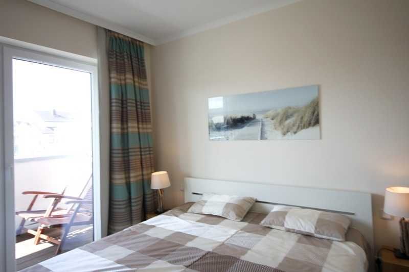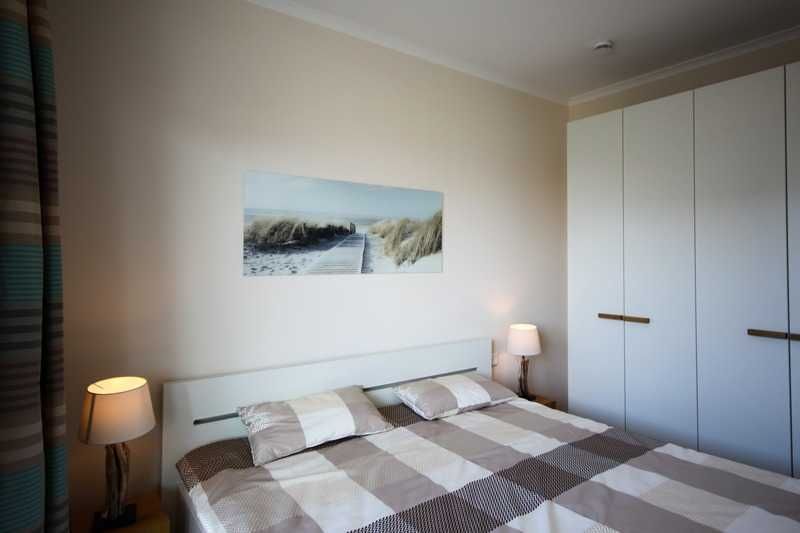 Im Schlafzimmer finden Sie ein komfortables Doppelbett, einen geräumigen Kleiderschrank und ein Flatscreen-TV an der Wand. Das moderne Bad hat eine bodengleiche Dusche und einen Waschtisch mit großem Spiegel. Auf dem nach Westen ausgerichteten großzügigen Balkon können Sie im Strandkorb und in den Deckchairs sonnenbaden sowie am Tisch auf einem der beiden Stühle Platz entspannen.