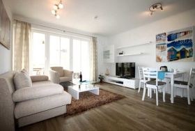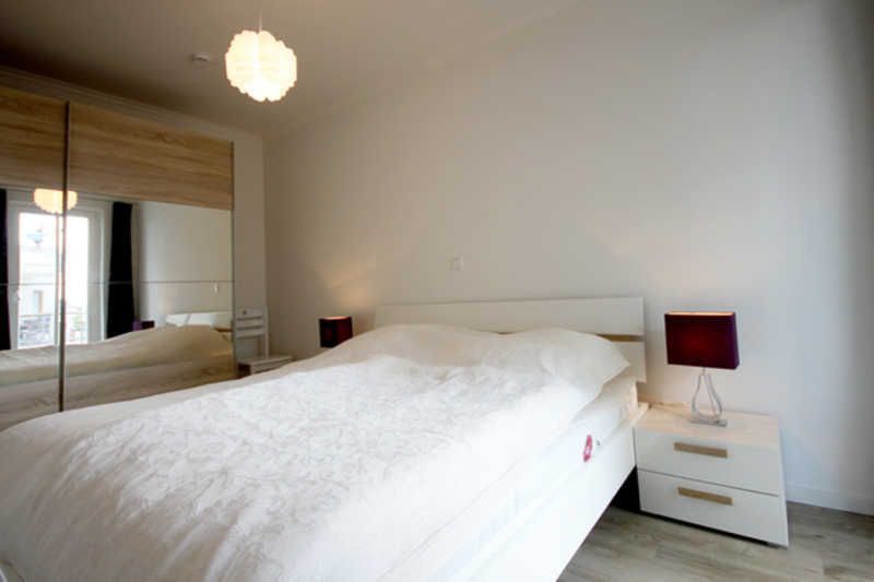 Der Wohn-/Essbereich ist mit einer bequemen Schlafcouch, einem Sessel sowie einem großen Flachbild-TV, einer Stereoanlage und einem Blu-ray-Player ausgestattet. In der offenen Küche finden Sie einen Herd mit Cerankochfeld, Backofen, Geschirrspüler, Kühlschrank mit Gefrierfach, Toaster, Wasserkocher und eine Filterkaffeemaschine sowie weiteres Kochzubehör. Hier lädt auch ein hölzerner Esstisch zu gemeinsamen Mahlzeiten ein. Im angrenzenden modernen Bad finden Sie eine bodengleiche Dusche, einen Waschtisch mit Spiegel, Föhn und einen Handtuchtrockner vor. Ein Doppelbett empfängt Sie im Schlafzimmer. Das Bett hat eine durchgehende Matratze. Hier befindet sich auch ein zweites Fernsehgerät und ein großzügiger Kleiderschrank. Von diesem Raum und auch vom Wohnbereich aus, können Sie den Balkon betreten, der nach Süd-Ost ausgerichtet ist. Ein maritimer Strandkorb sowie ein Tisch mit vier Balkonstühlen, sorgen für Entspannung. Sämtliche Räume der Unterkunft sind mit einer Fußbodenheizung ausgestattet worden. Zu Ihrer Ferienwohnung gehört ein kostenfreier Tiefgaragenstellplatz. Bitte beachten Sie die Durchfahrtshöhe von max. 1,90m. Bei Überschreitung der maximalen Durchfahrtshöhe ihres Fahrzeugs, besteht die Möglichkeit auf einen kostenpflichtigen Parkplatz in unmittelbarer Nähe auszuweichen. Zudem befindet sich in der Tiefgarage eine Abstellmöglichkeit für Ihre Fahrräder. Hier noch einige Hinweise: Es handelt sich um eine Nichtraucherwohnung. Ein kleiner Hund bis 10 kg darf mit Ihnen anreisen wird aber gesondert berechnet. Das kostenfreie WLAN in der Unterkunft ist ausschließlich für die Verwendung von Social Media und den Austausch von Bildern mit Familie und Freunden gedacht. Die Nutzung zum Streamen von Filmen ist nicht vorgesehen. Wäschesets, Kinderreisebett und Kinderhochstuhl können kostenpflichtig zugebucht werden. Eine Waschmaschine und ein Trockner stehen im separaten Hauswirtschaftsraum im Untergeschoss der Villa zu Ihrer Verfügung (gegen Gebühr). Der im Gebäude installierte Aufzug erleichtert den Transport der mitgebrachten Koffer aus der Tiefgarage in Ihr Feriendomizil. Sichern Sie sich einen der begehrten Strandkörbe nur ein paar Meter entfernt von den rauschenden Wellen der Ostsee (Anfang Mai - Ende August) und buchen Sie Ihn jetzt zu besonderen Konditionen (12,00 € pro Tag oder 75,00 € pro Woche).