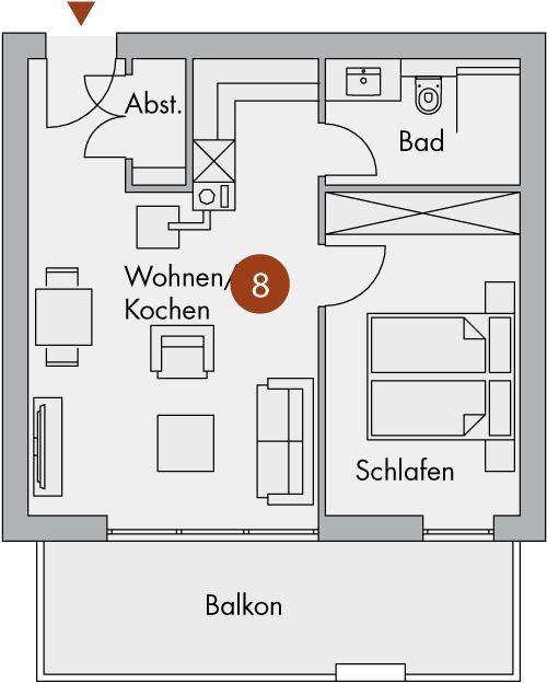 Strandnahe komfortable 2-Raumwohnung für 3 Personen mit großem Balkon im 1. OG.