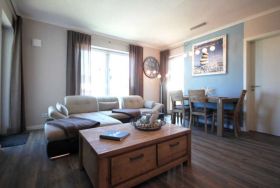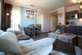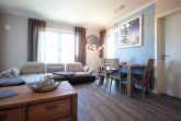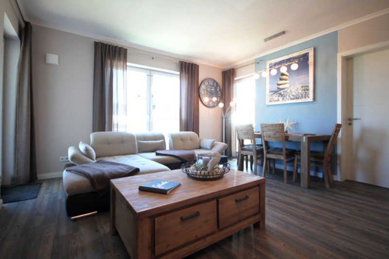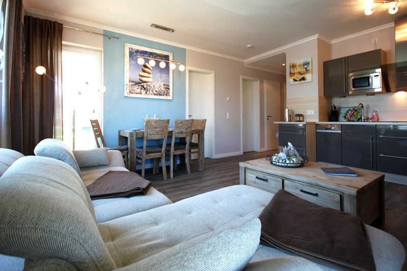 Im Wohnraum bietet sich die große, L-förmige Couch zum Relaxen an. Zur Unterhaltung stehen Ihnen ein großer TV-Flachbildschirm und ein DVD-Player zur Verfügung. Ein großer Holztisch kann nicht nur für gemeinsame Mahlzeiten sondern auch für gemeinsame Spieleabende genutzt werden. An allen Fenstern sind Sicht-und Sonnenschutzplissees angebracht, im Wohnraum sind zusätzlich Übergardinen. Im offenen Küchenbereich befinden sich ein Geschirrspüler, ein Kühlschrank mit Gefrierfach, ein Backofen mit Cerankochfeld, eine Mikrowelle, eine Kaffeemaschine, ein Senseo Kapselautomat sowie die nötigen Kochutensilien.