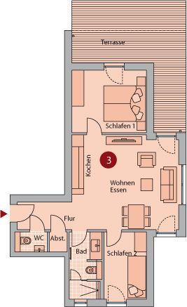 Die Wohnung befindet sich im Erdgeschoss der Residenz am Meer und verfügt über eine große, nach Nordosten ausgerichtete Terrasse. Diese ist mit einem Rattan-Tisch, vier Rattan-Stühlen und einem Loungesessel ausgestattet und kann über den Wohnbereich betreten werden.