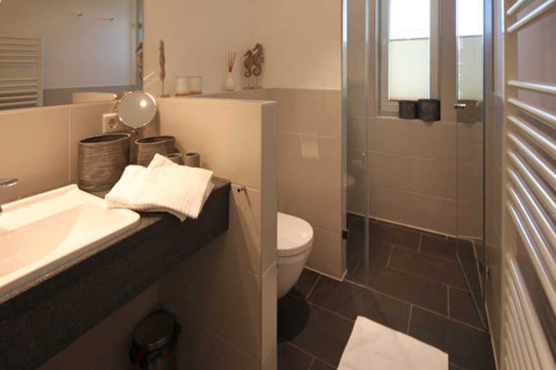 Das Duschbad besticht mit einer bodengleichen Dusche und einem großen Waschtisch mit einem entsprechendem Spiegel über die ganze Breite des Waschtischs. Zur Wohnung gehören auch ein separetes Gäste-WC und ein Abstellraum. Eine Waschmaschine und ein Trockner stehen im separaten Hauswirtschaftsraum im Erdgeschoss des Objekts zur Verfügung (gegen Gebühr / 1,00 € Münzen).