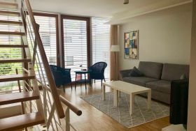 Die über drei Etagen offene, ca. 70 qm große, Maisonette-Wohnung lädt zum lichtdurchfluteten, modernen Wohnen ein. Von der Dachterrasse mit Strandkorb und Gartenmöbeln genießen Sie Meerblick hinweg über die Dächer Heringsdorfs.